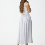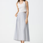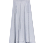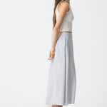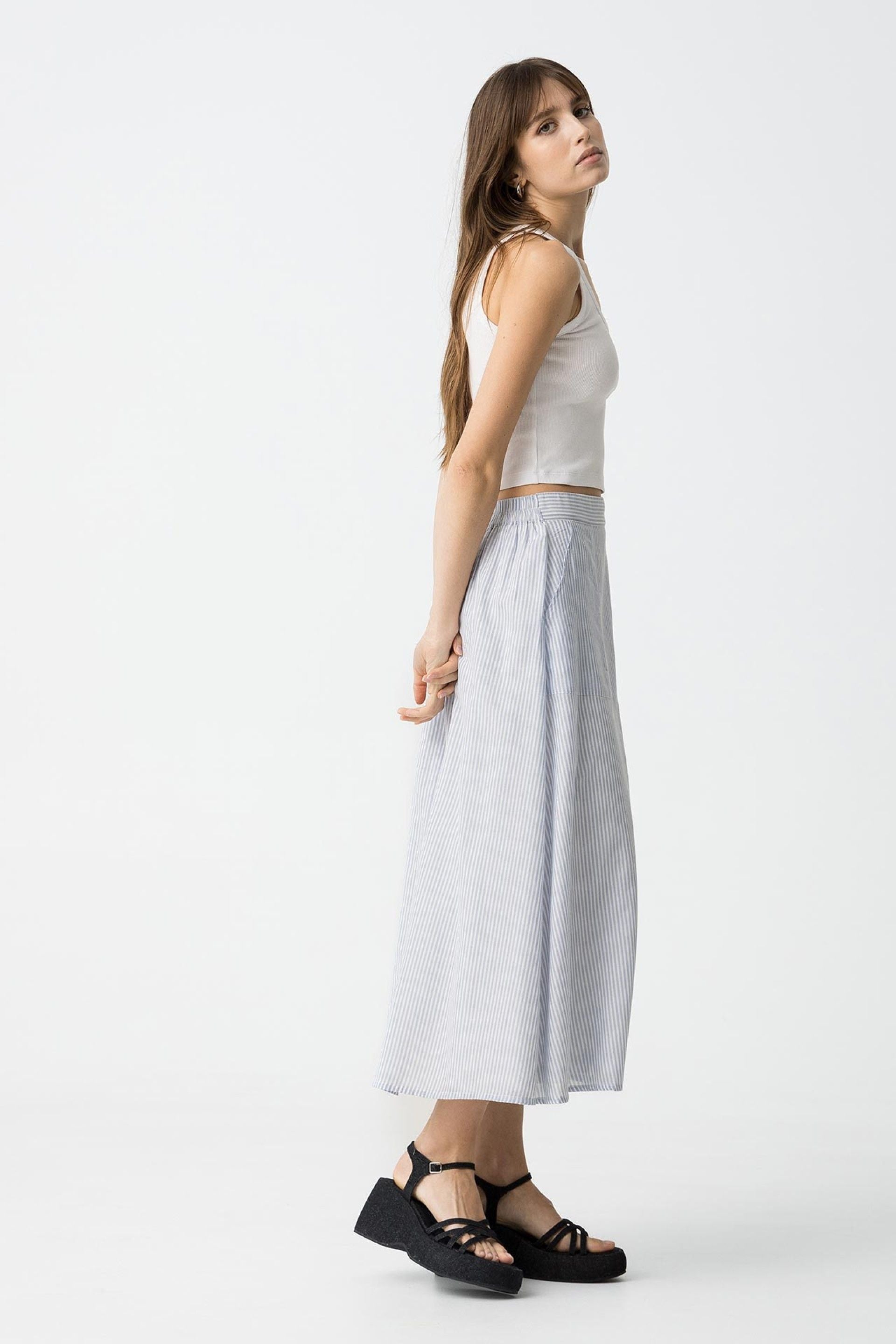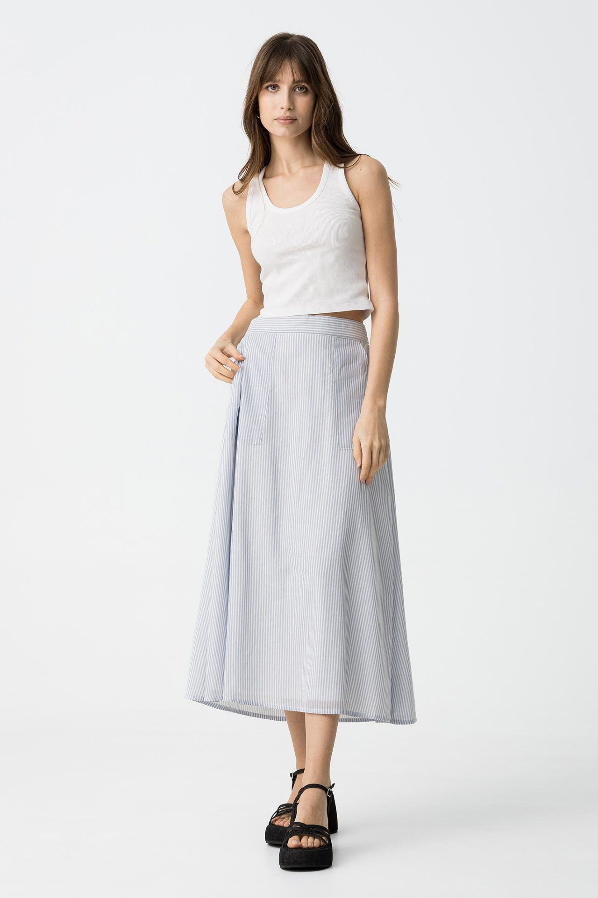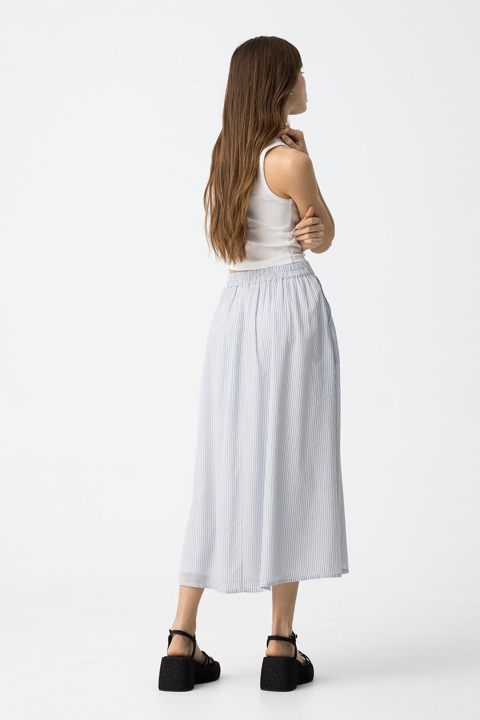 Falda midi de talle alto. Cremallera lateral oculta en la costura. Aplicación de botones falsos en la parte frontal.
