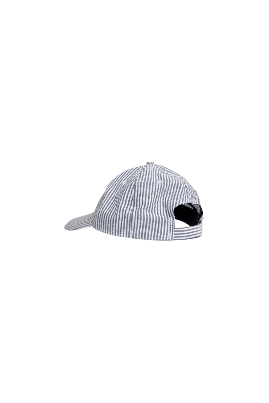 Esta gorra ajustable cortada en algodón ligero presenta un diseño de rayas verticales en azul claro y blanco con un pequeño bordado en la parte delantera.
