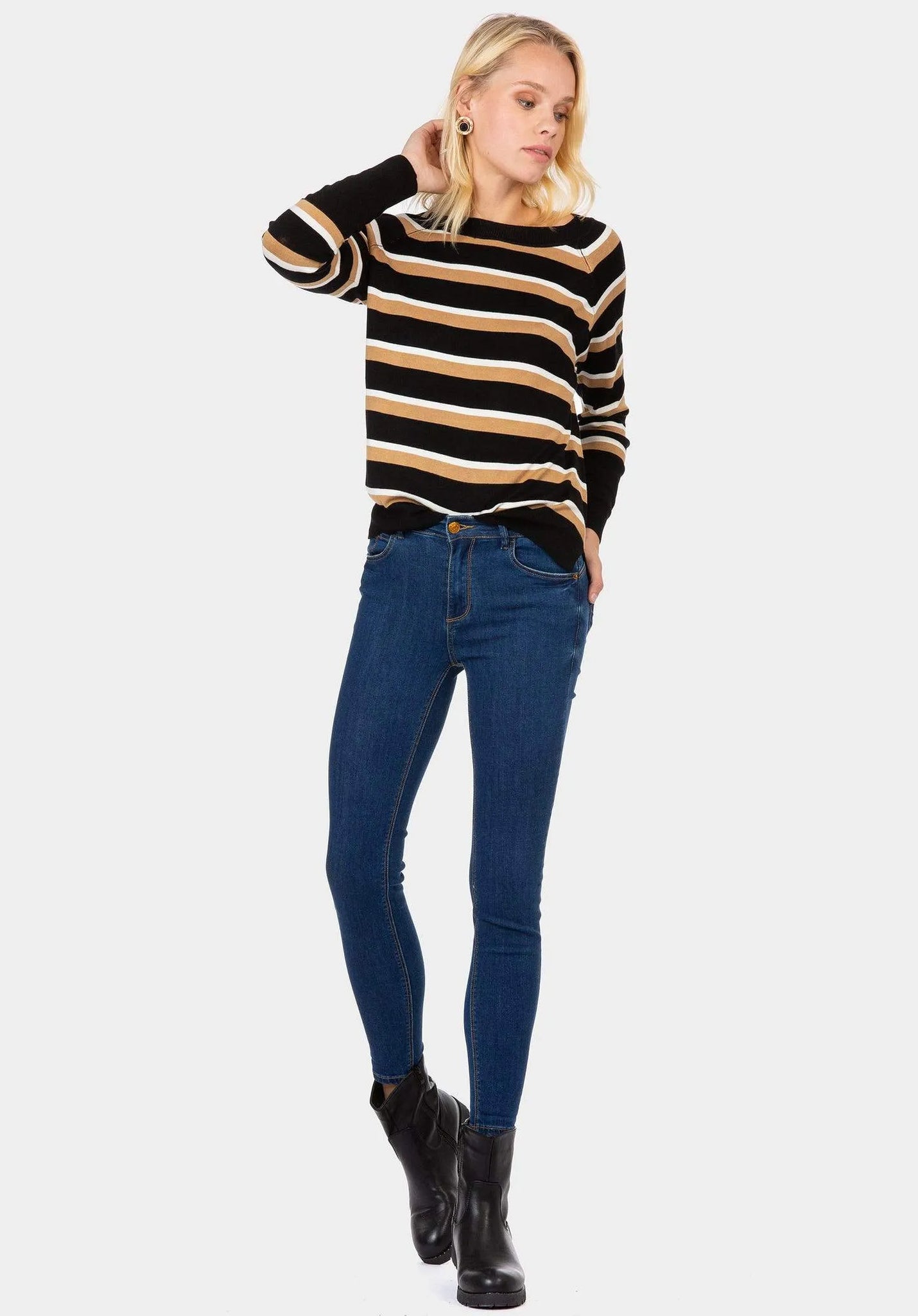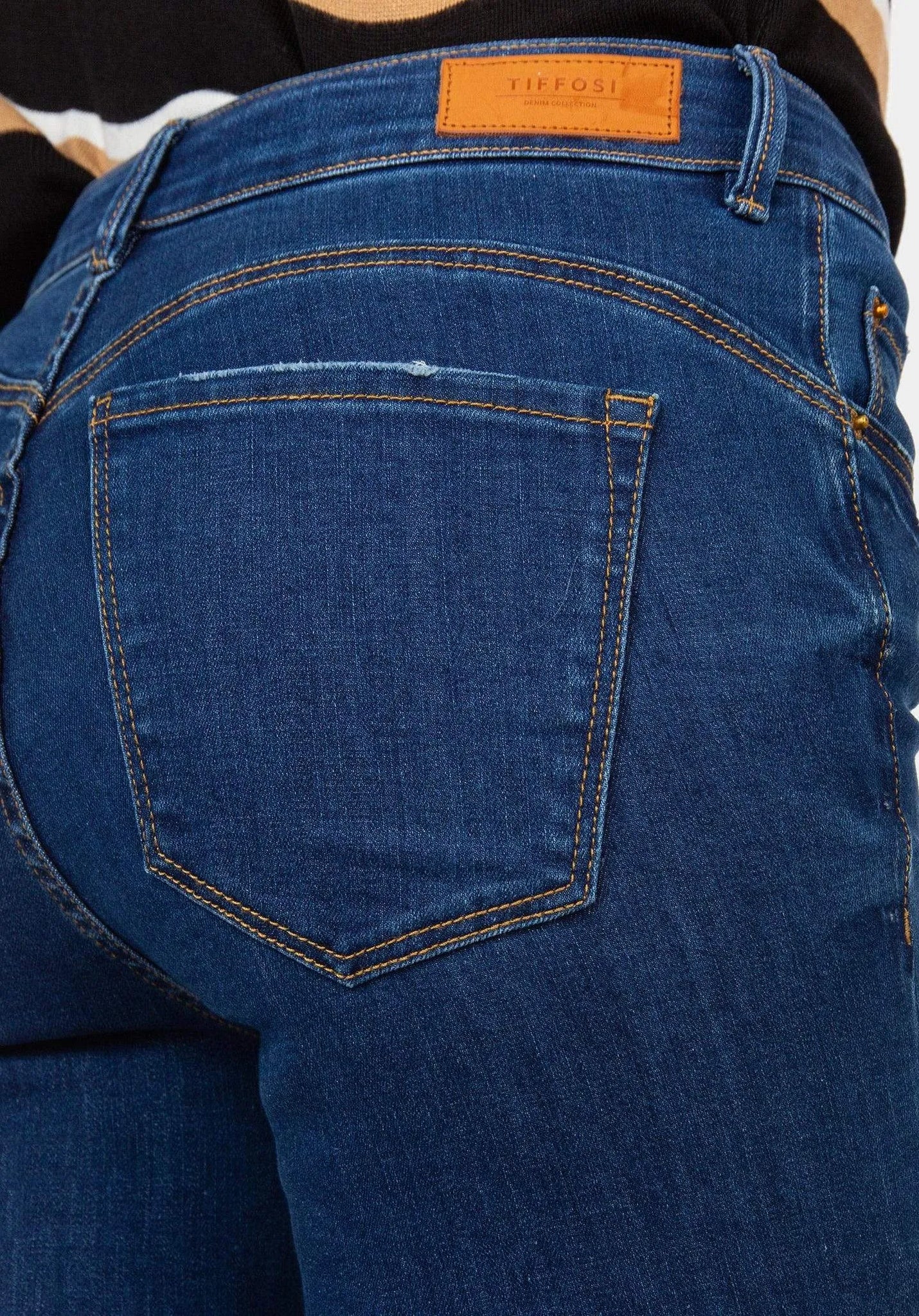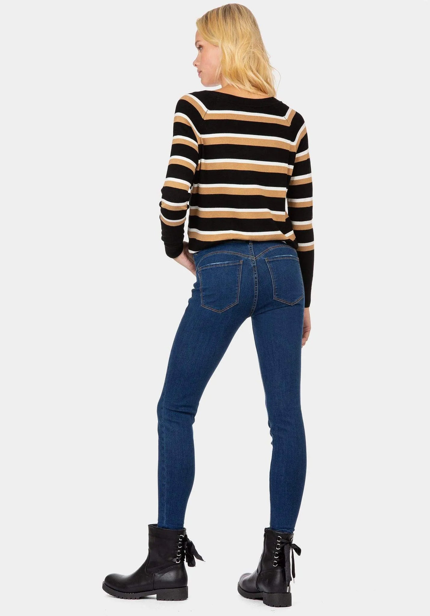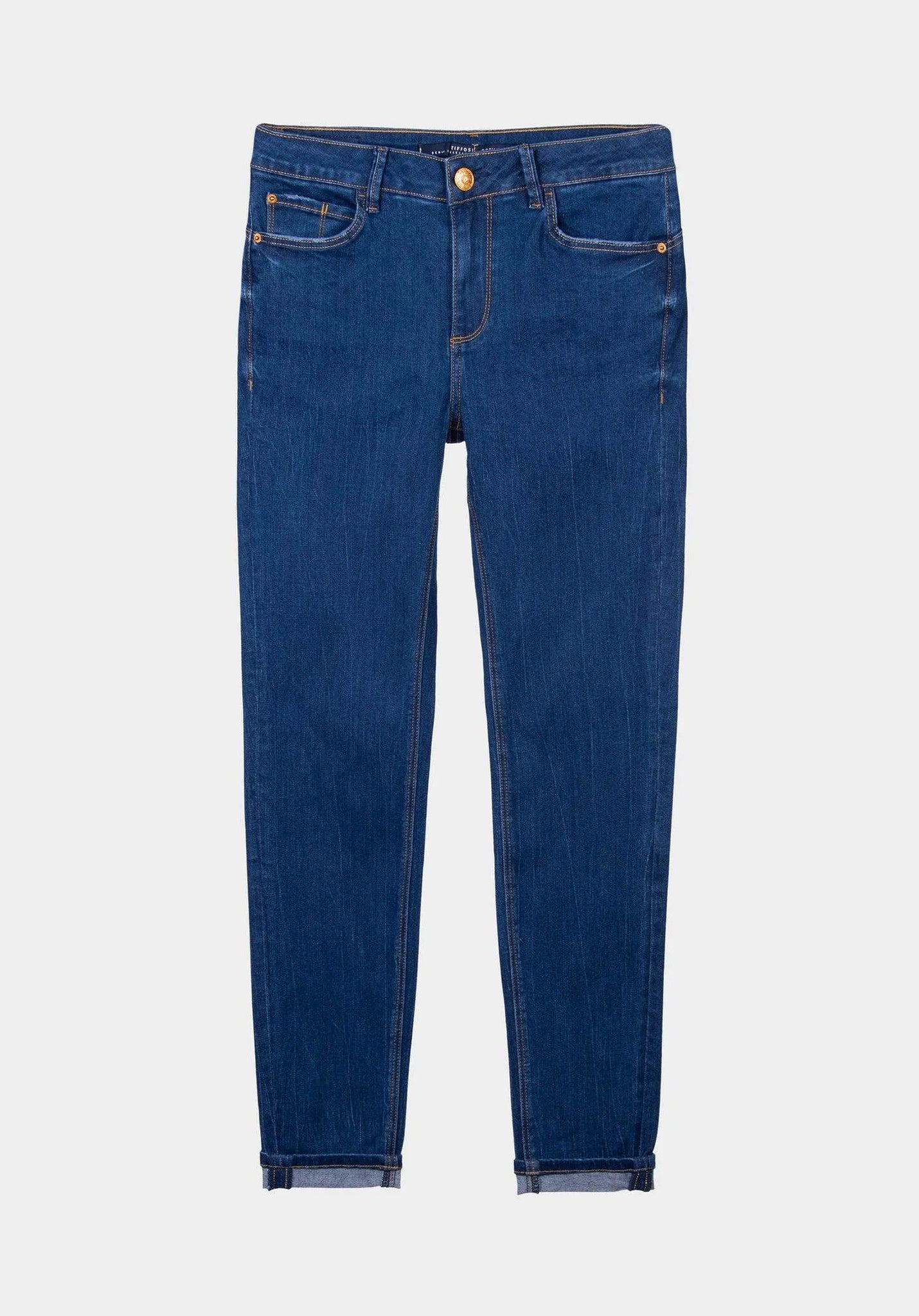 Jeans ajustados de tiro alto con cinco bolsillos. Cierre frontal con cremallera y botón metálico.