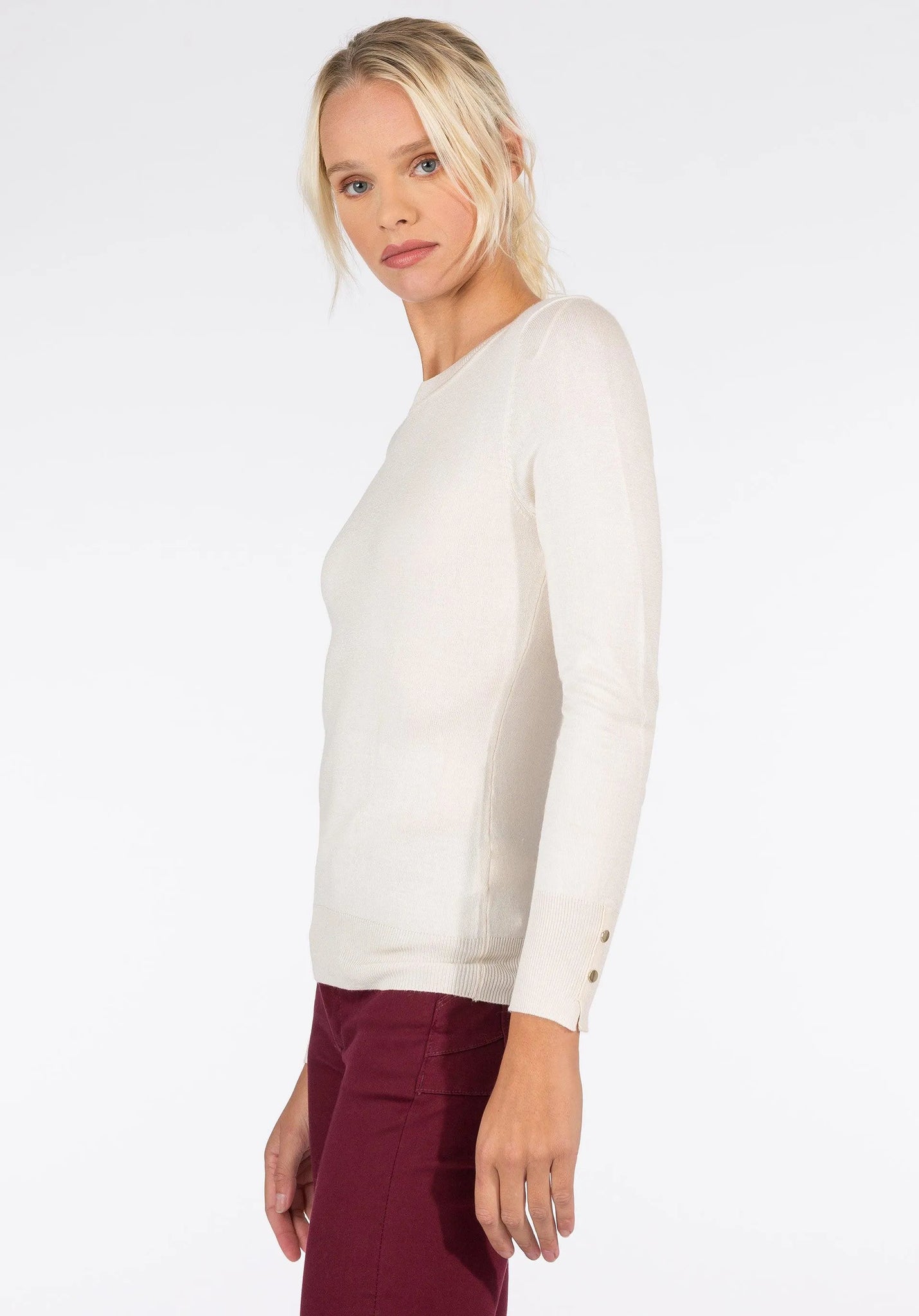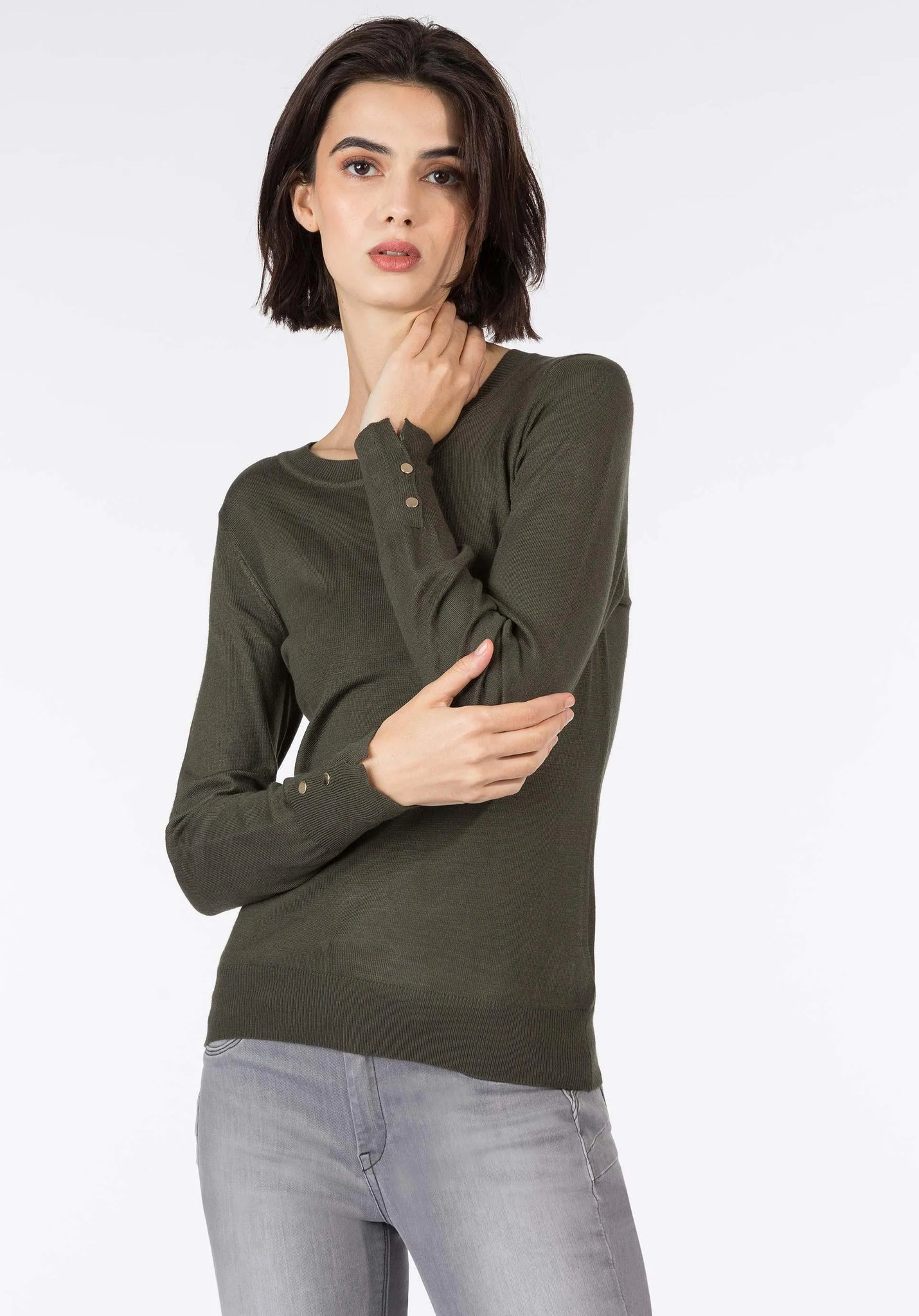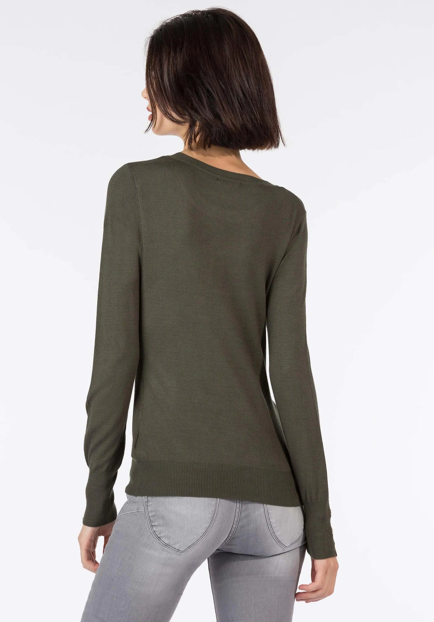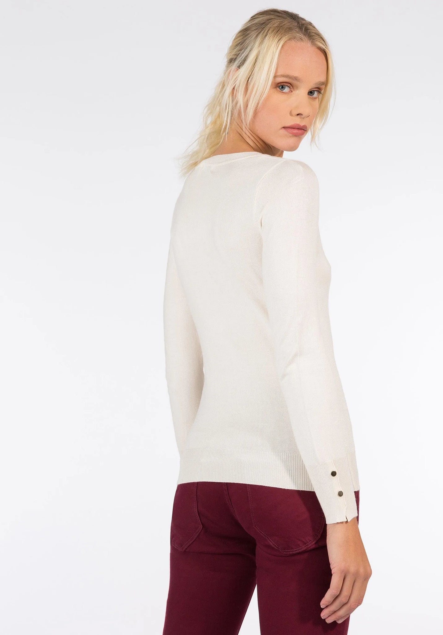 Jersey de punto fino de manga larga y cuello redondo. Detalle de apliques en las mangas.