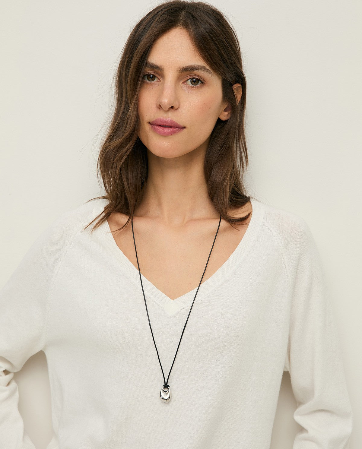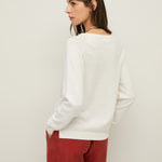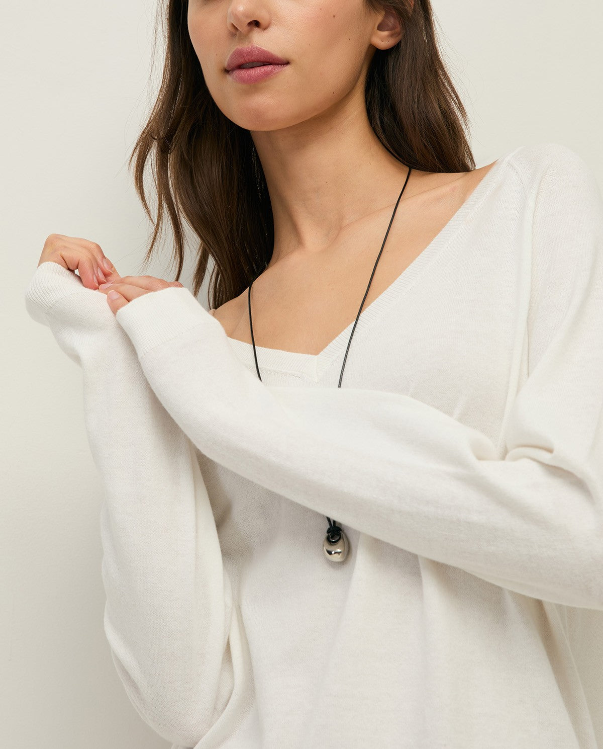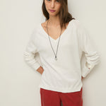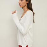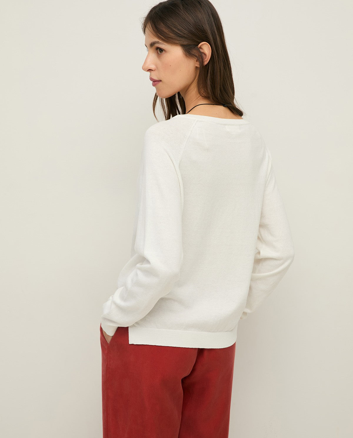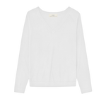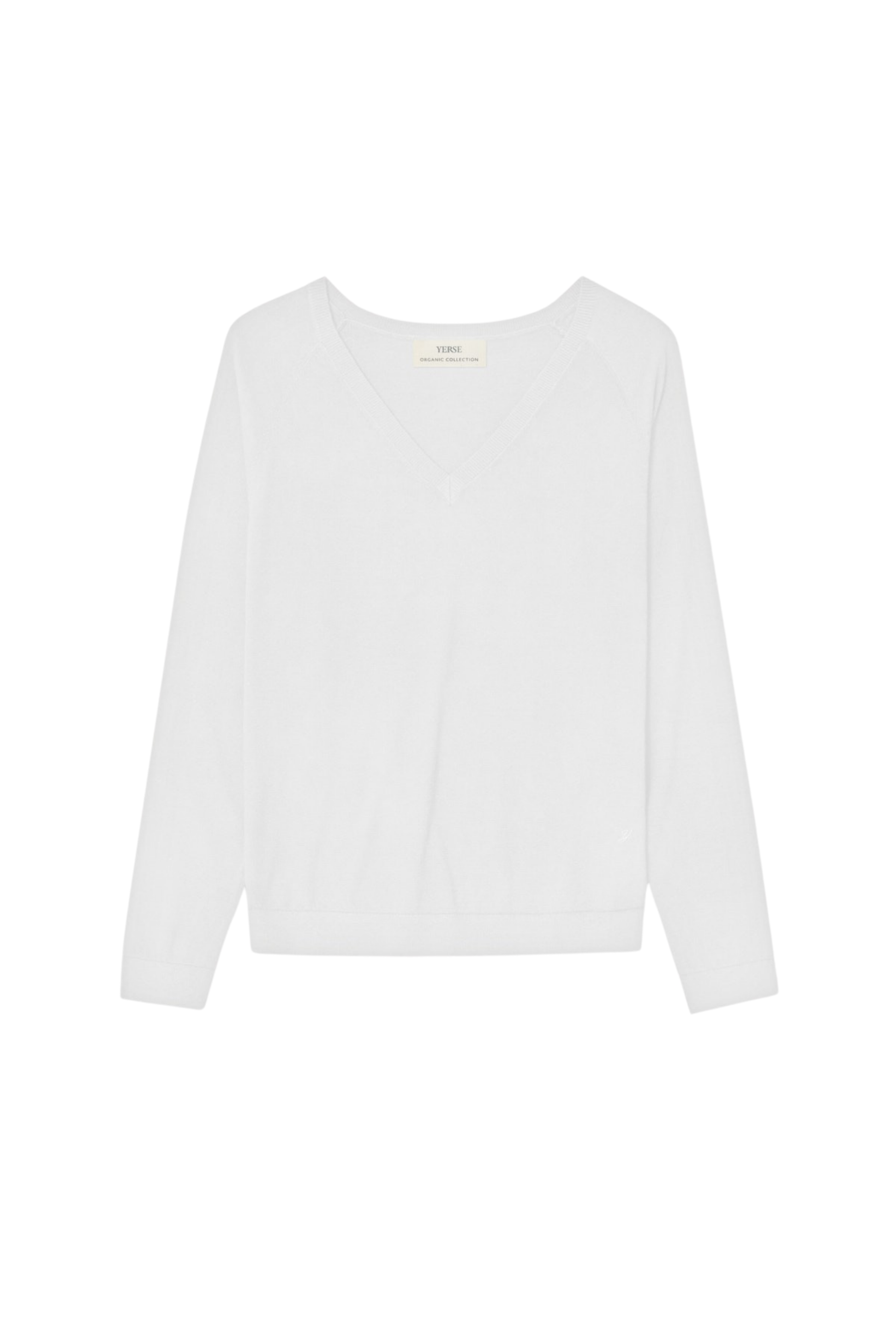 Jersey blanco. Elaborado en algodón orgánico. Punto liso. Diseño holgado. Manga larga. Cuello pico. Sisa ranglán. Aberturas laterales en bajos. Logo bordado. Galga fina. Longitud desde el hombro: 59 cm (talla S).