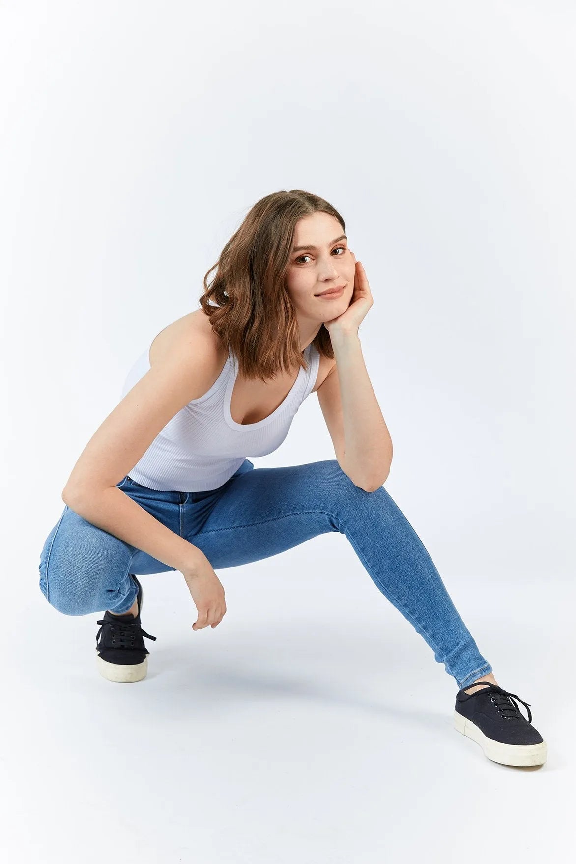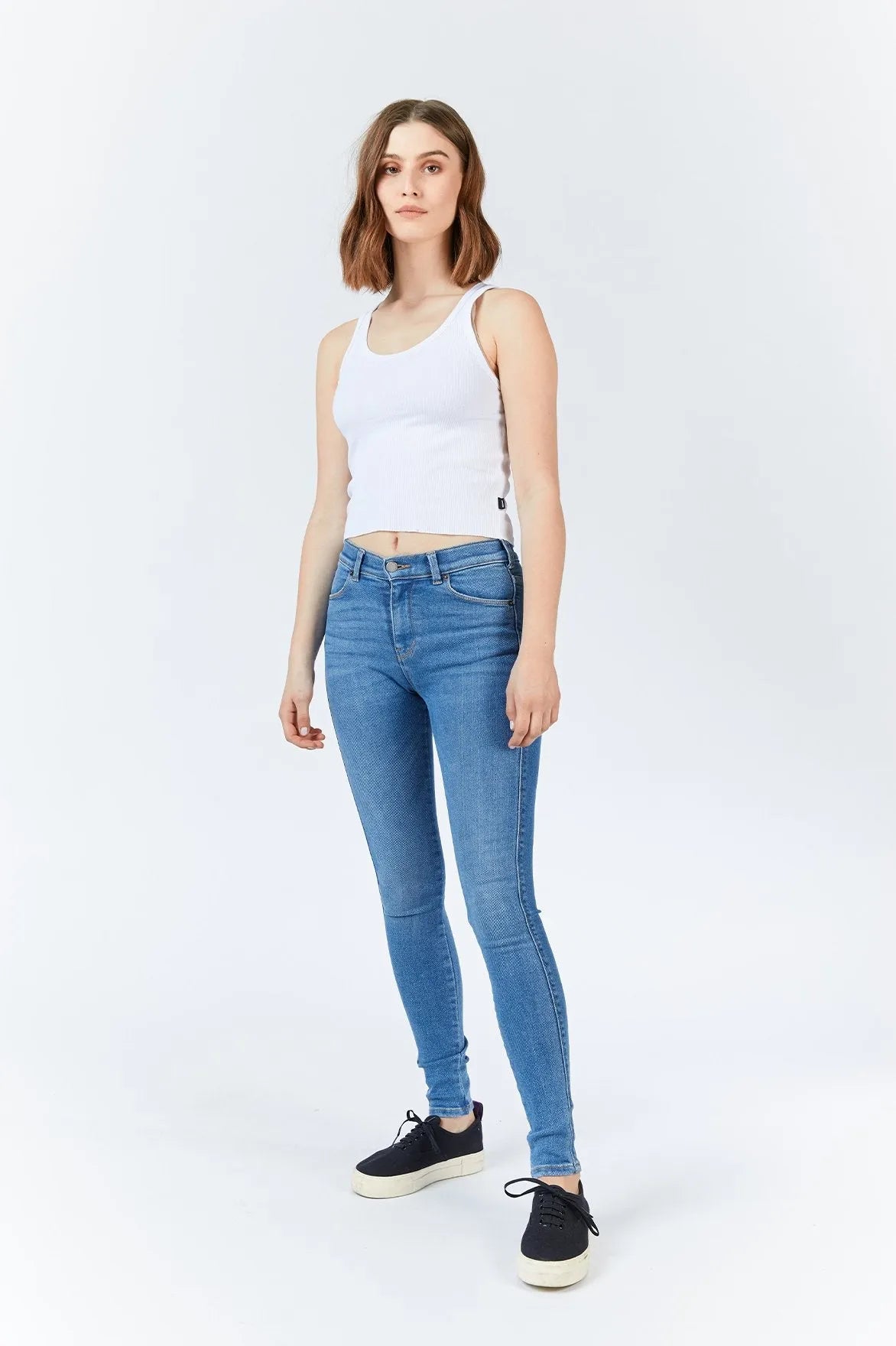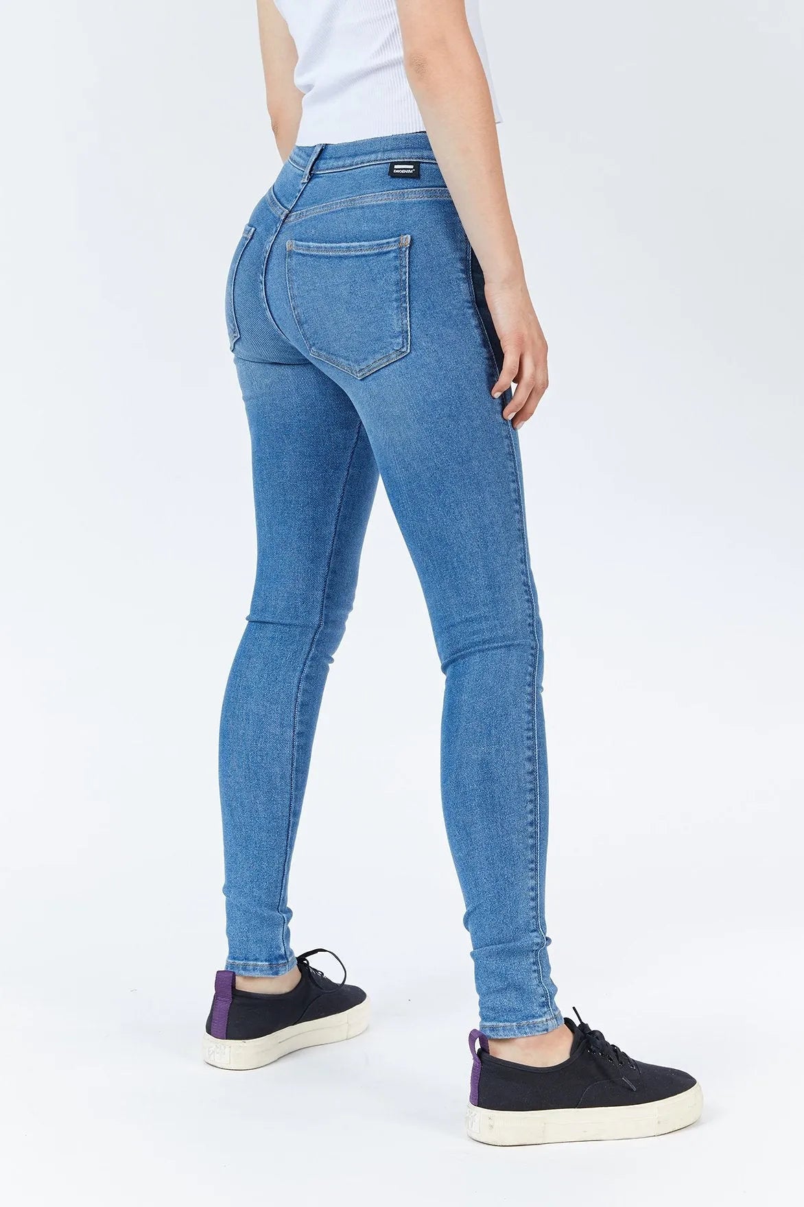 Super skinny fit with a second skin leg and mid rise waist. Super stretch fabric in a blue wash.