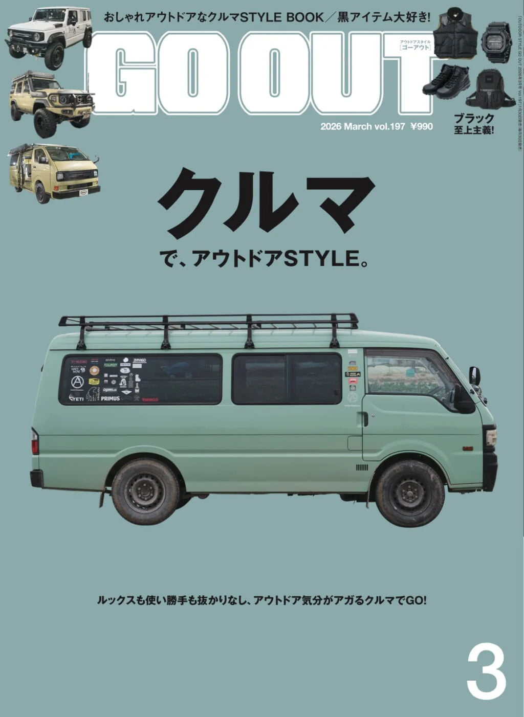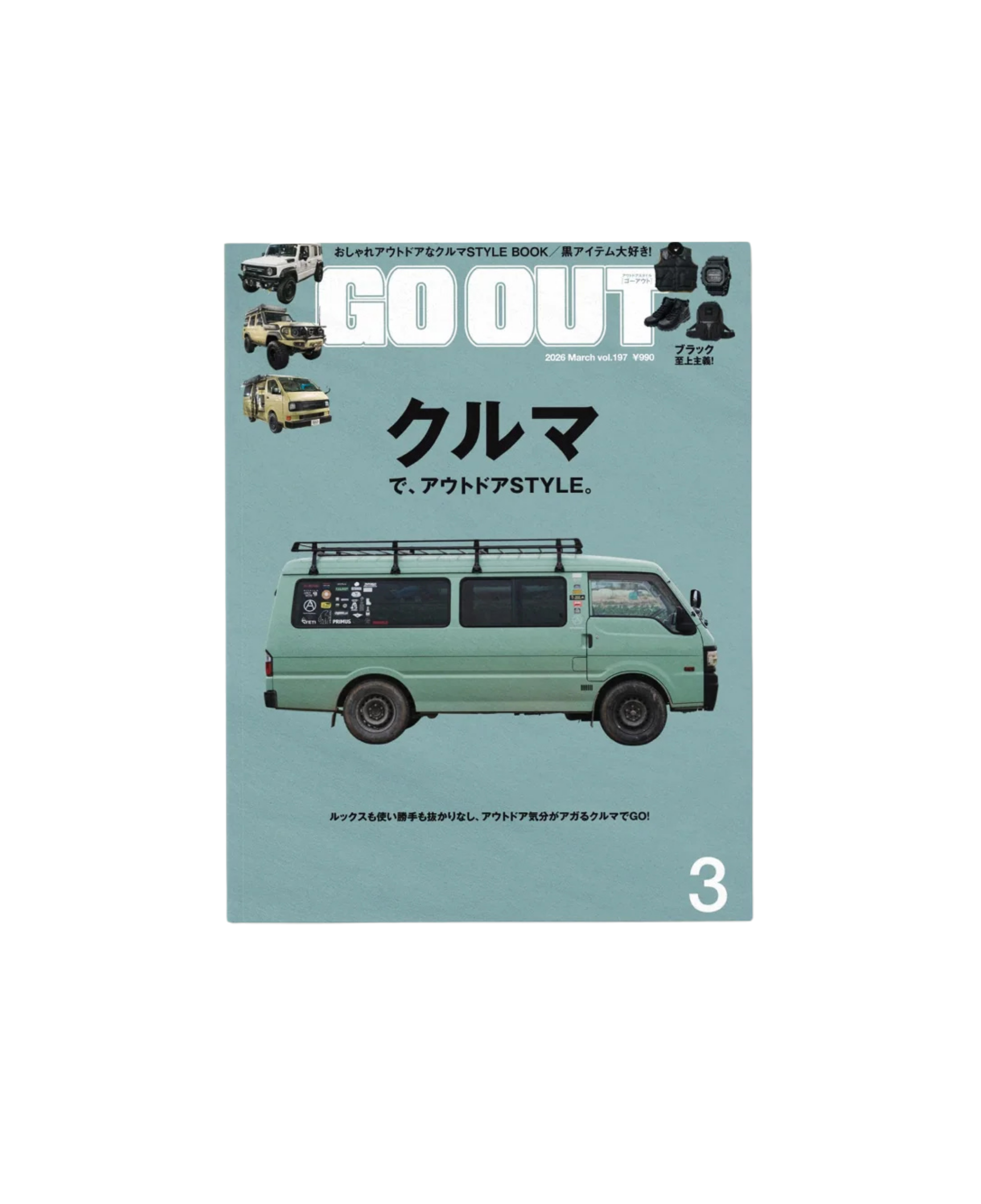 Es el número 197 de la revista japonesa GO OUT, centrado en estilo de vida outdoor, vehículos y cultura aventurera.