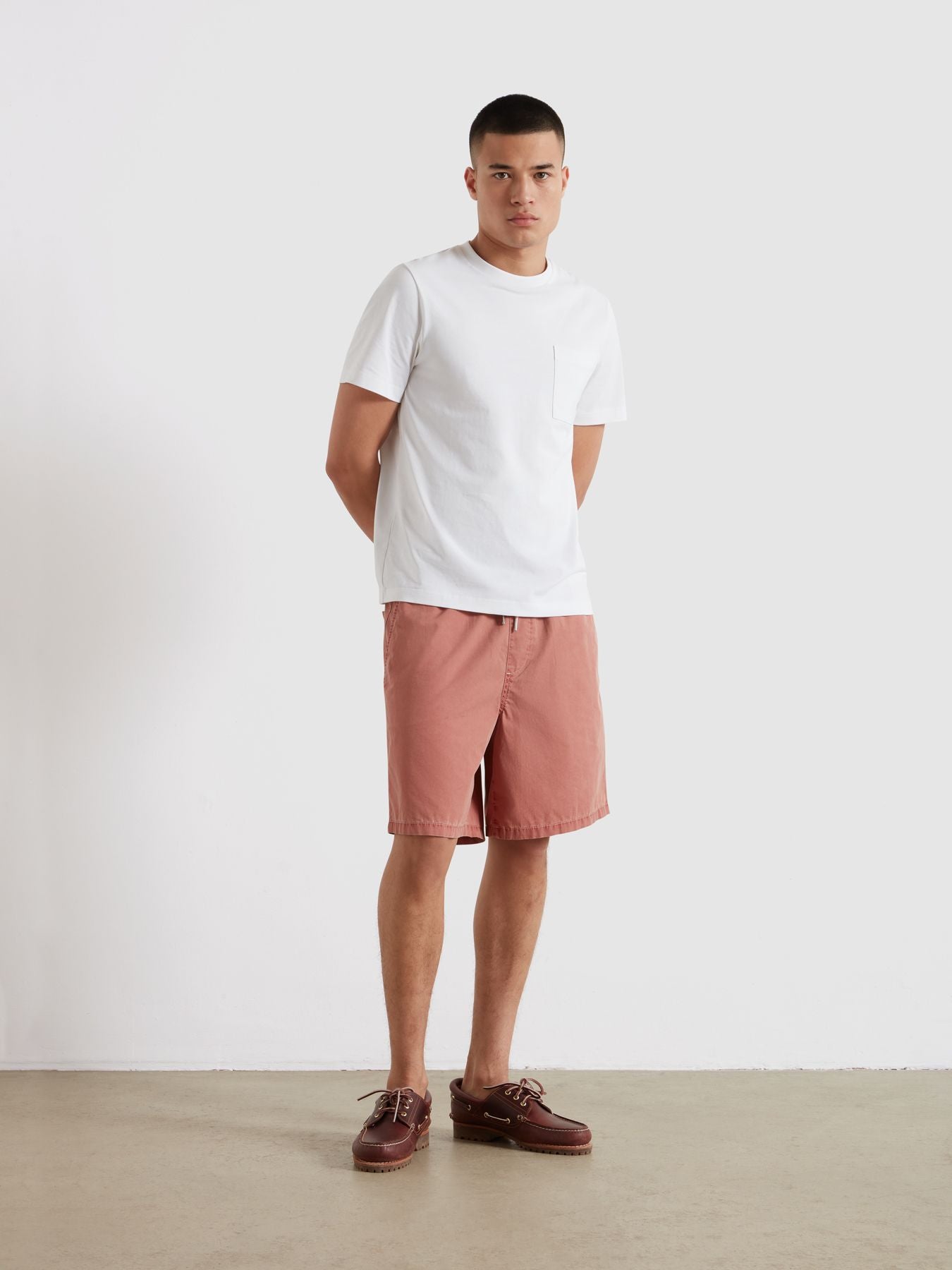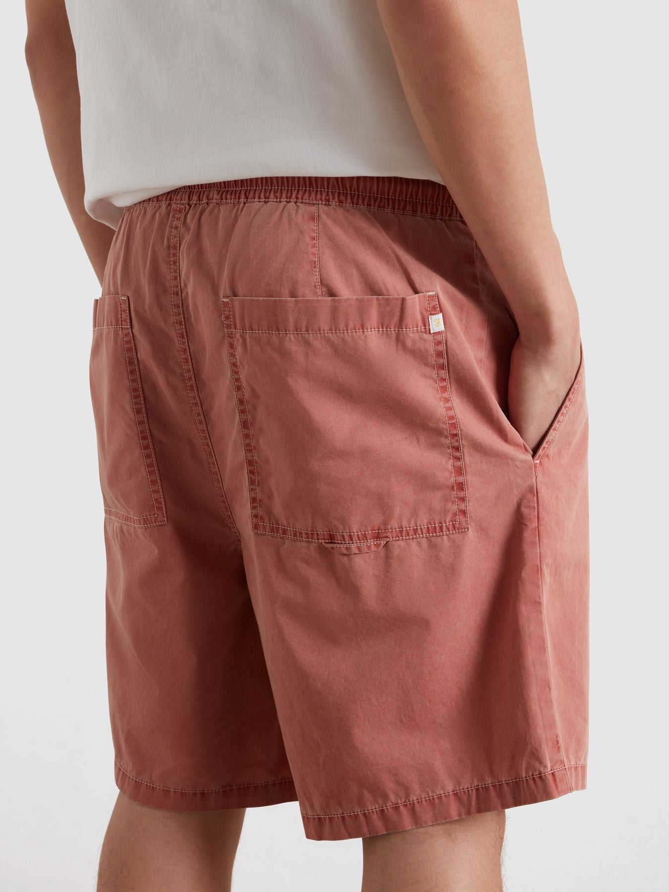 El Farah Swinton Drawstring Herringbone es un pantalón corto de algodón con cintura elástica y cordón exterior. Su diseño combina una construcción cómoda con un tejido de espiga que aporta más textura que un short liso convencional.