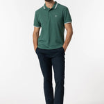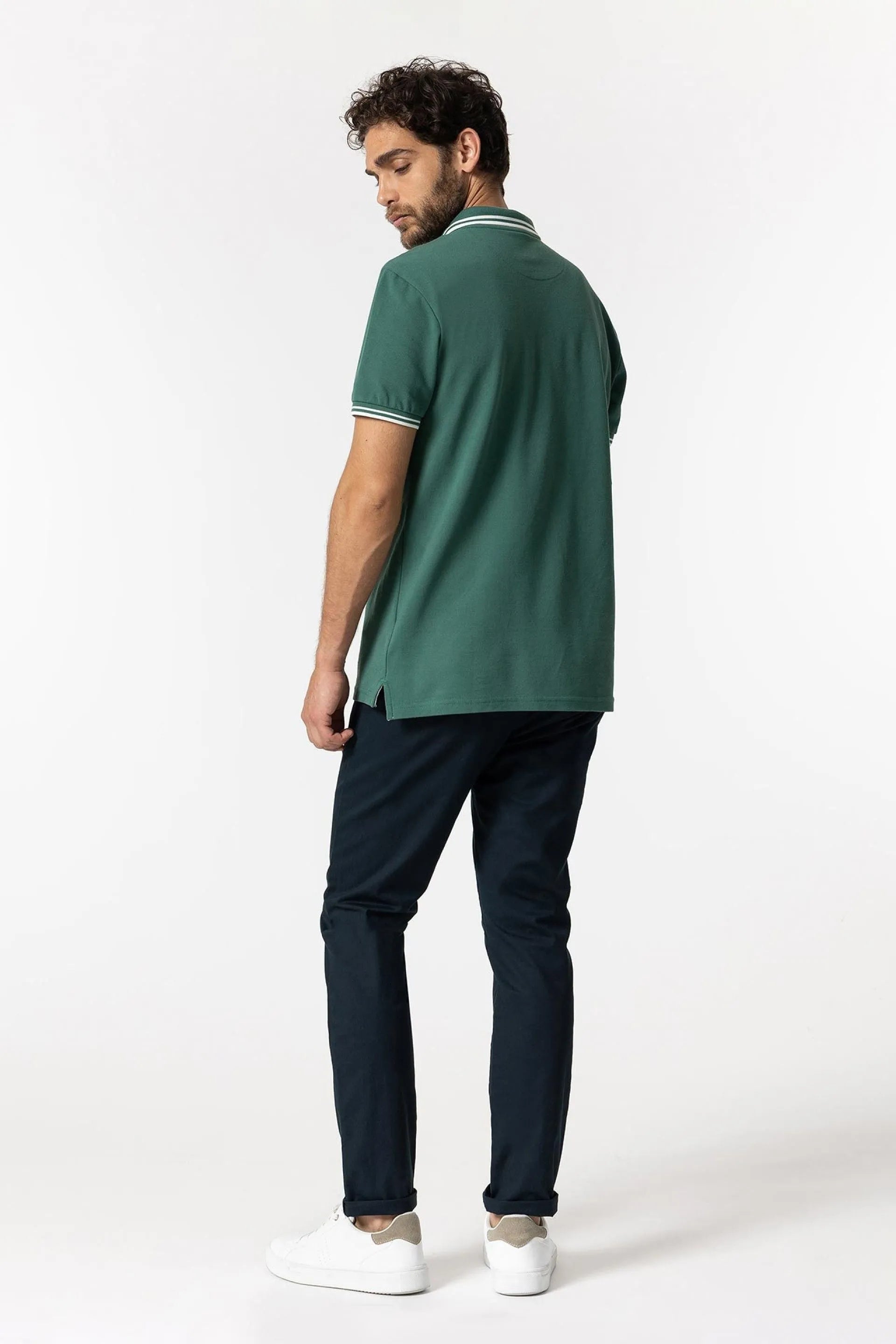 Pantalón slim fit con cinco bolsillos. Cierre frontal con cremallera y botón.