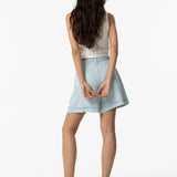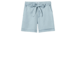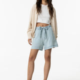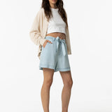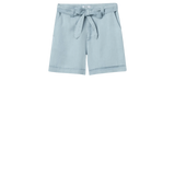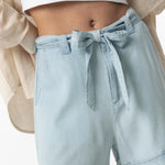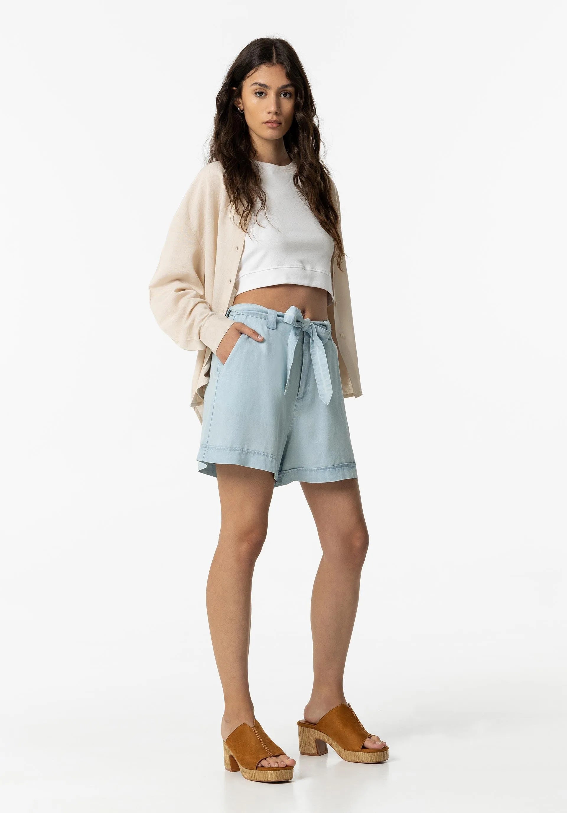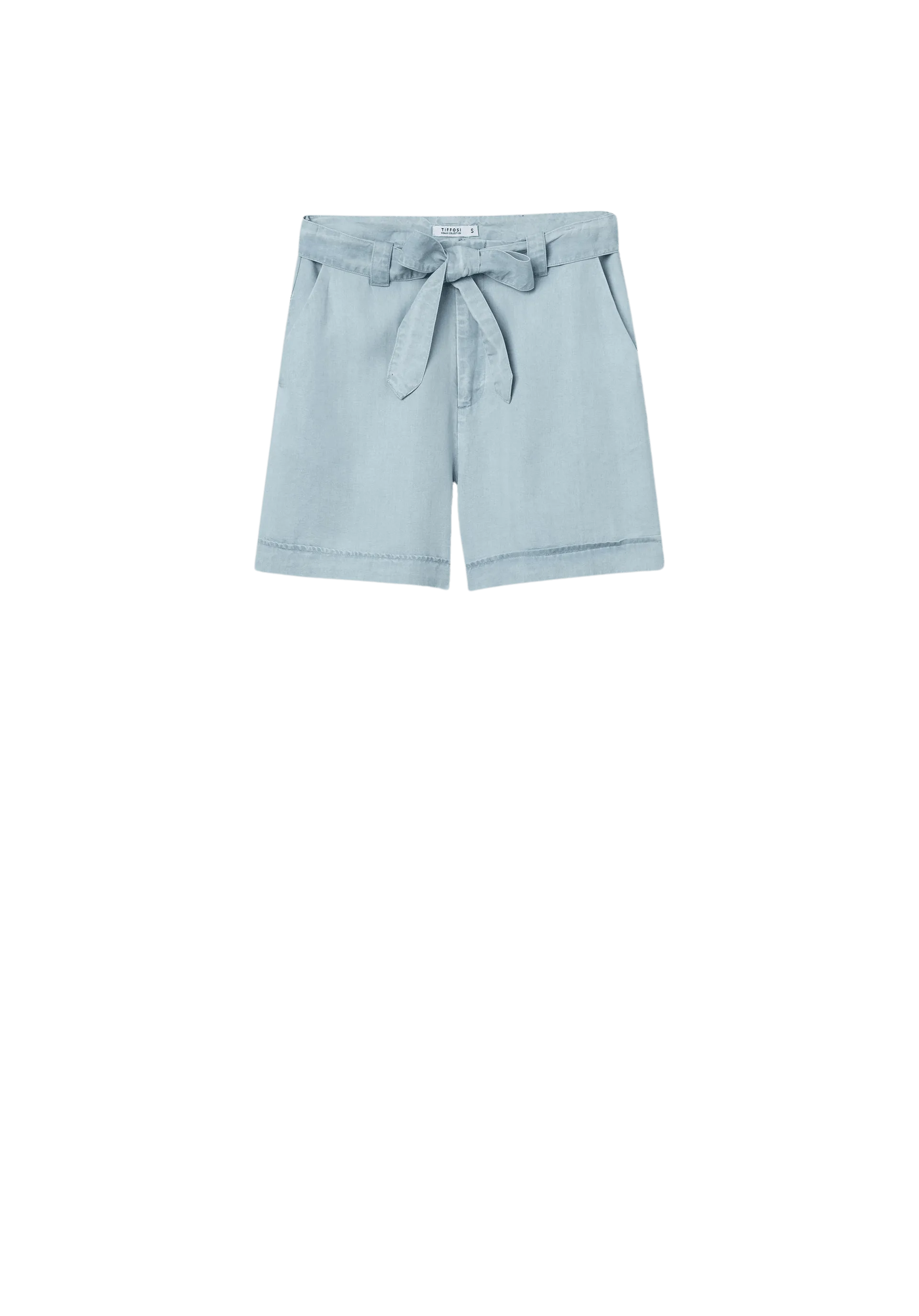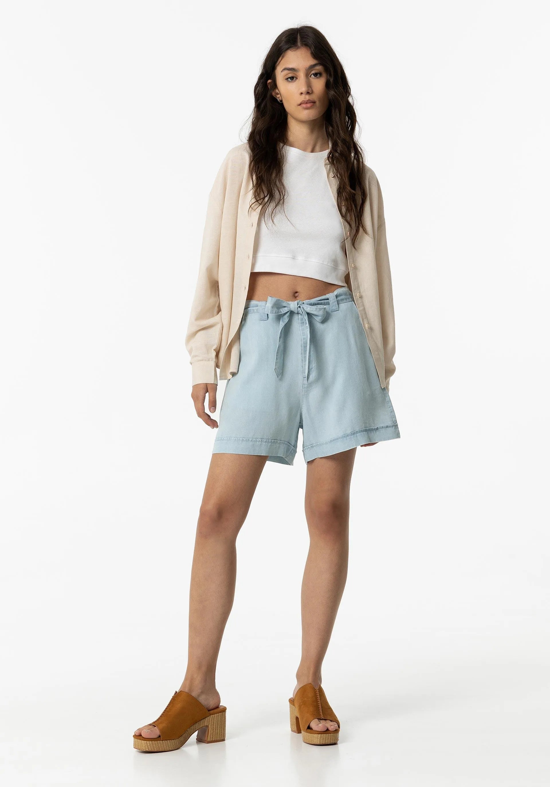 Bermuda de tiro alto con bolsillos laterales. Aplicación de cinturón del mismo tejido. Bajo acabado con vuelta. Cierre frontal con cremallera y botón interior.