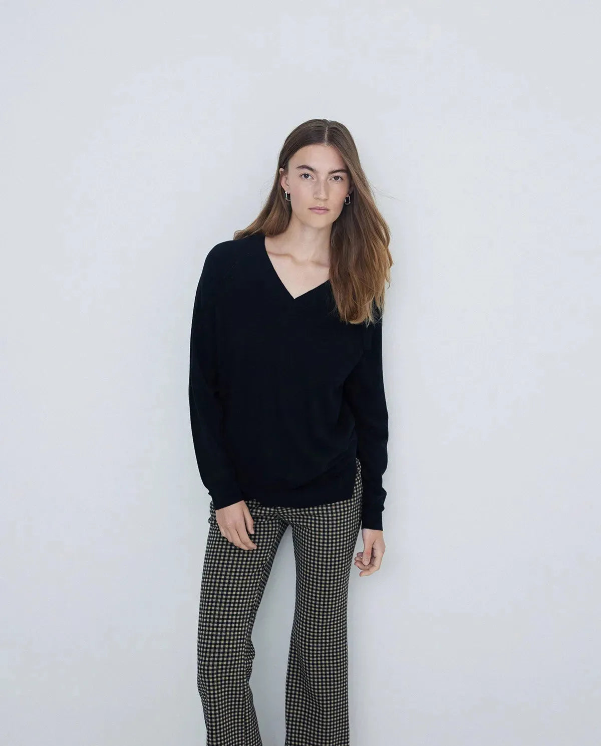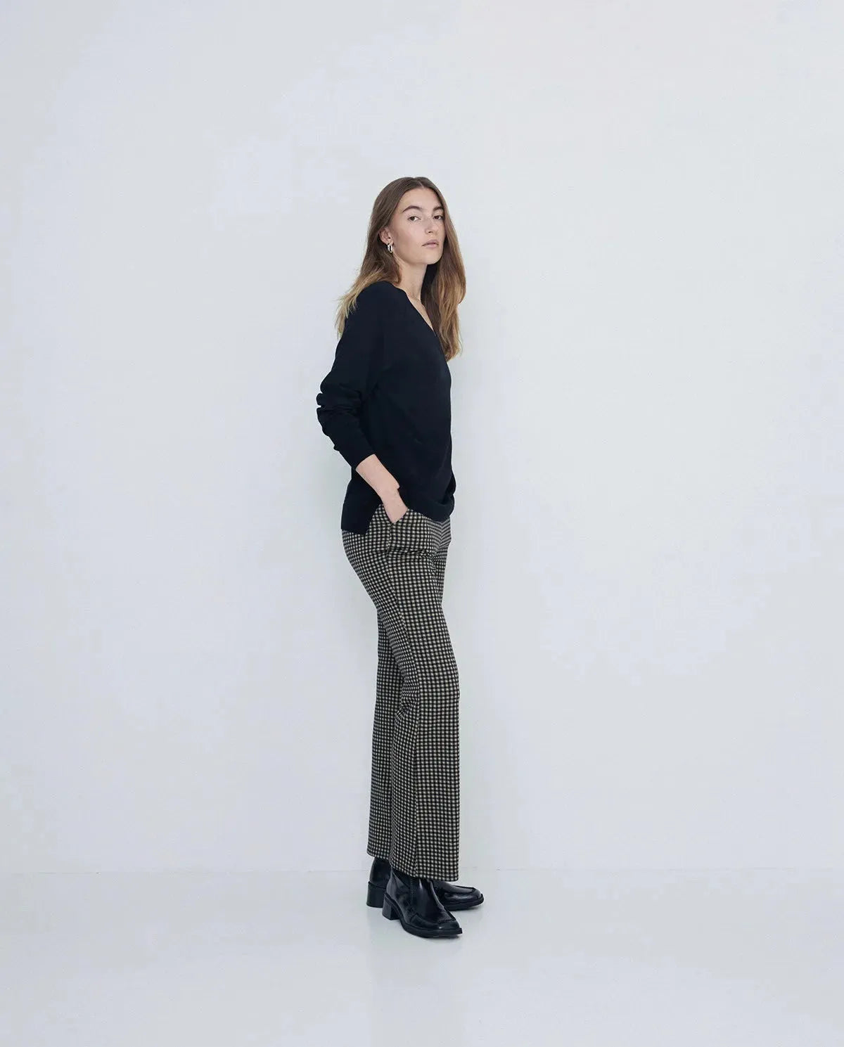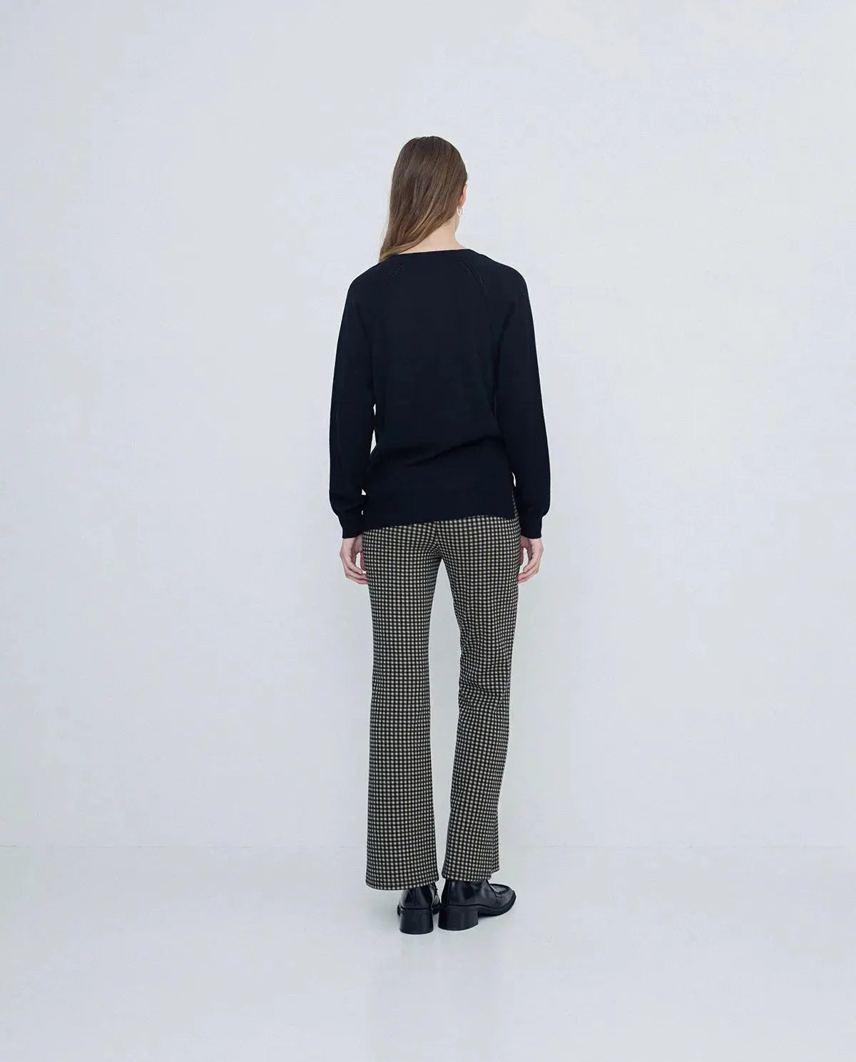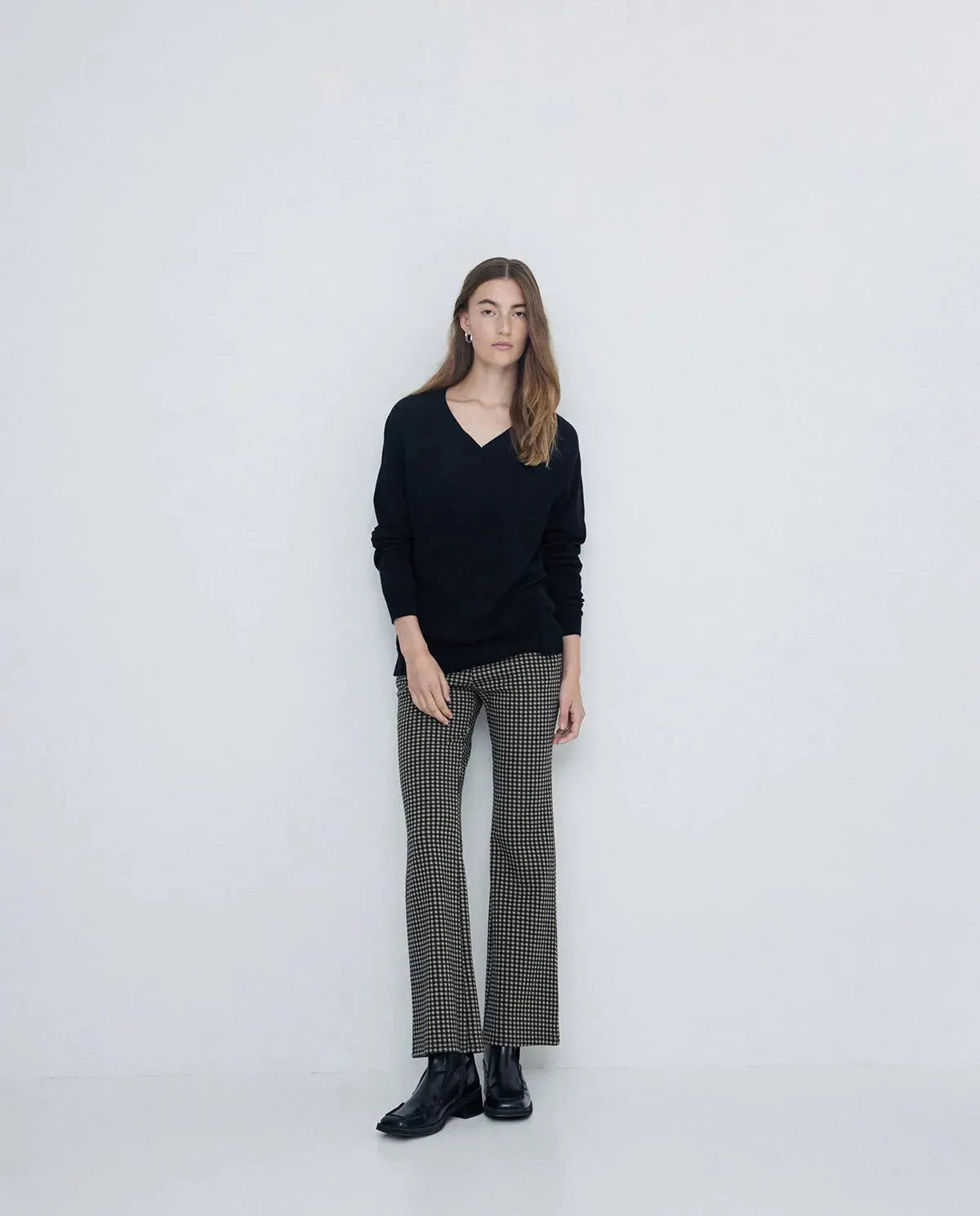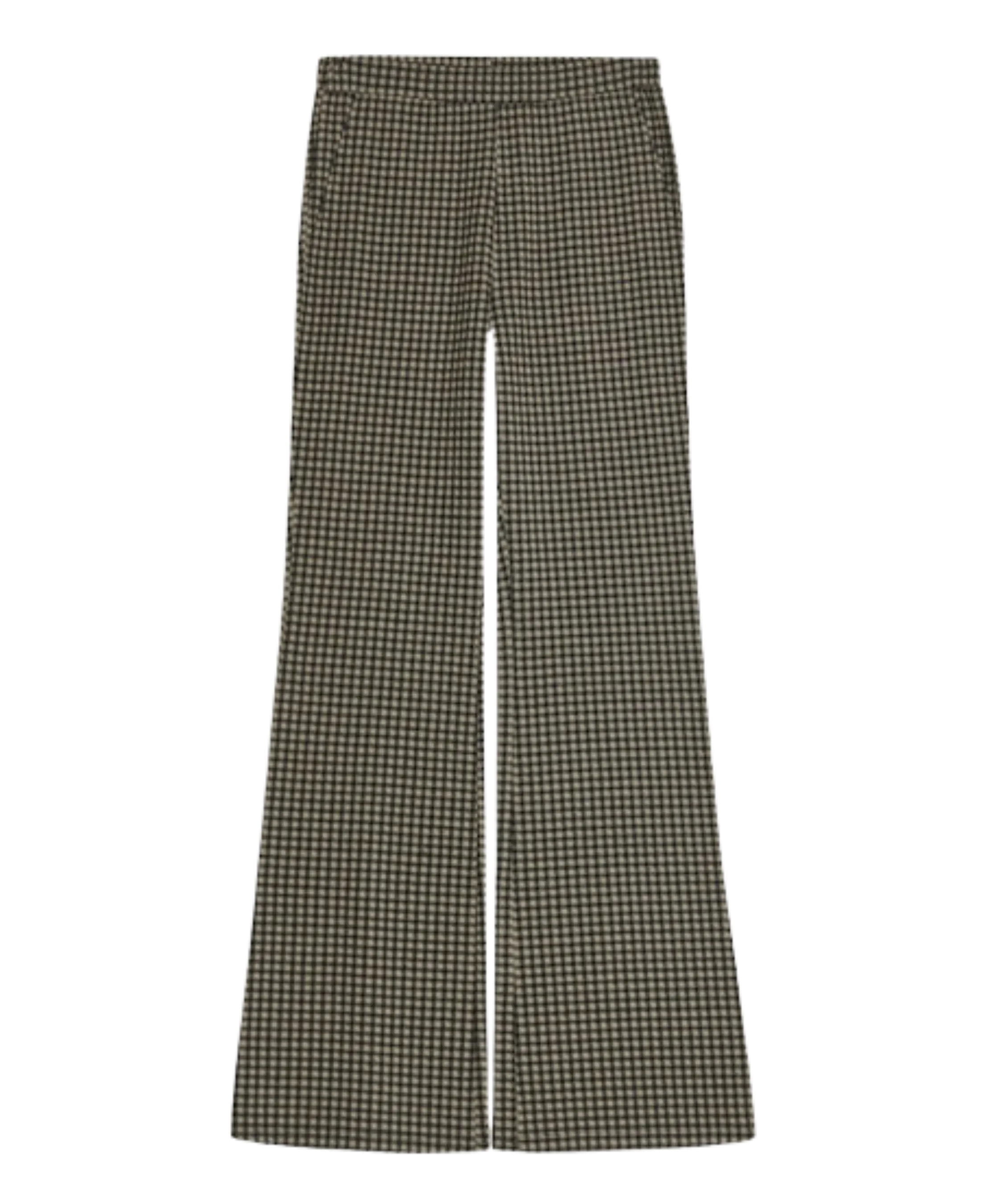 Pantalones tejido de punto. Corte flare. Cuadro vichy. Cintura elástica. Bolsillos laterales.