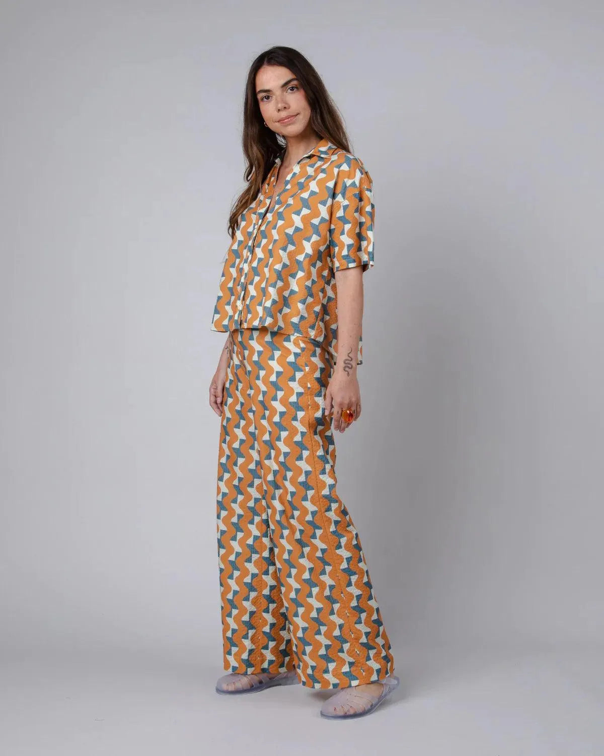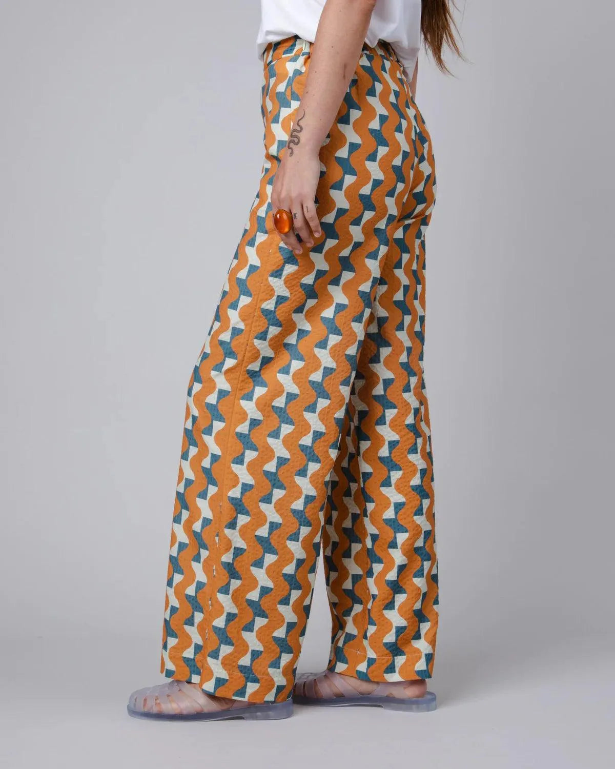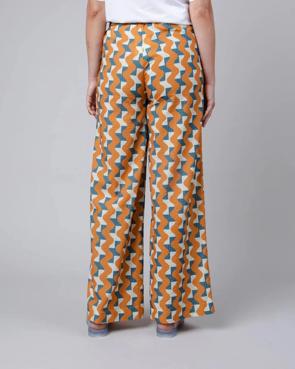 Pantalón largo estampado de pierna recta y tiro alto con cintura elástica para mayor comodidad. Confeccionada éticamente con algodón orgánico y viscosa sostenible.