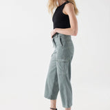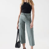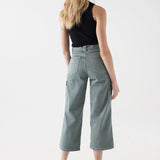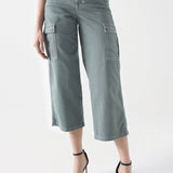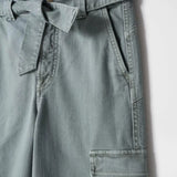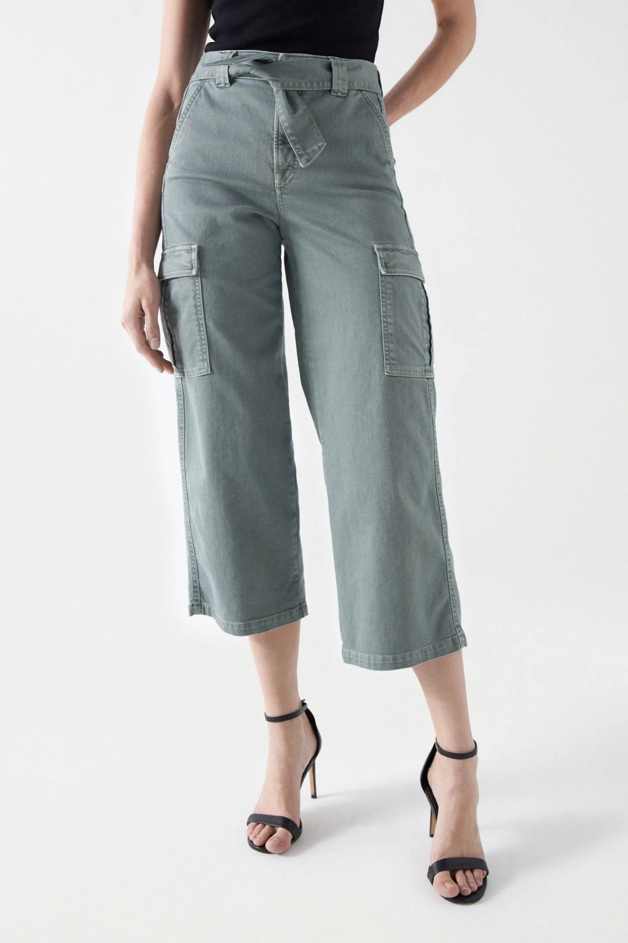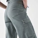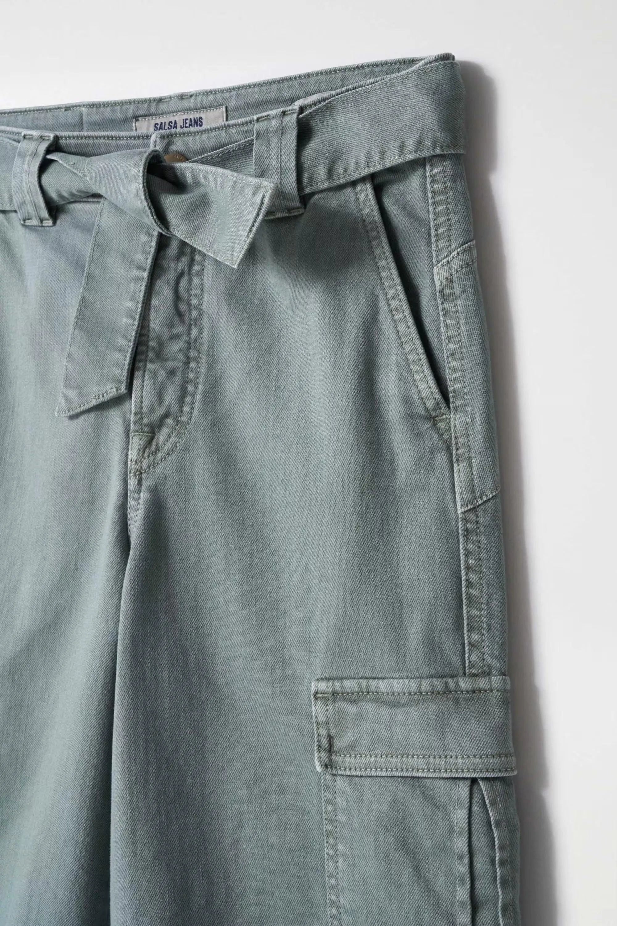 Faith push in cargo jeans. Green. Straight leg. High rise. Zip fly with button. Six pockets. Belt loops. Belt in the same material.