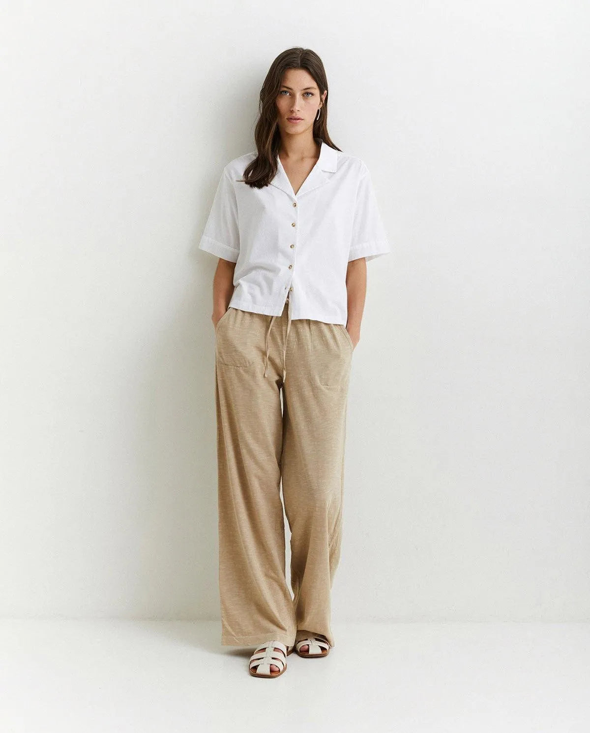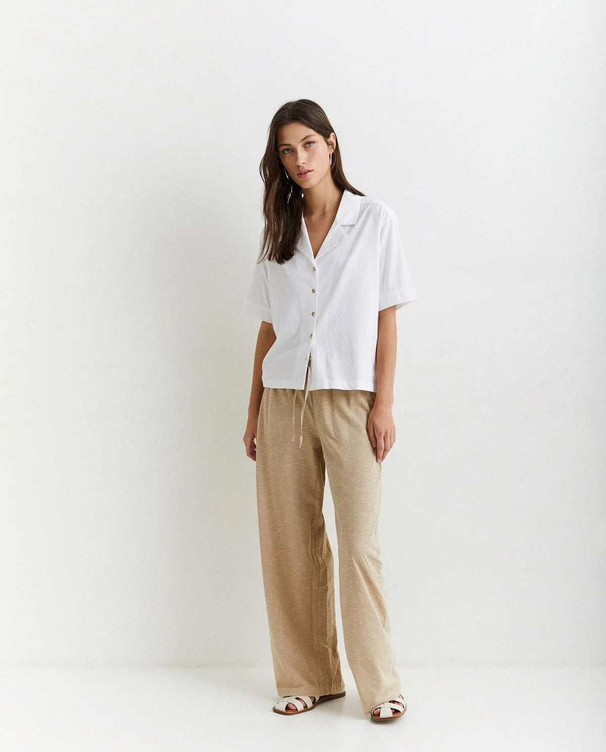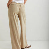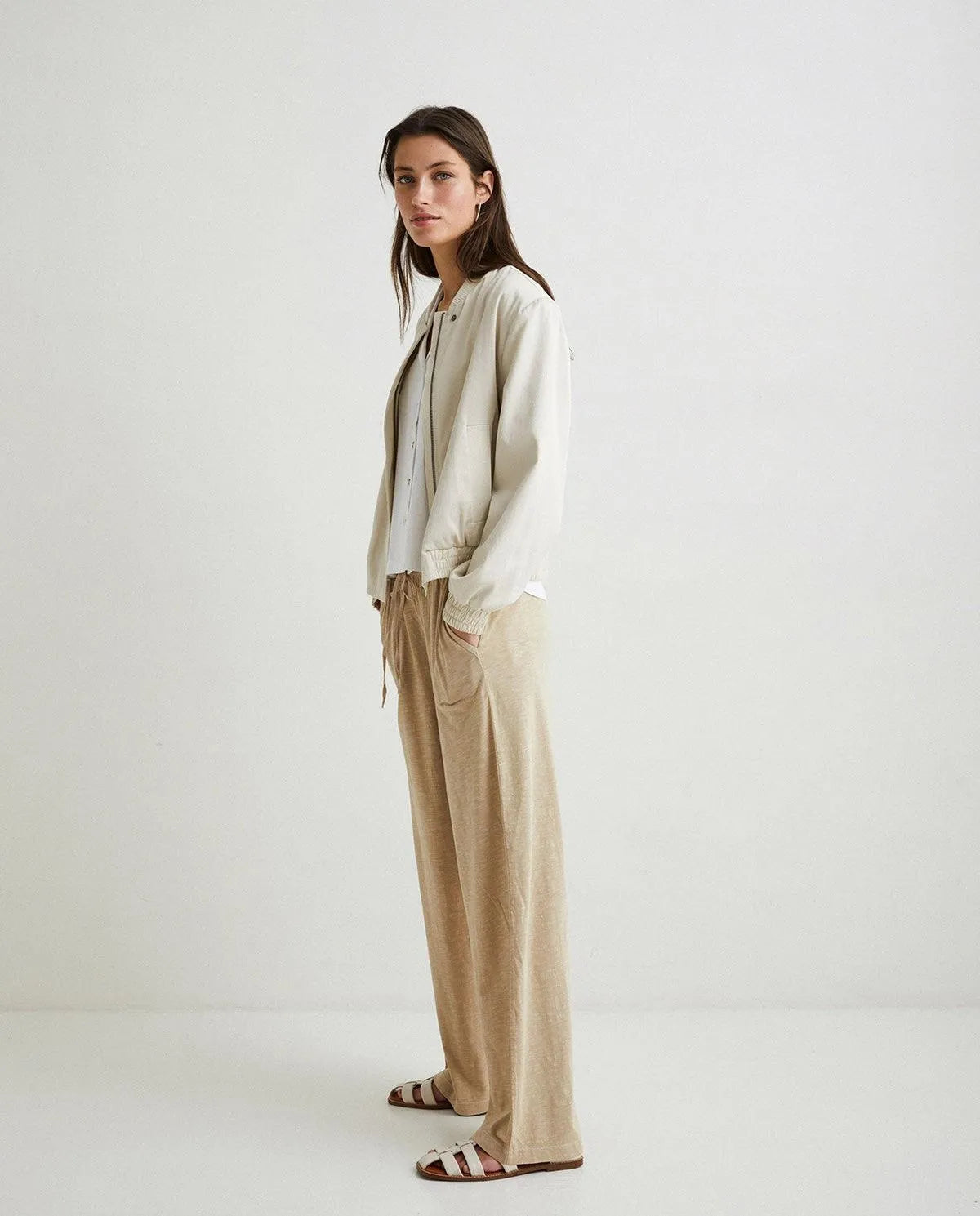 Pantalones flamé fluidos. Cintura media. Corte recto. Cintura elástica con cierre de lazo. Bolsillos laterales. Composición: Frontal: 100 % algodón. Trasera: 60 % lino, 40 % algodón. Altura modelo 175 cm, talla S.