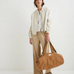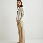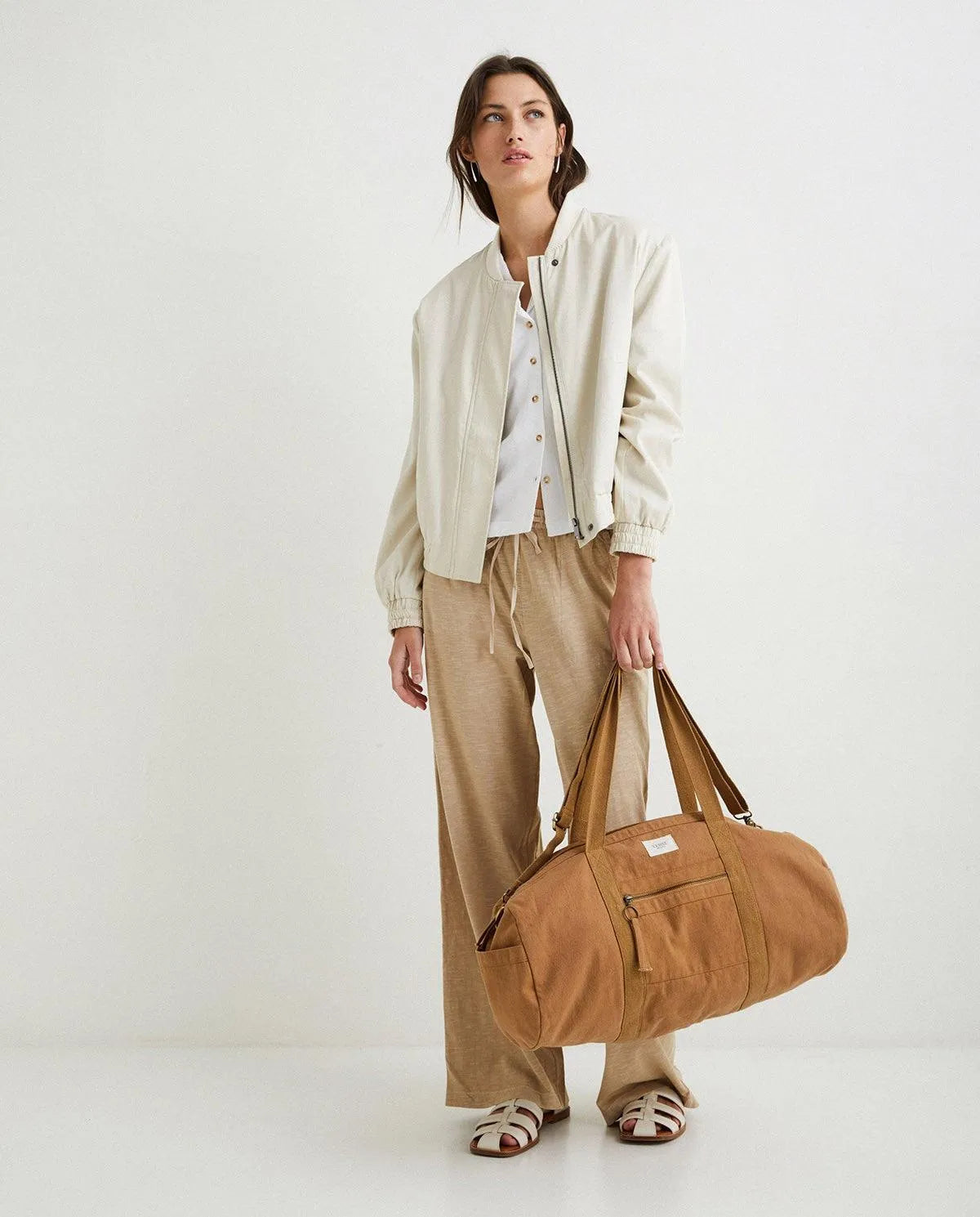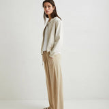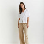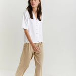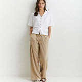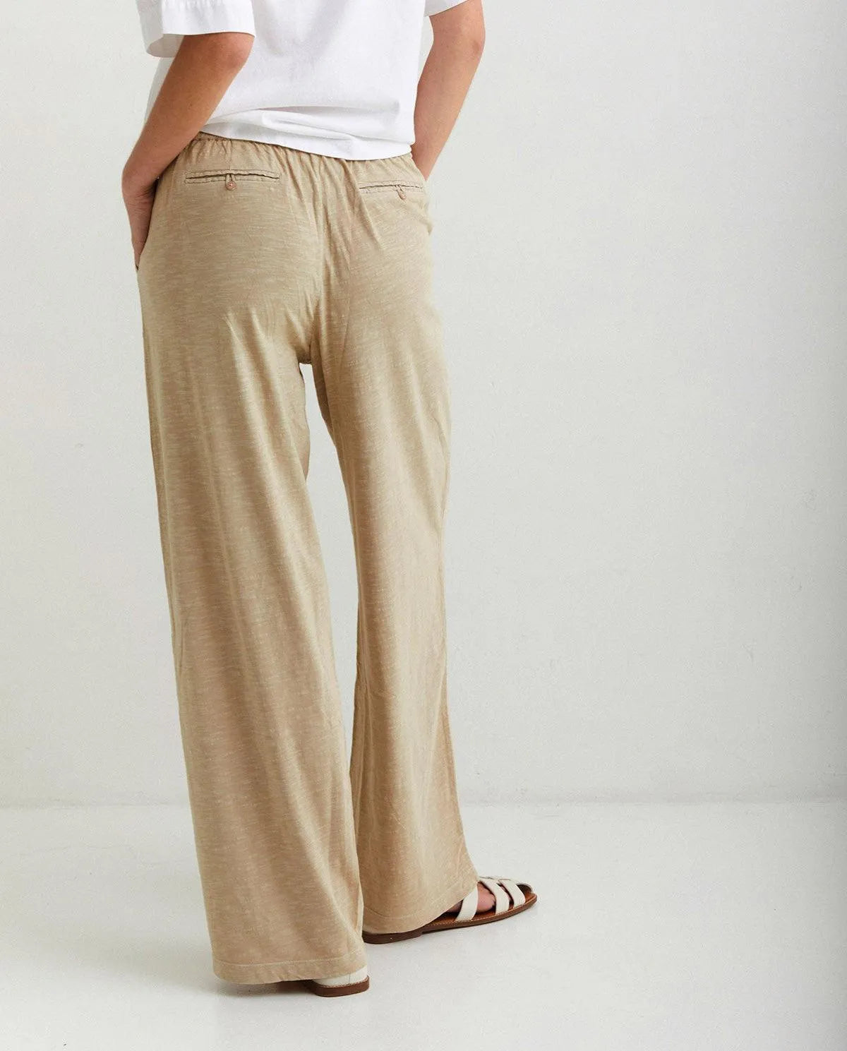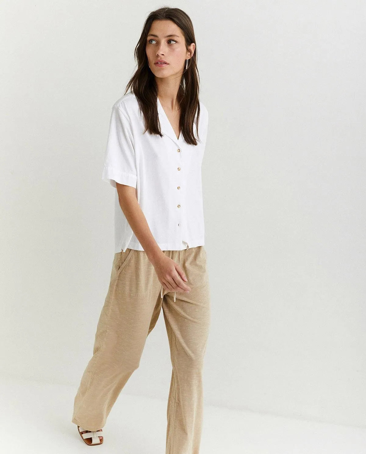 Pantalones flamé fluidos. Cintura media. Corte recto. Cintura elástica con cierre de lazo. Bolsillos laterales. Composición: Frontal: 100 % algodón. Trasera: 60 % lino, 40 % algodón. Altura modelo 175 cm, talla S.