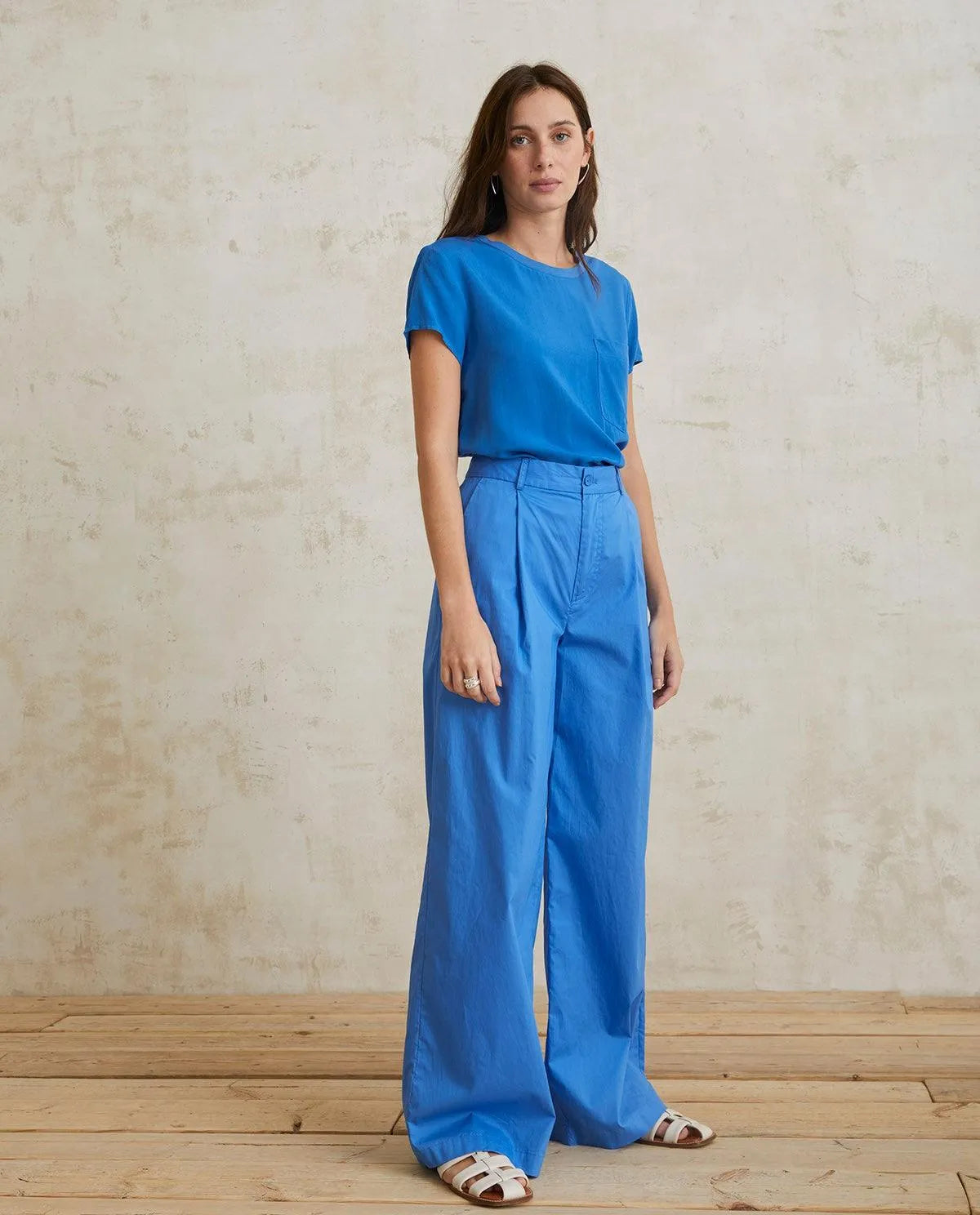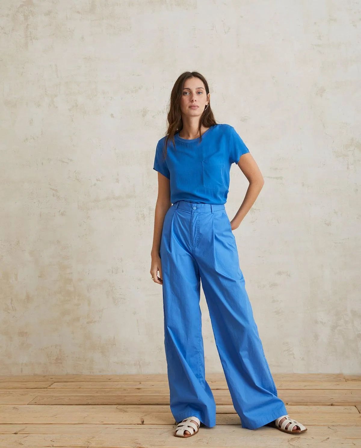 Pantalones wide leg. Cintura alta con detalle de pinzas. Trabillas en la cintura. Tejido de popelín. Cierre frontal con cremallera, botón interior y gancho metálico.