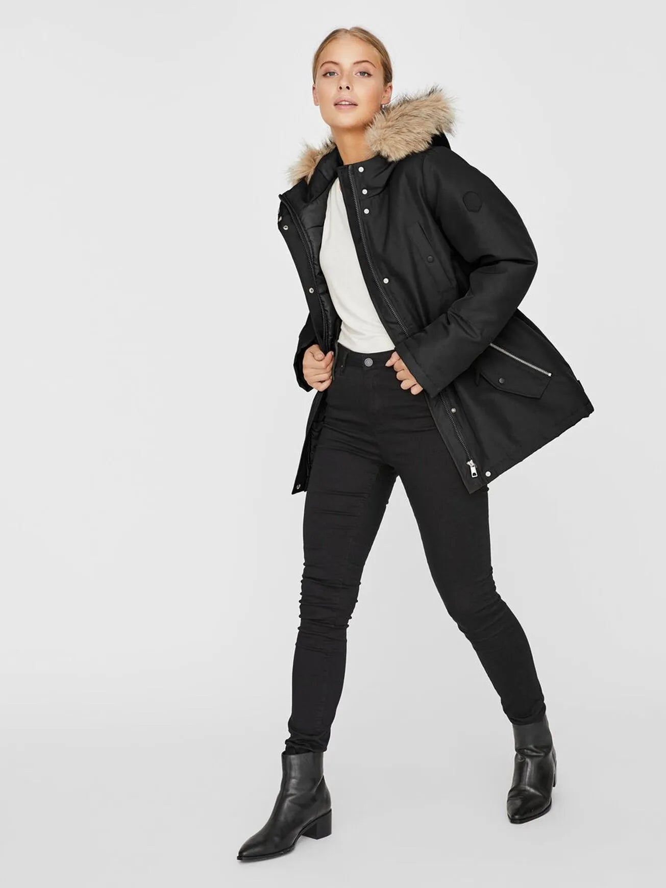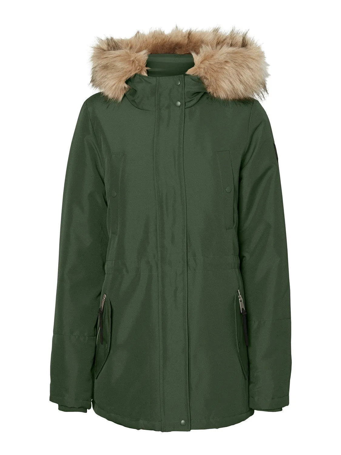 Abrigo largo parka con capucha con pelo sintético extraíble. El abrigo tiene cordones ocultos en la cintura y bolsillos con cremallera y cierre de botón a presión. Use el abrigo con un par de botas de invierno gruesas. De esta manera, se mantiene abrigado y con estilo cuando hace frío afuera.