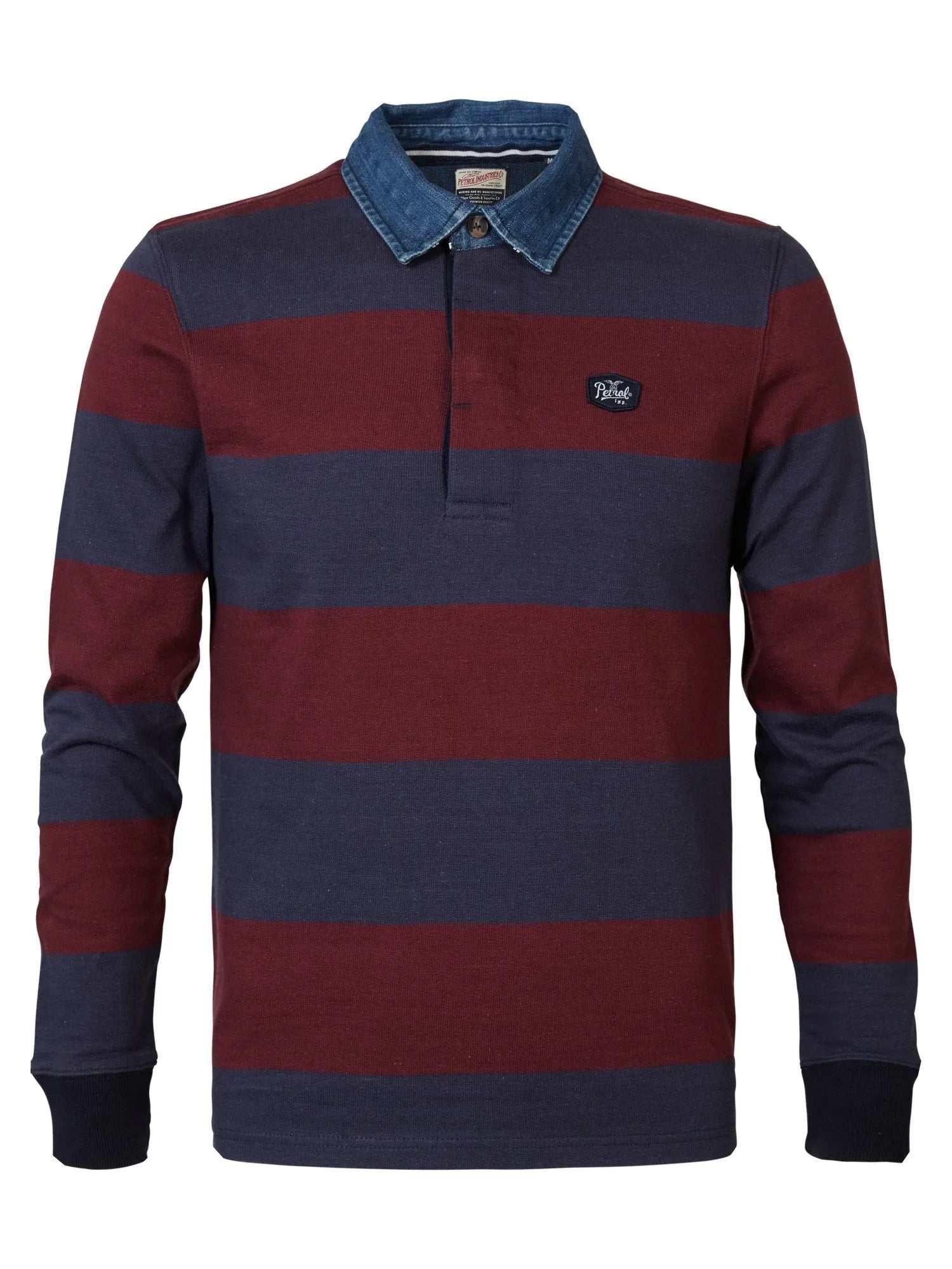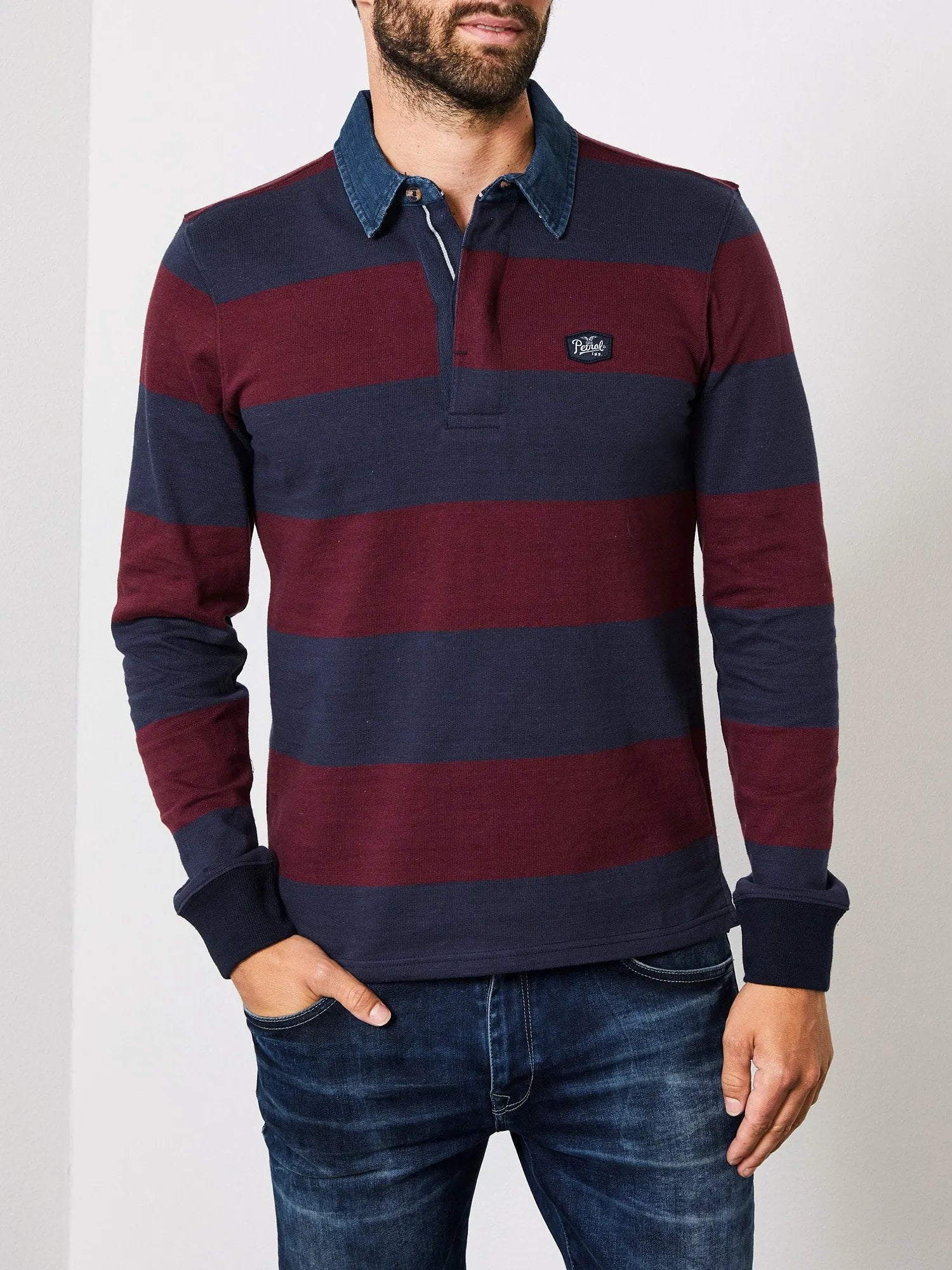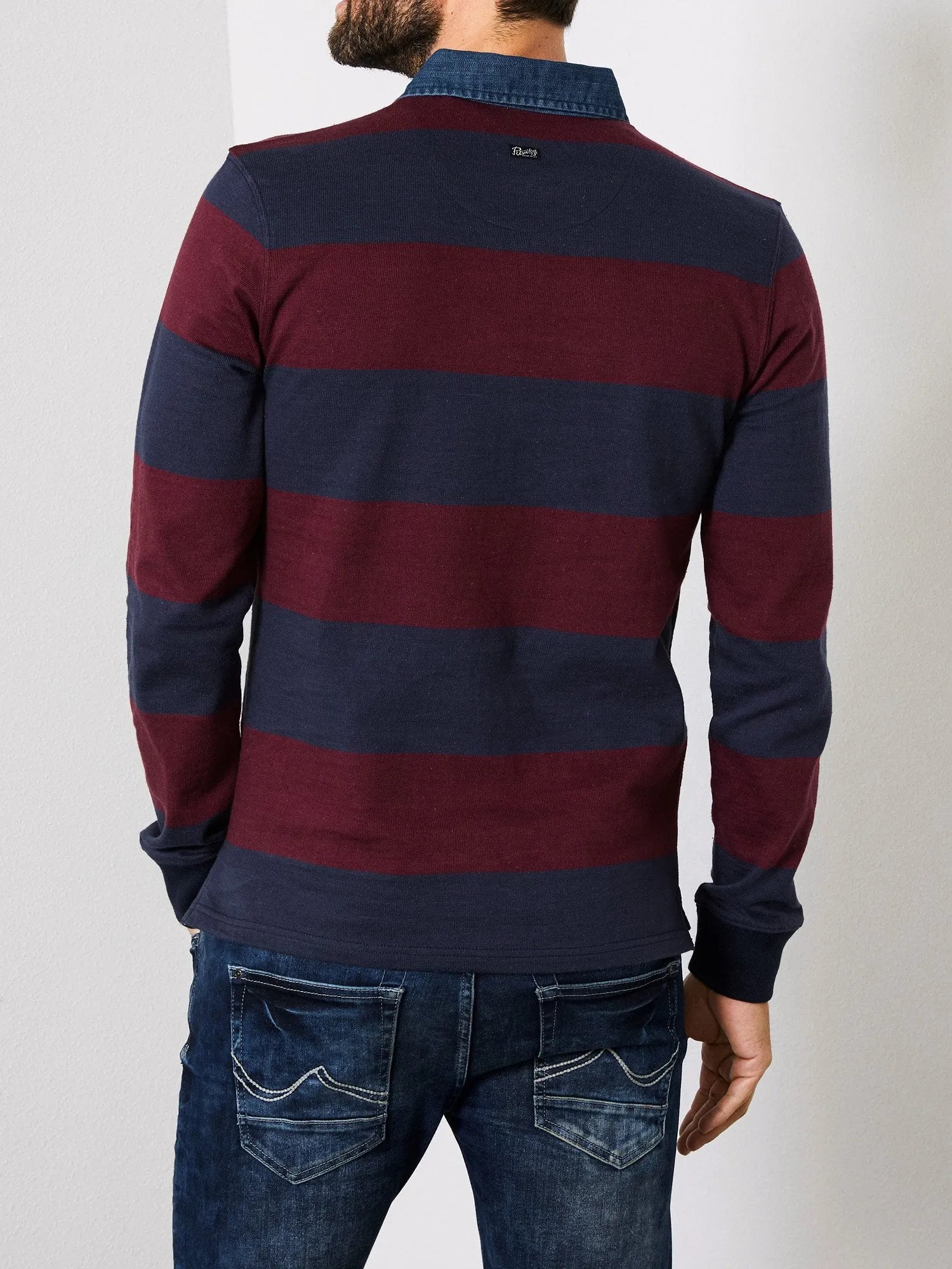 Polo de manga larga tipo rugby a rayas con cuello vaquero.