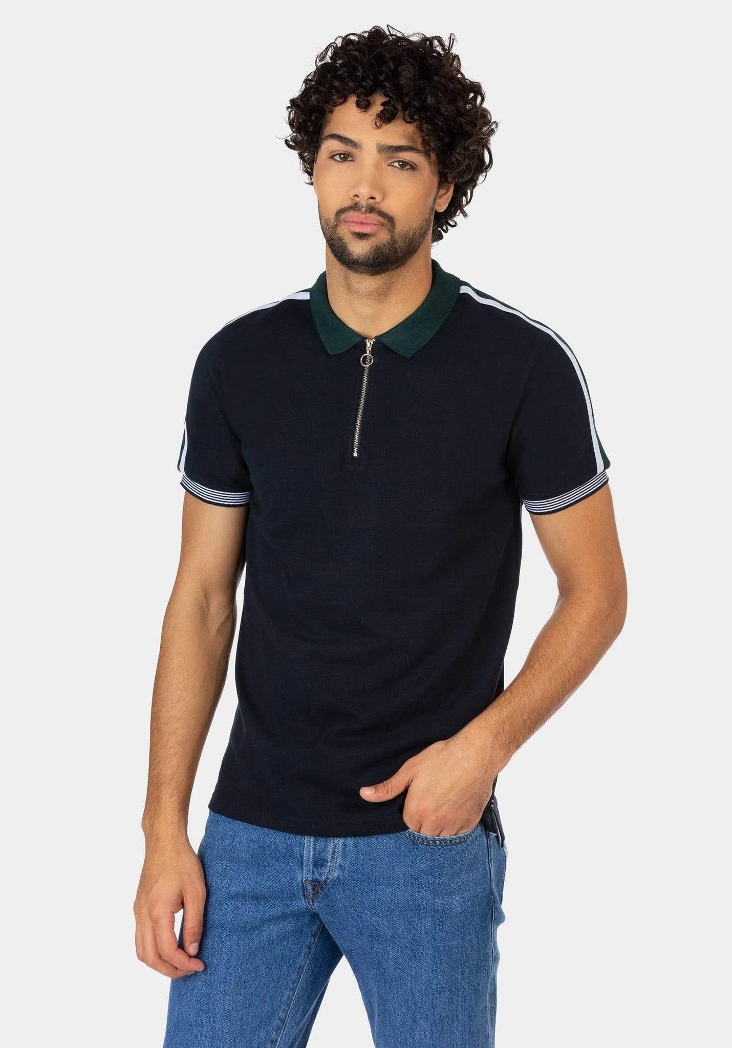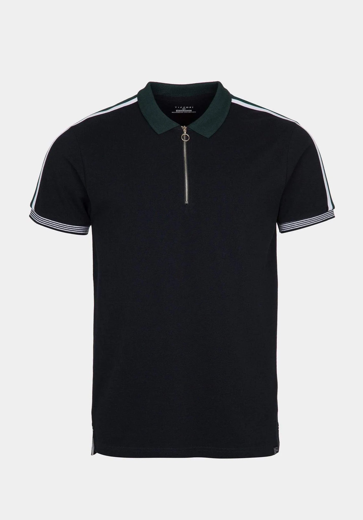 Polo de cuello solapa y manga corta acabada en rib. Cierre frontal con cremallera. Bajo con aberturas laterales.