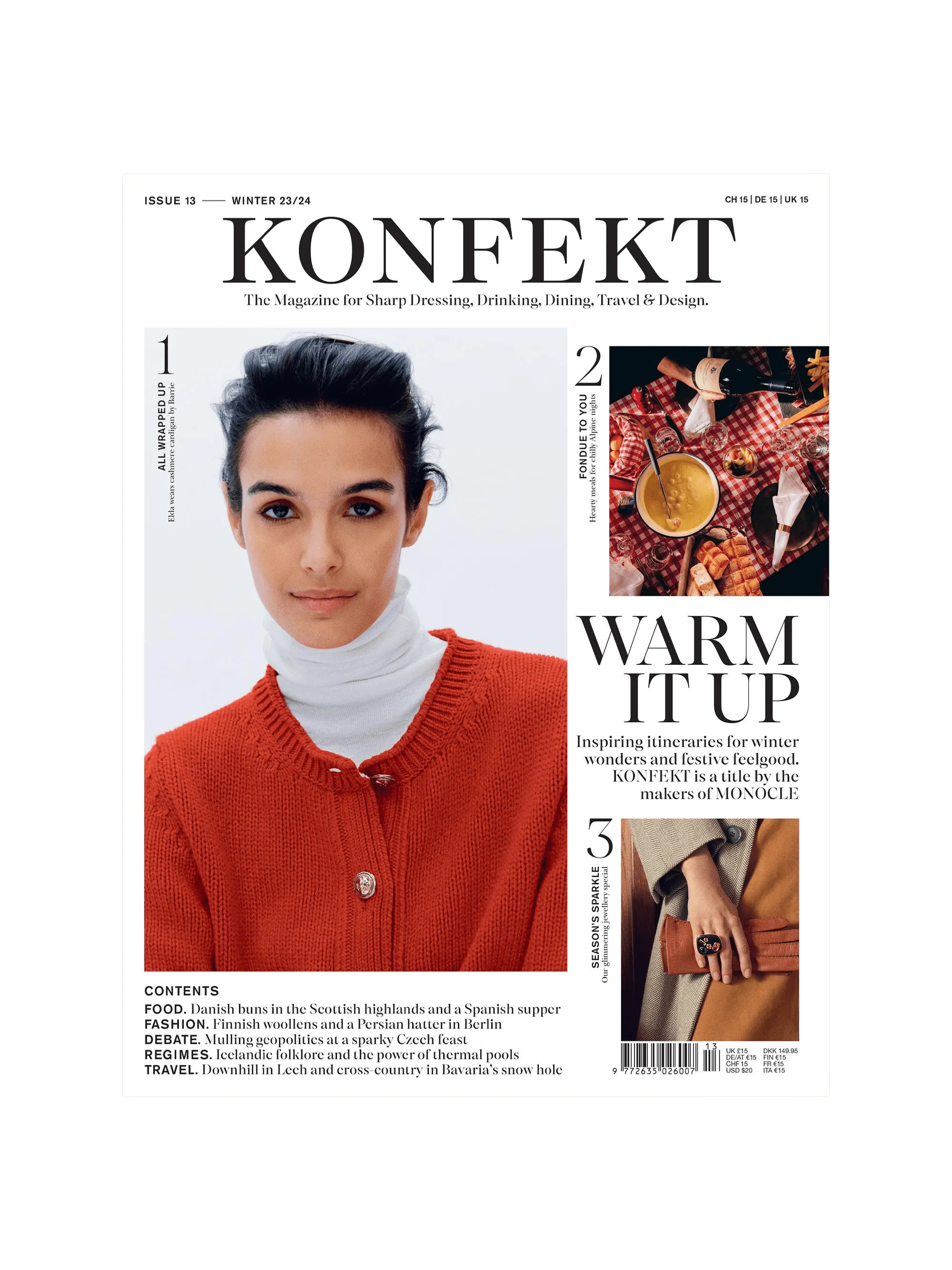 Afuera hace un frío que pela: déjete invitar por el número de invierno de Konfekt. Disfruta del brillo de las fiestas con nuestro primer especial de joyas y déjanos recomendarte regalos y decoraciones, ya sean estrellas de paja lituanas, coronas francesas o dulces suizos. Ya sea en descenso o campo a través, le guiaremos dentro y fuera de las pistas en las nevadas estaciones alpinas y subiremos al Himalaya en un reportaje nepalí. Desde los abrigos de lana finlandeses hasta las surrealistas creaciones de un sombrerero iraní, nuestras selecciones de moda le prepararán para toda una temporada de paseos a paso ligero, abrigo y elegante alojamiento.