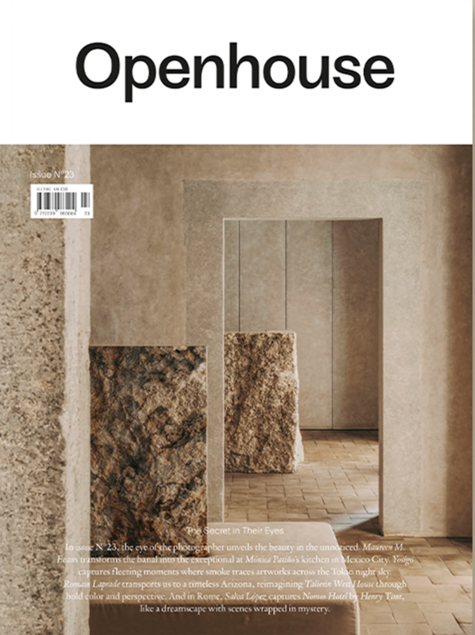 En el número 23, el ojo del fotógrafo desvela la belleza en lo desapercibido. Maureen M. Evans transforma lo banal en excepcional en la cocina de Mónica Patiño en Ciudad de México. Yosigo captura momentos fugaces en los que el humo traza obras de arte en el cielo nocturno de Tokio. Romain Laprade nos transporta a una Arizona atemporal, reimaginando la Casa Taliesin West a través de colores y perspectivas audaces. Y en Roma, Salva López captura Nomos Hotel de Henry Timi, como un paisaje onírico con escenas envueltas en misterio.