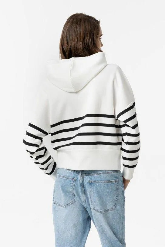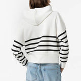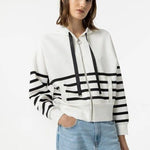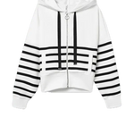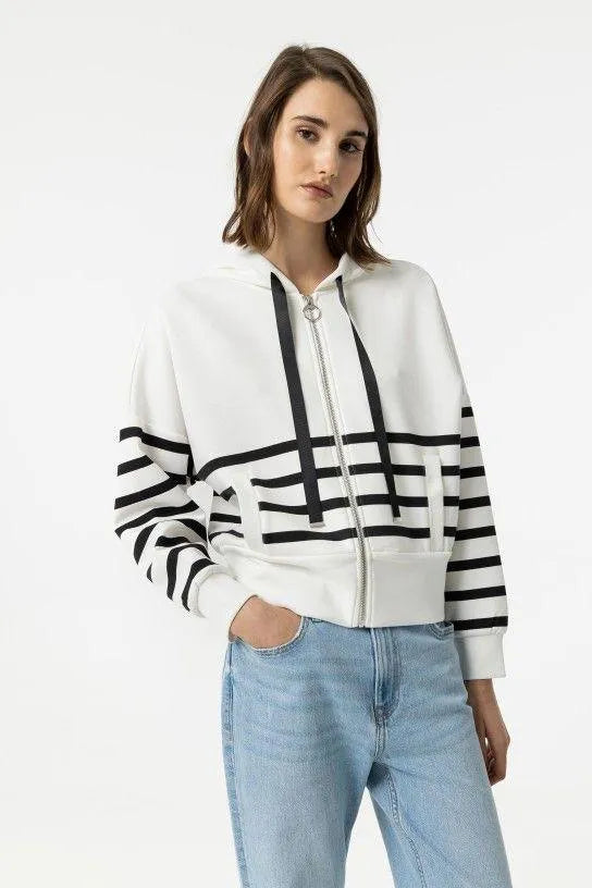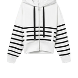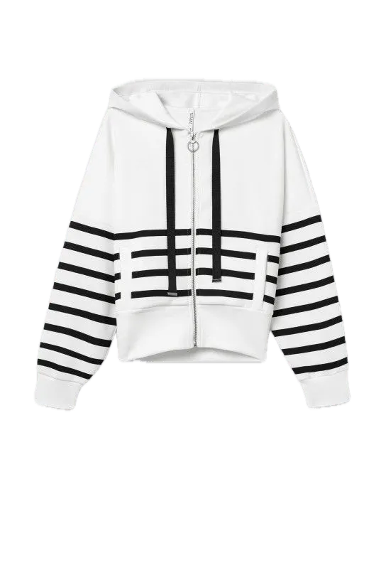 Sudadera a rayas en color blanco y negro, con cremallera y capucha.
