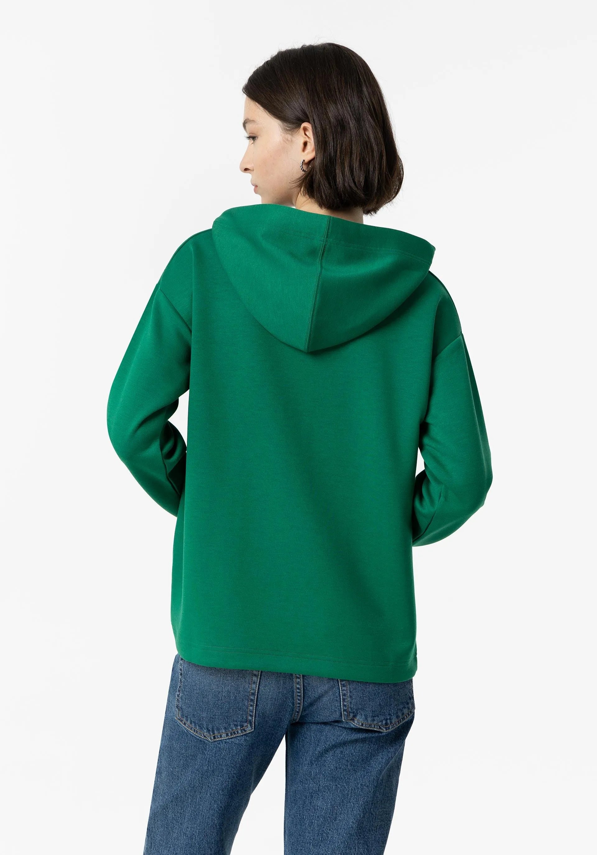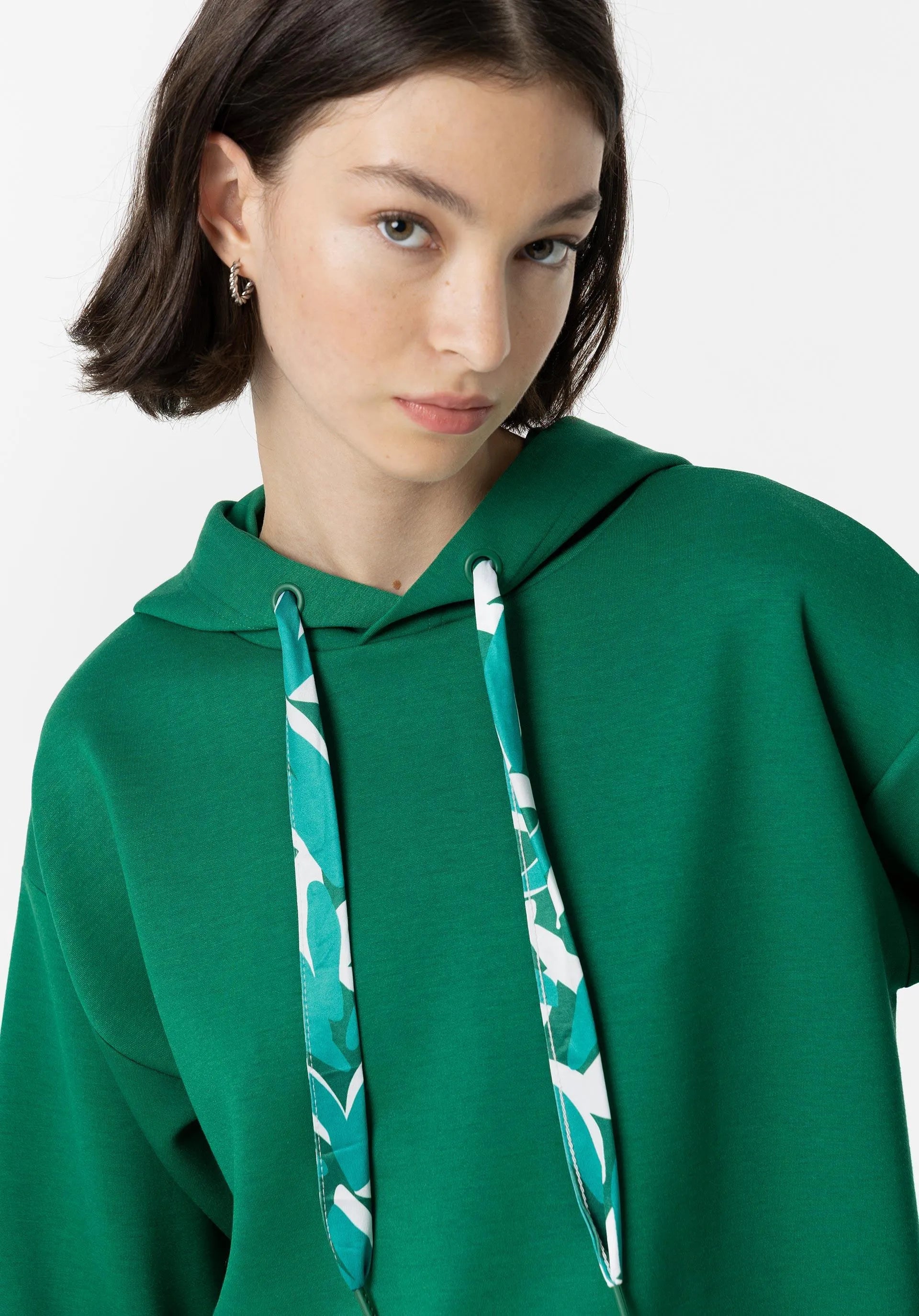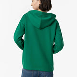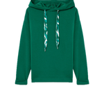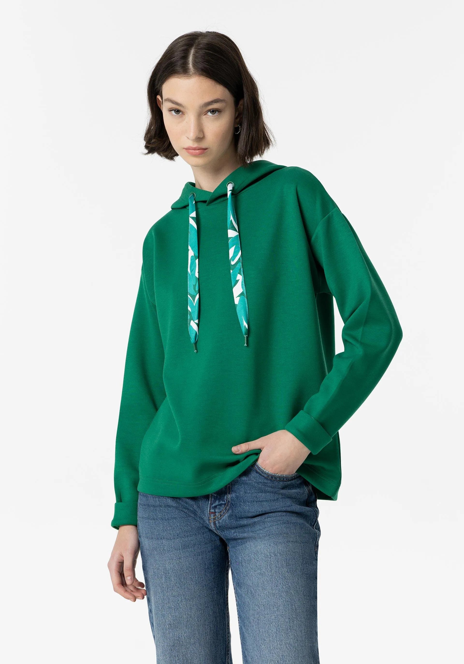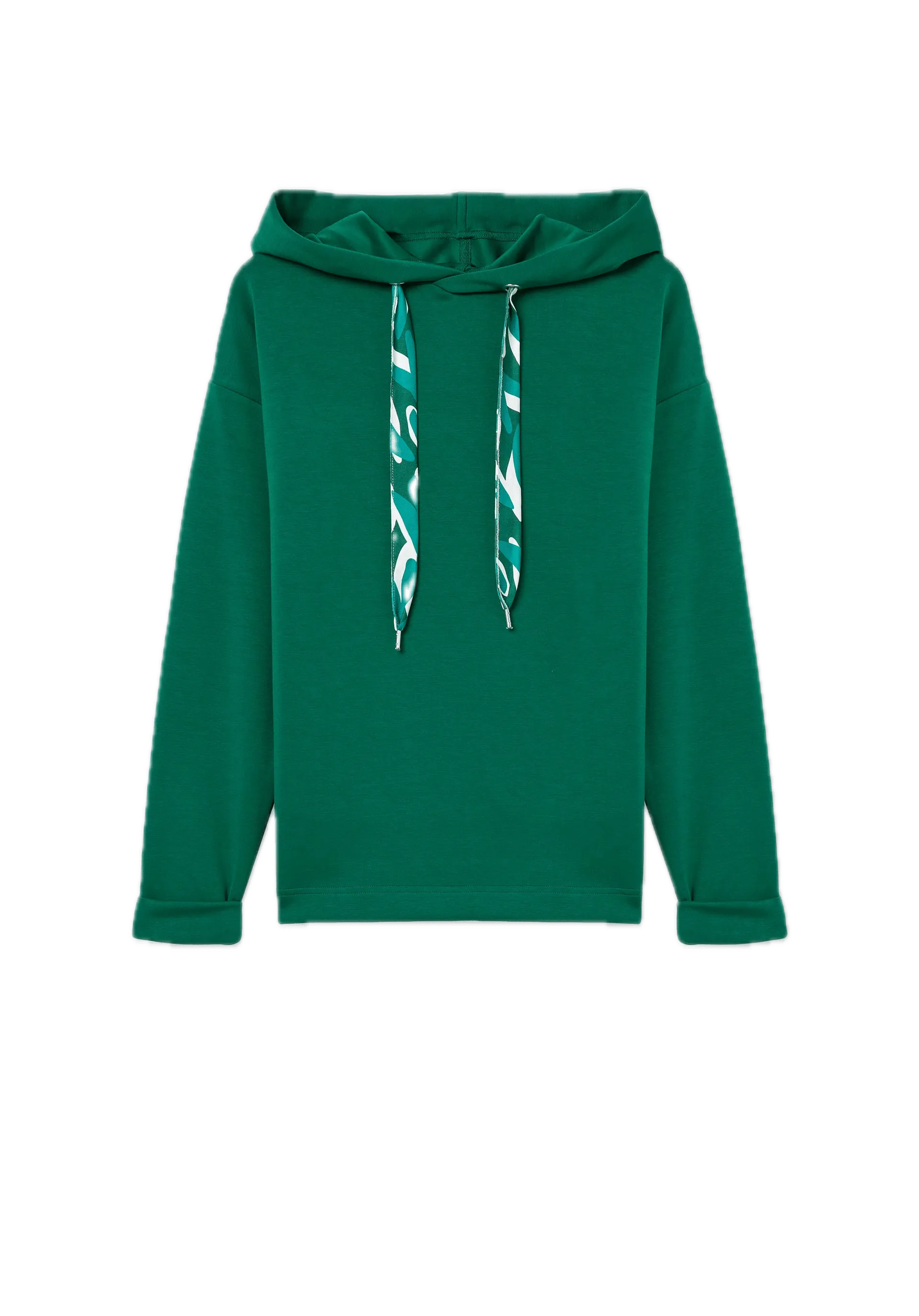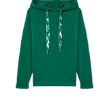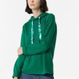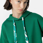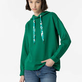 Sudadera en color verde con capucha con cordón estampado ajustable y manga larga acabada con vuelta.