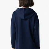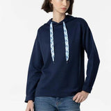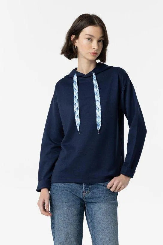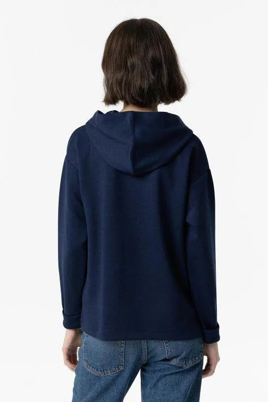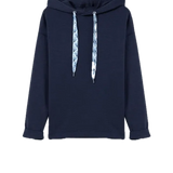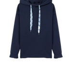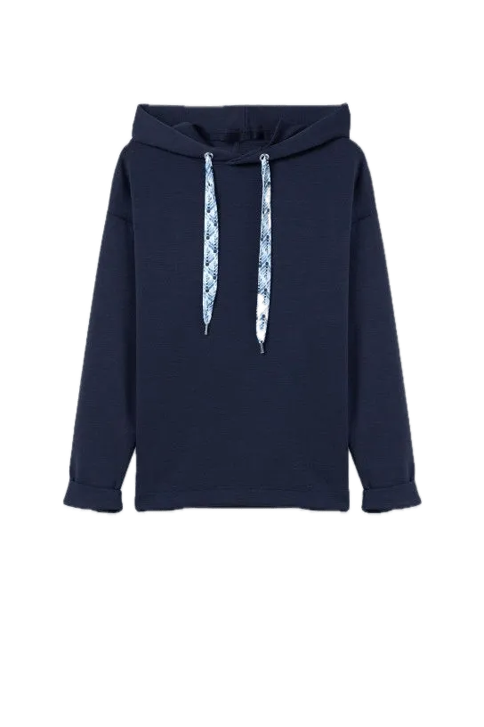 Sudadera en color azul marino con capucha con cordón estampado ajustable y manga larga acabada con vuelta.