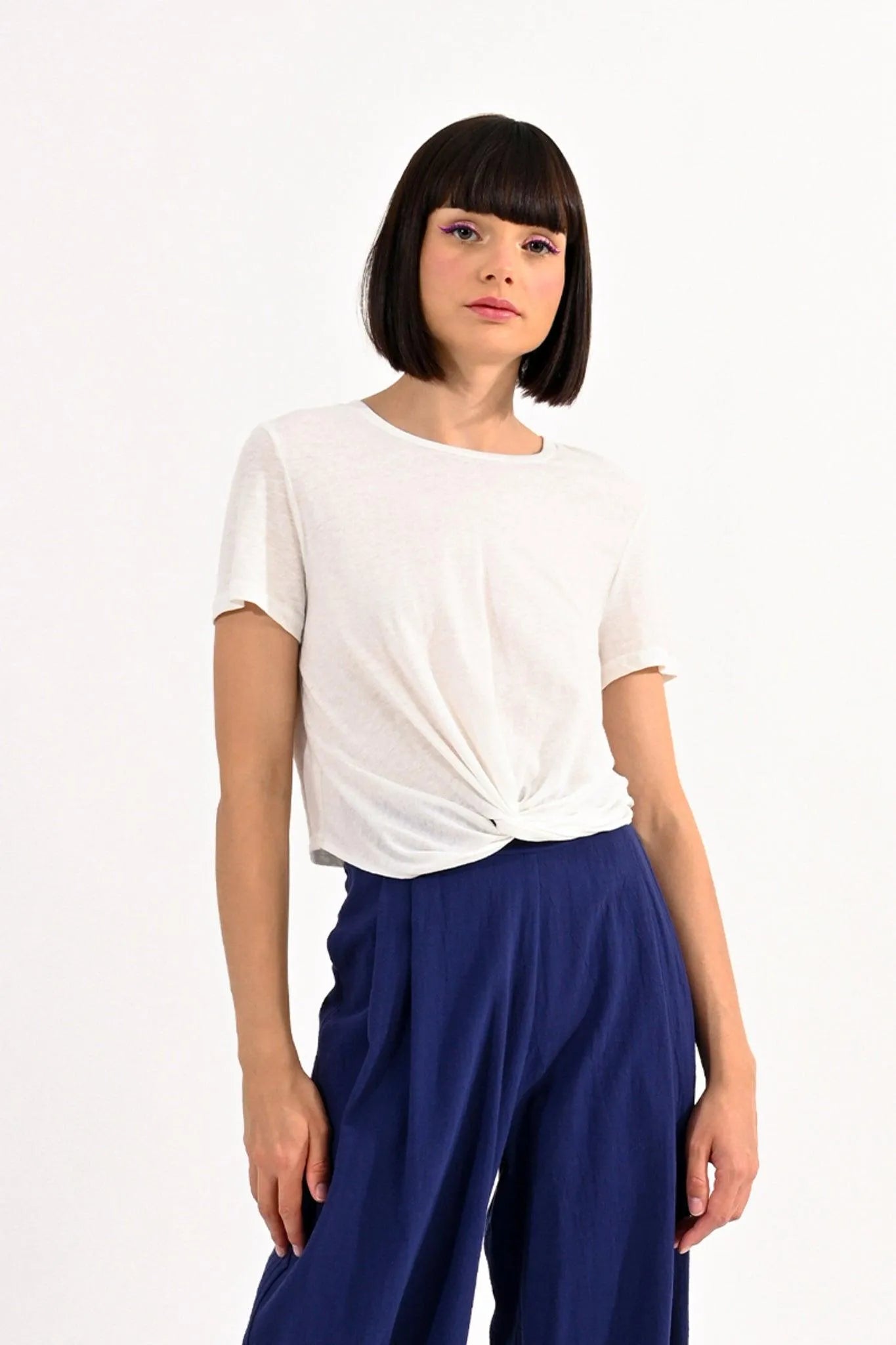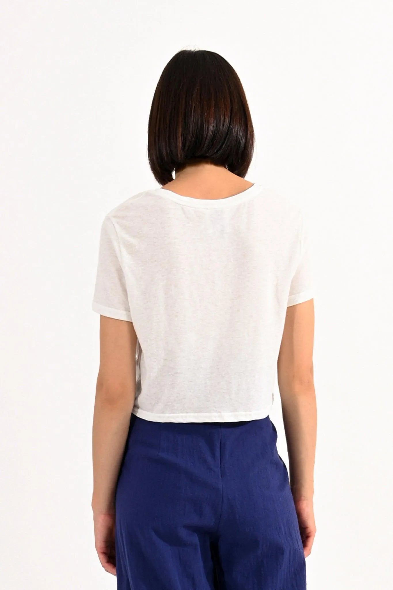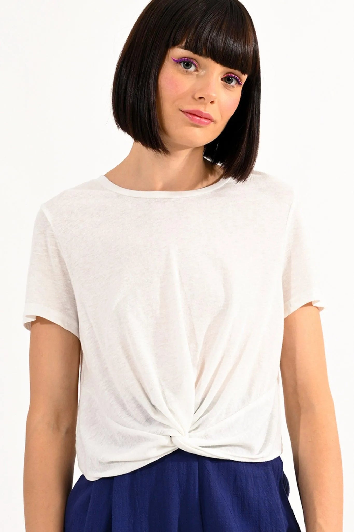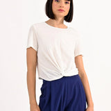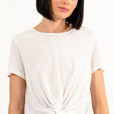 Camiseta corta de algodón jaspeado, detalle de lazo en la parte delantera. Largo: 47cm Talla S