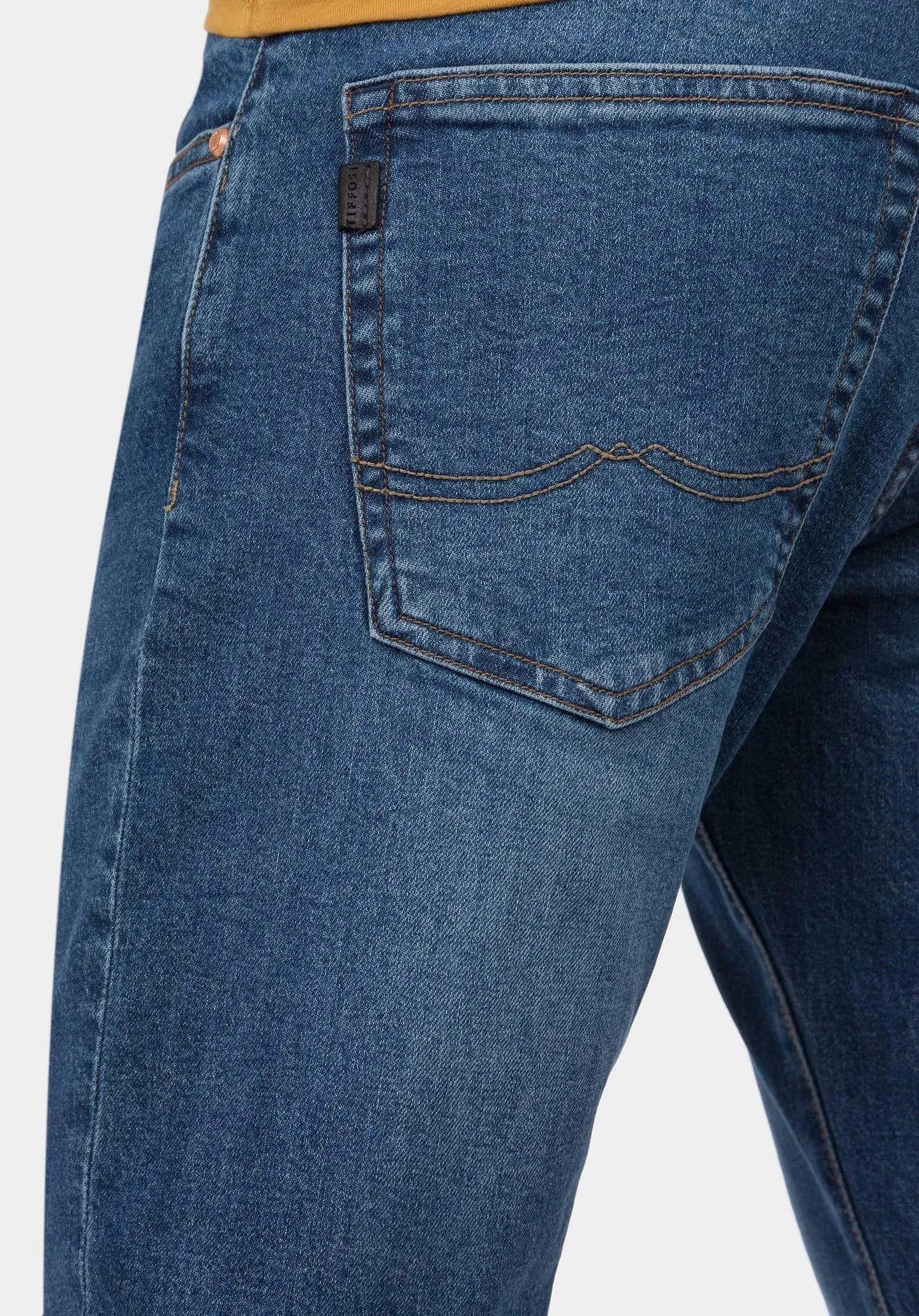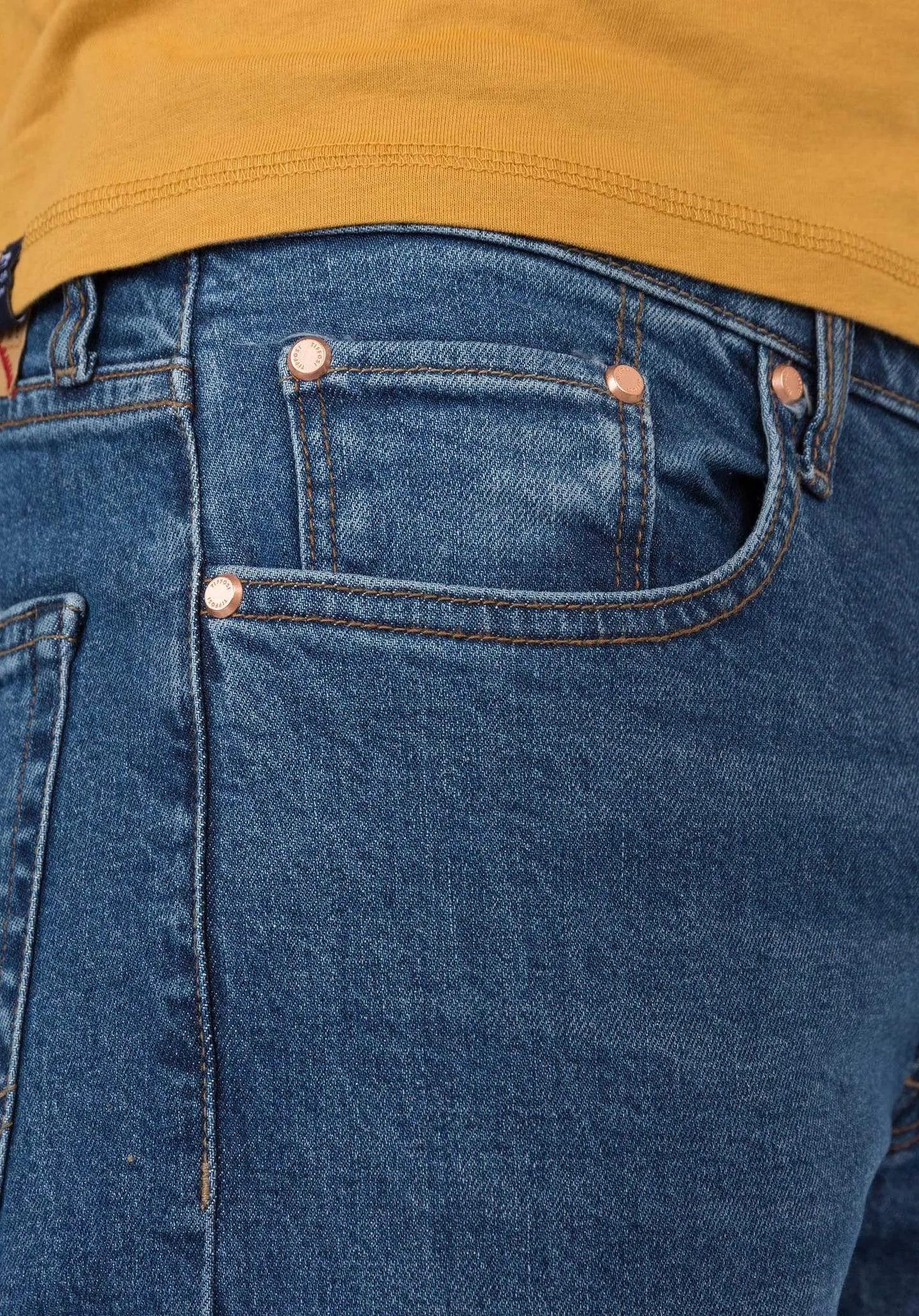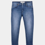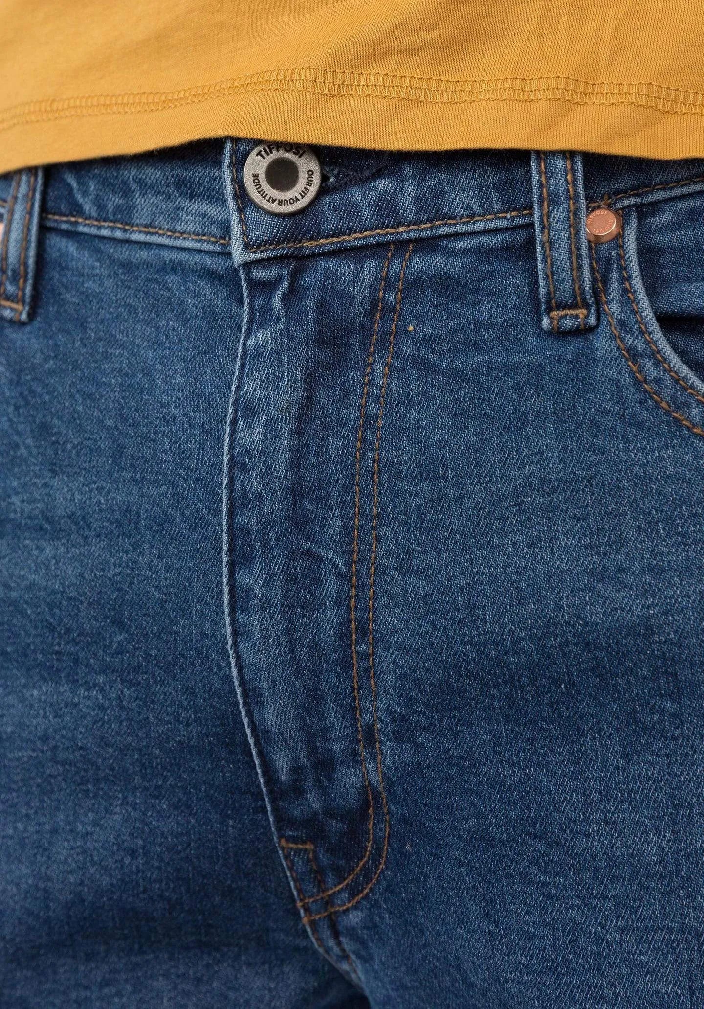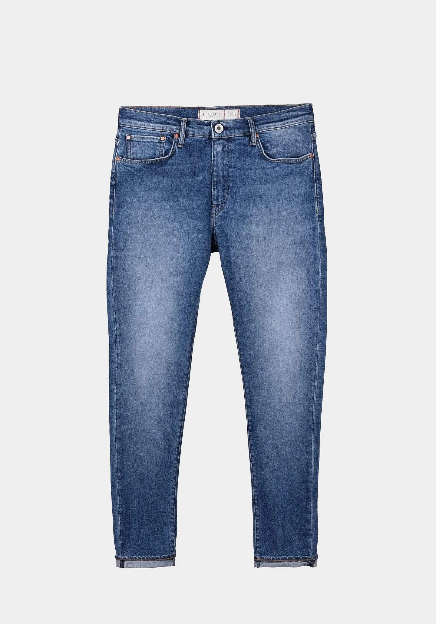 Jeans con cinco bolsillos. Cierre frontal con cremallera y botón metálico. Efecto lavado.