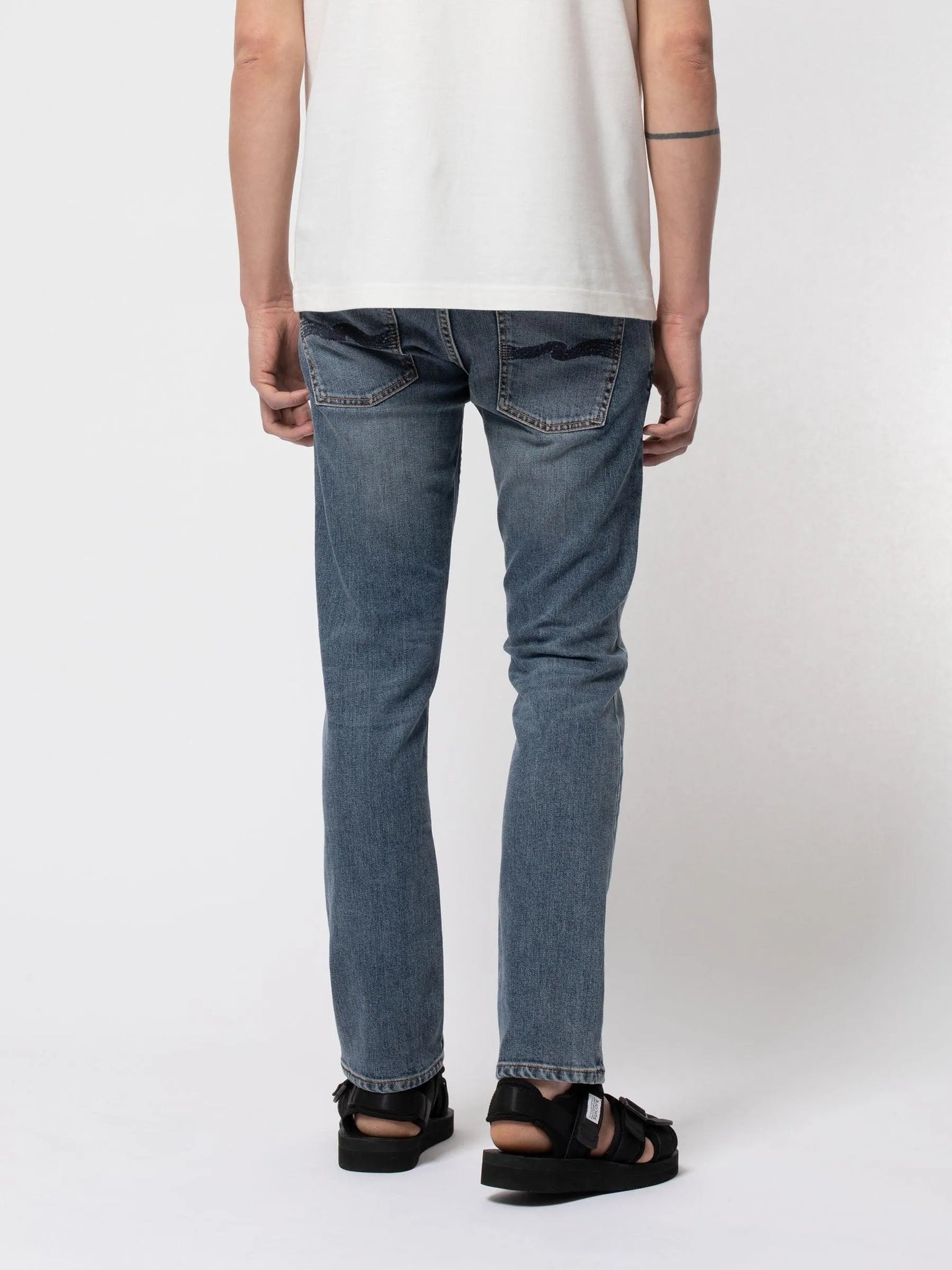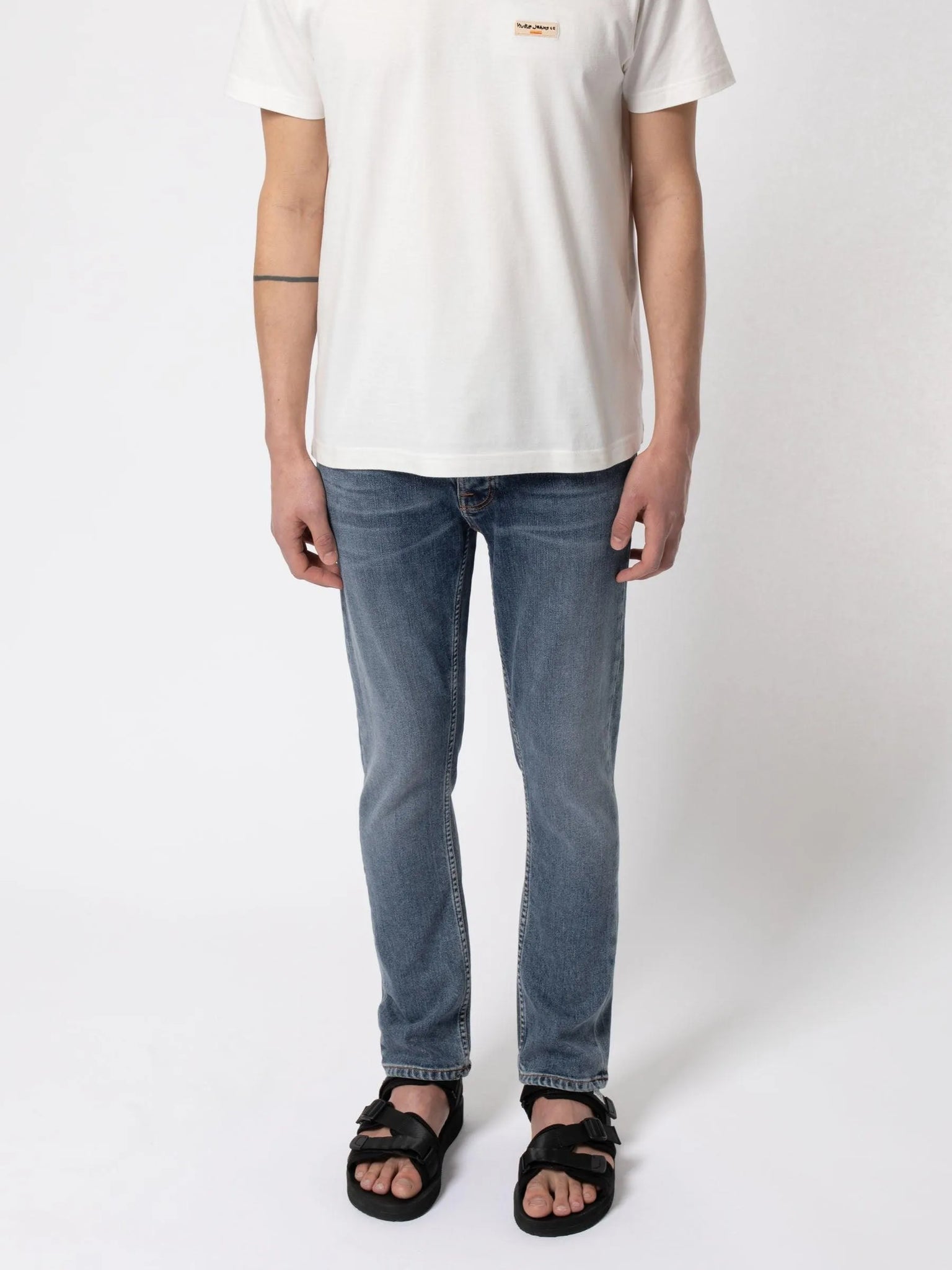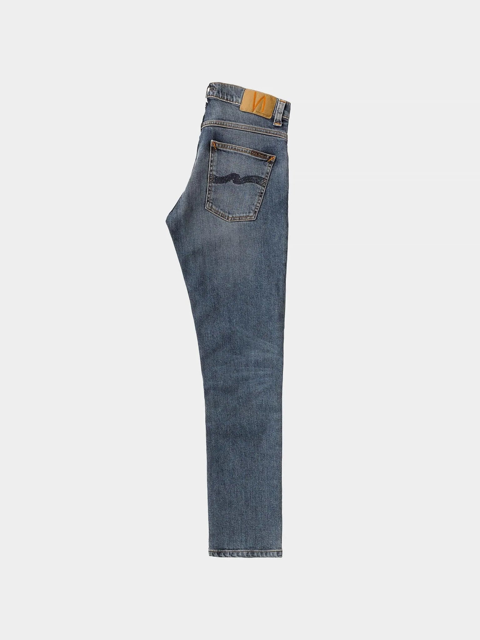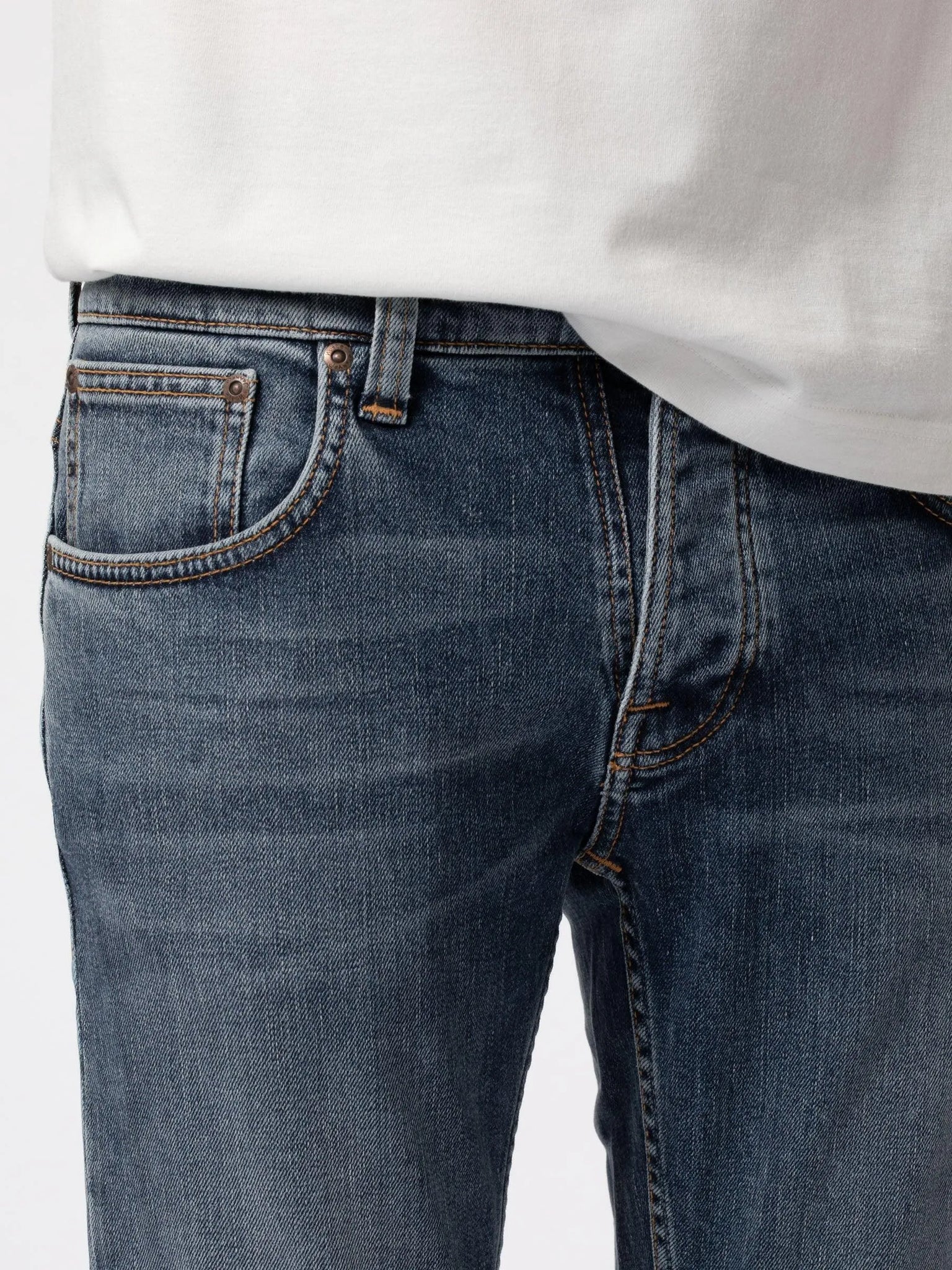Vaqueros slim fit de cintura media con pierna recta confeccionados en denim elástico de confort orgánico. Estos jeans se han lavado a un tono azul medio con suaves abrasiones y sutiles marcas de desgaste. Con su clásico lavado y bordado en el bolsillo trasero azul marino, estos jeans son limpios y, por supuesto, aptos para cualquier ocasión.