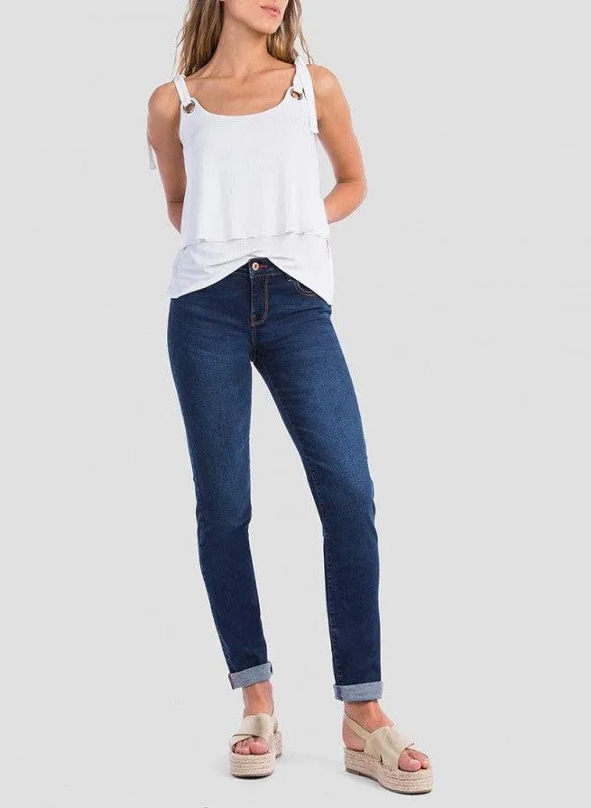 Los vaqueros Lauren se caracterizan por su tiro o cintura alta y su pierna slim o skinny.
