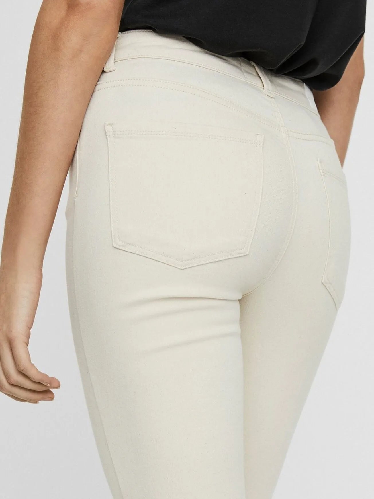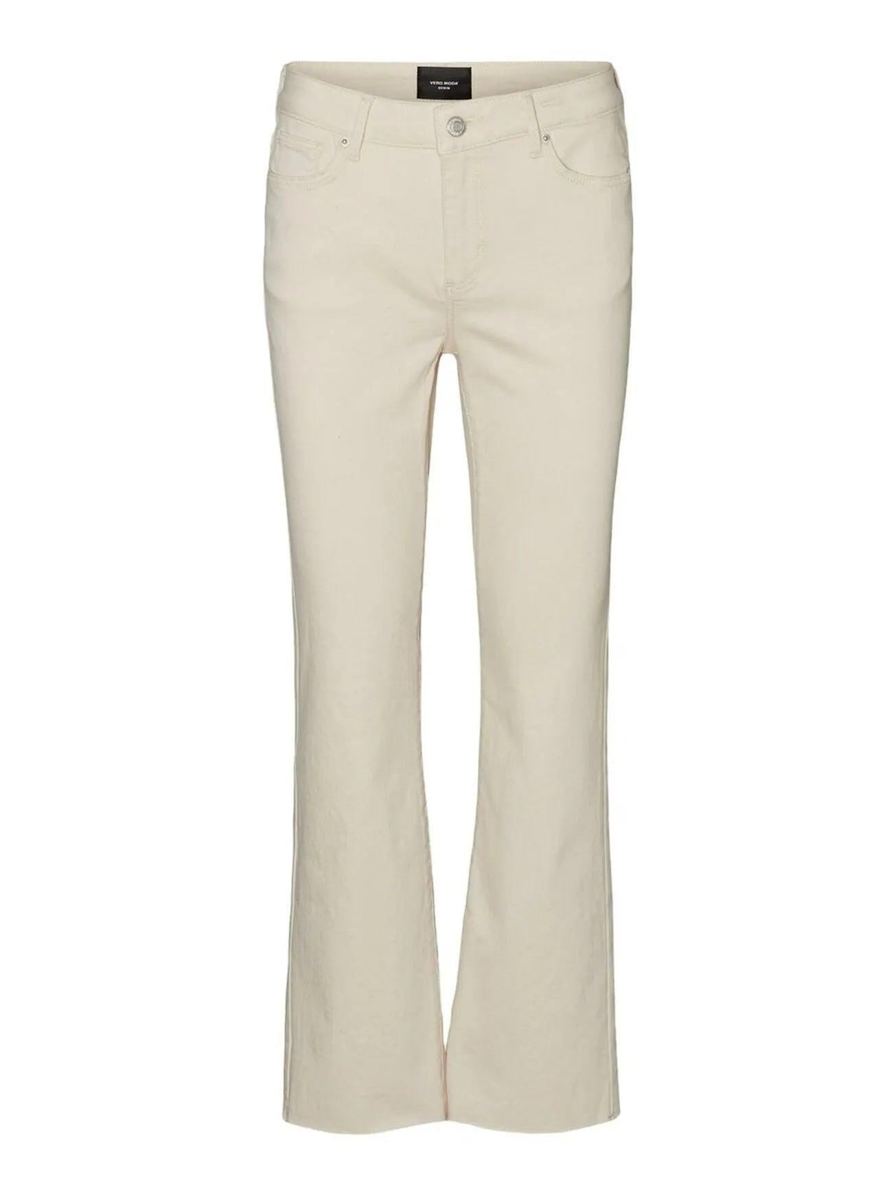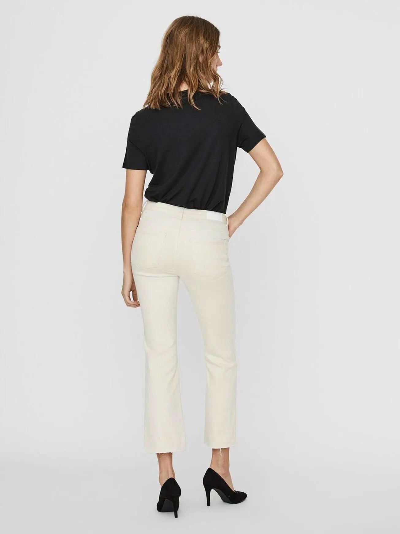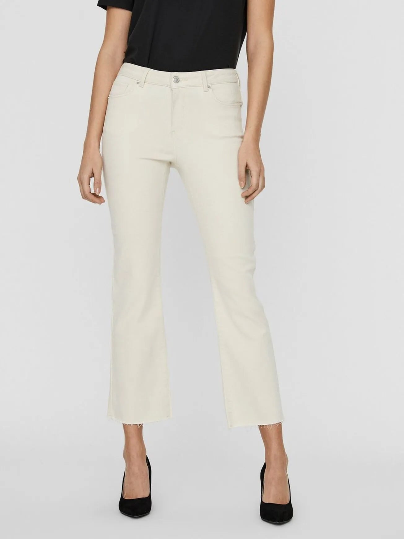Jeans con piernas acampanadas, cintura normal, cinco bolsillos y tobillos deshilachados. Diseña los jeans con una blusa femenina y un par de botas de tacón alto.