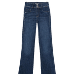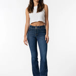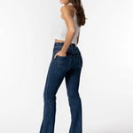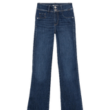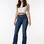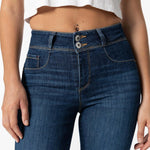 Jeans flare de tiro alto con 3 bolsillos. Cierre frontal con cremallera y botones metálicos. Falsos bolsillos delanteros.