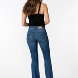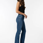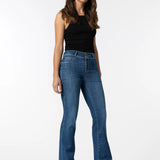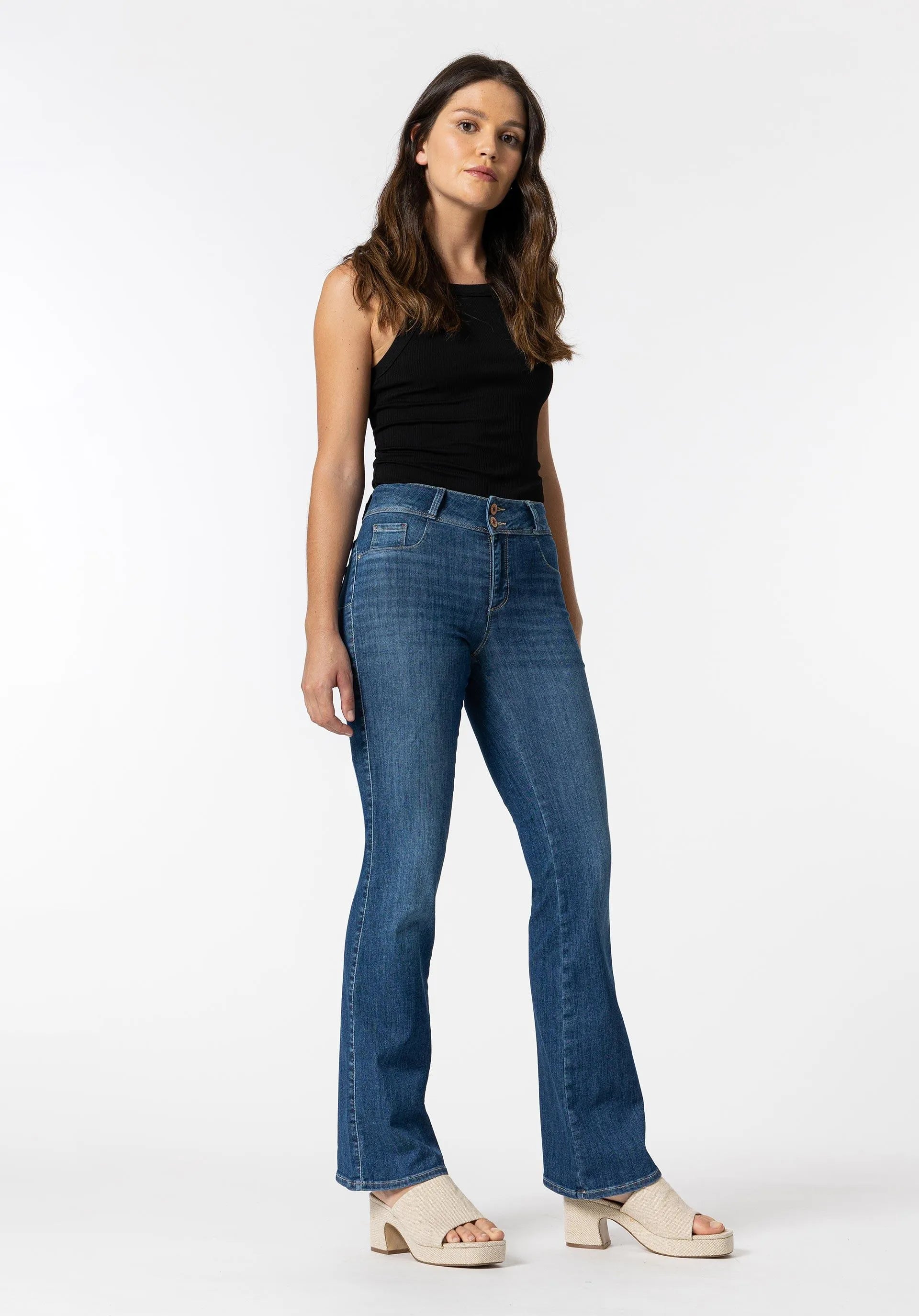 Jeans flare de tiro alto con 3 bolsillos. Cierre frontal con cremallera y botones metálicos. Falsos bolsillos delanteros.