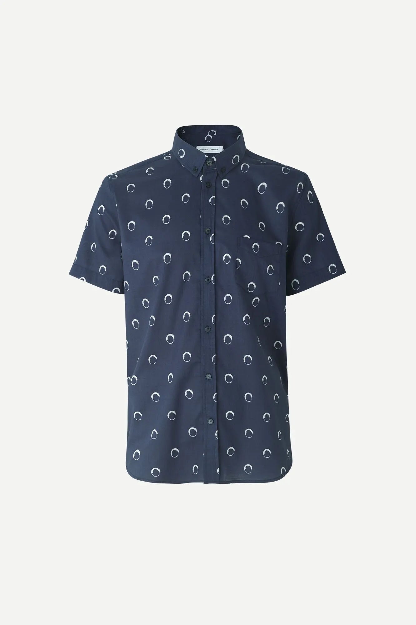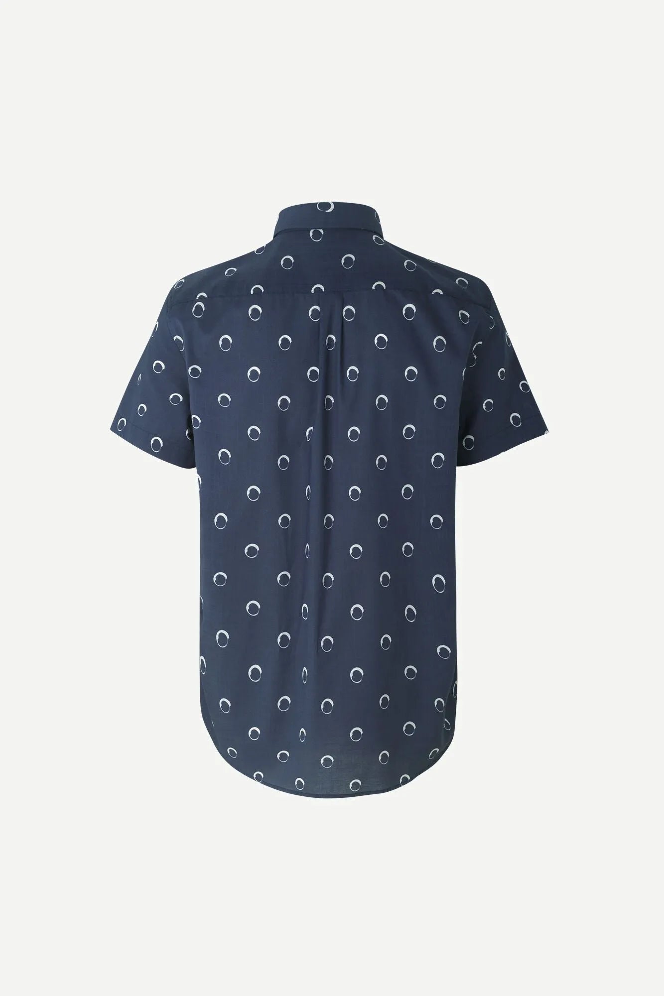 Camisa manga corta. Ajuste regular Cuello abotonado, bolsillo en el pecho, pliegue en el yugo trasero, dobladillo curvo. Tejido ligero 100% algodón con estampado artístico. Acabado de lavado de prendas.