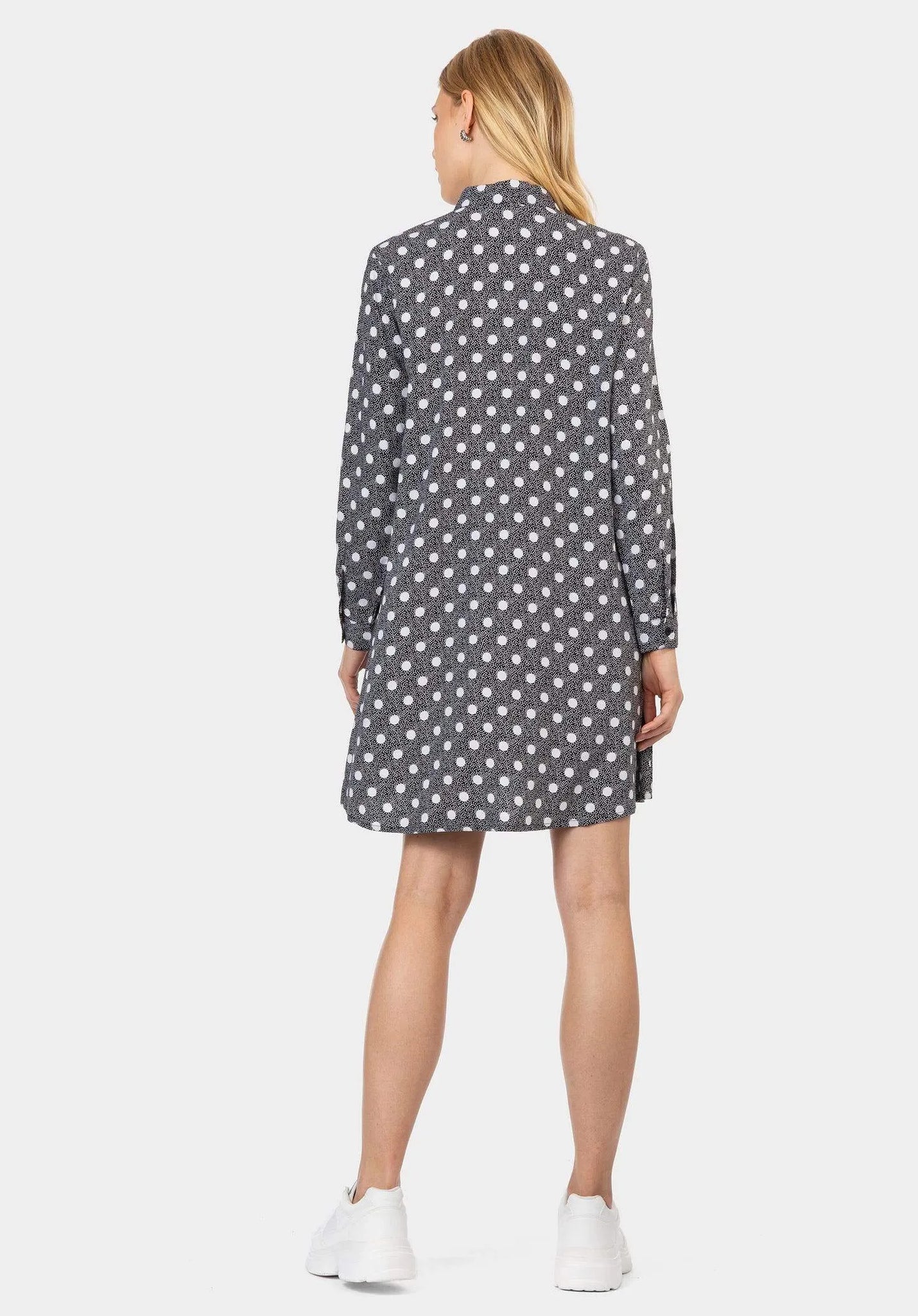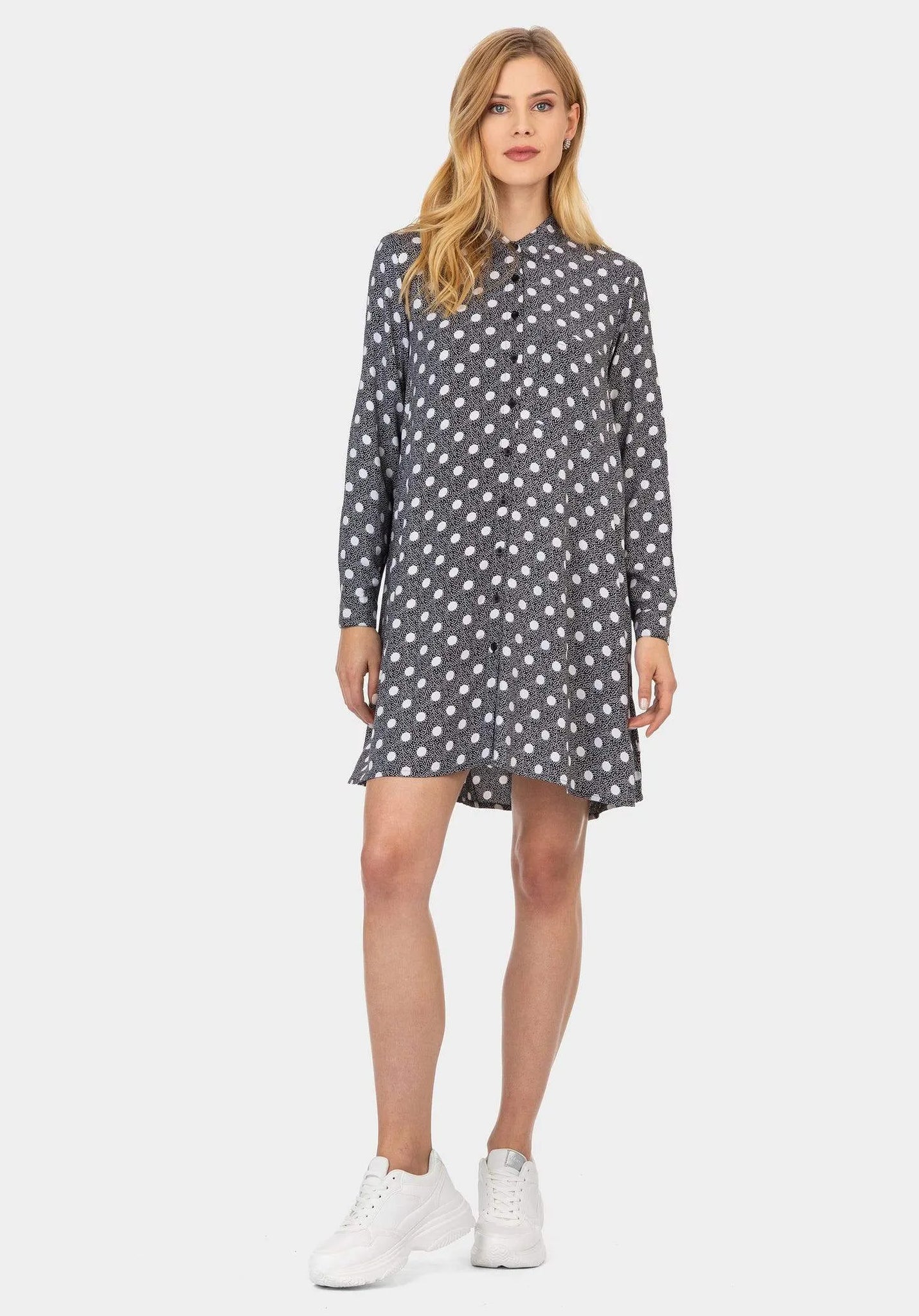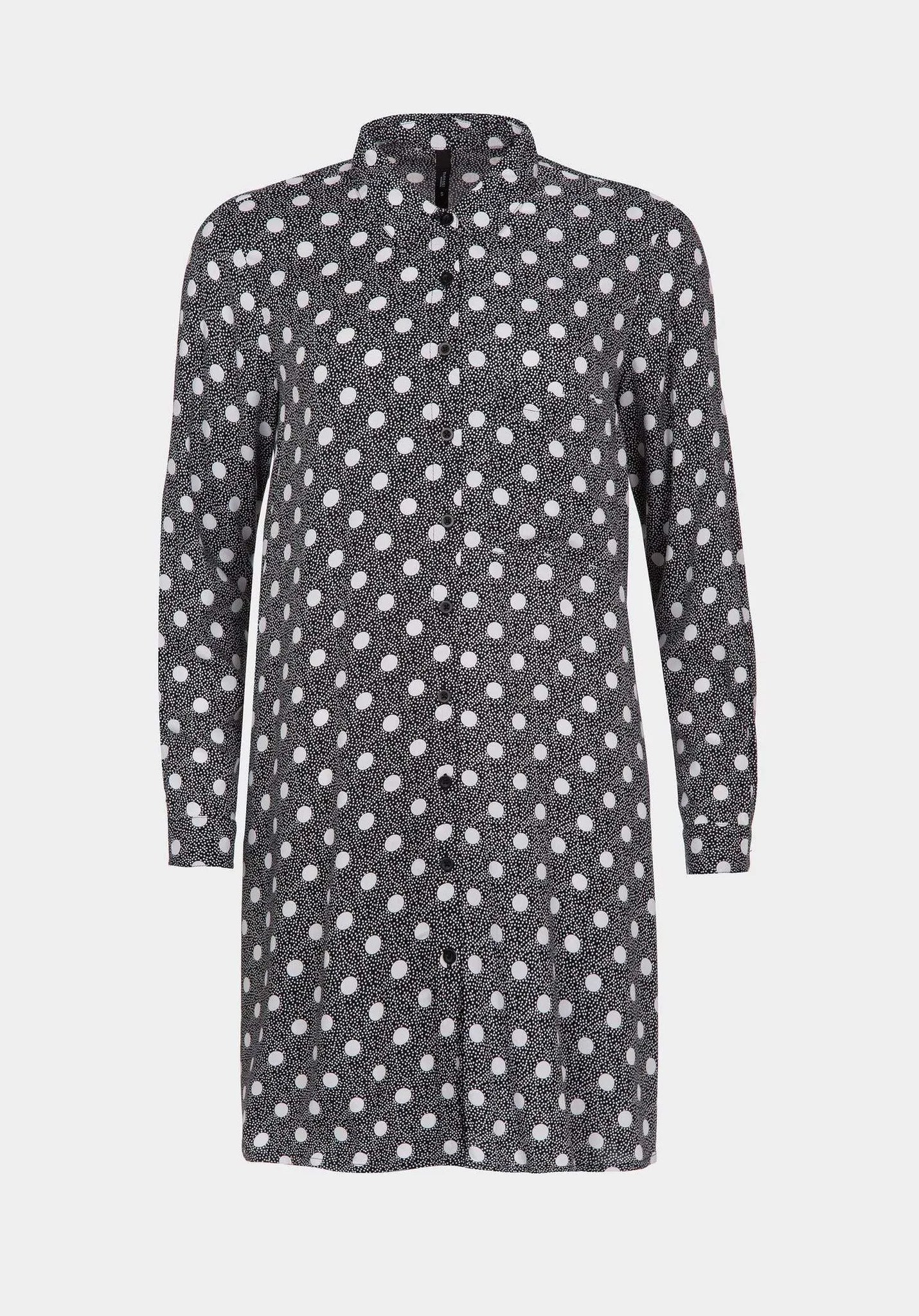 Vestido camisero de lunares con cuello de solapa y manga larga. Bolsillo delantero. Cierre frontal con botones.