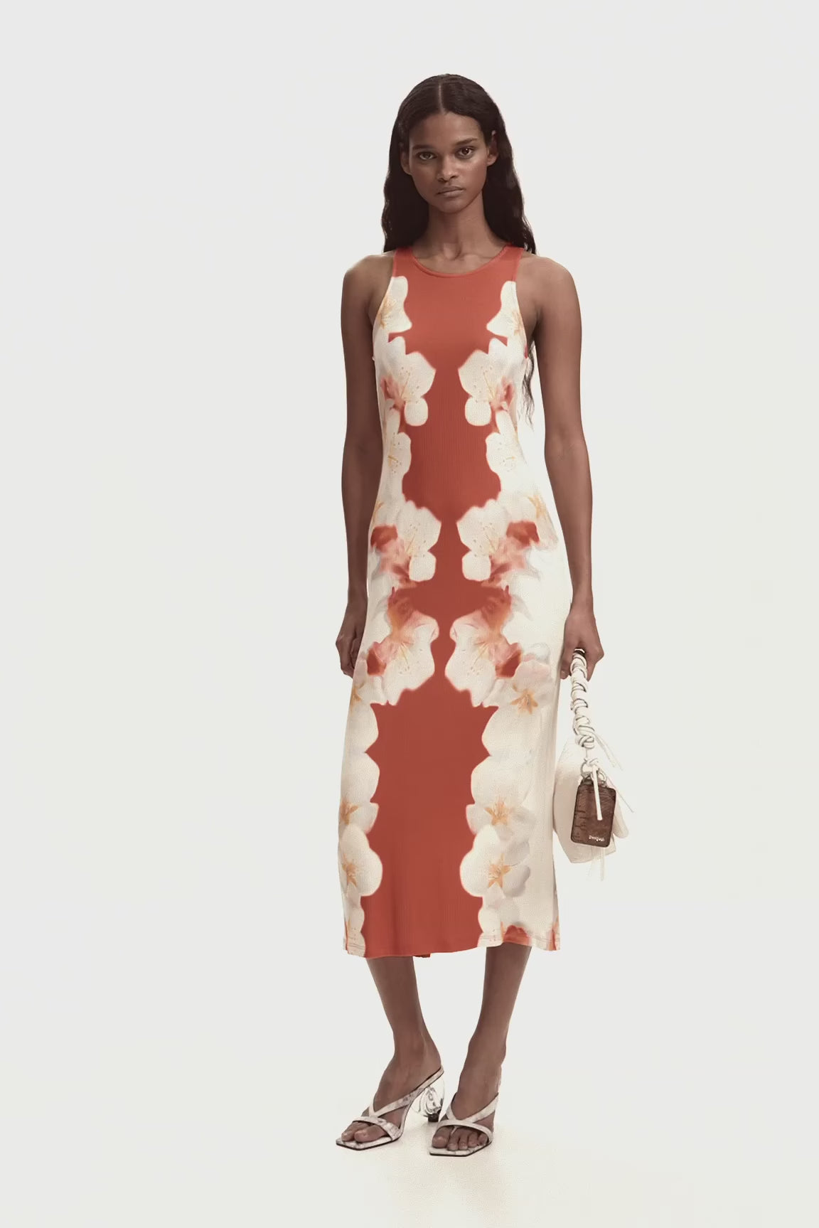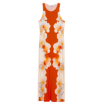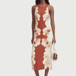 El diseño parte de una construcción muy clara: vestido largo, sin mangas y con escote redondo. La base es sencilla, lo que permite que el estampado floral colocado en los laterales sea el detalle principal y aporte personalidad sin recargar la prenda.