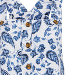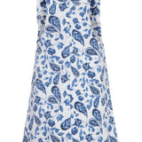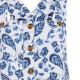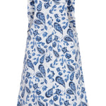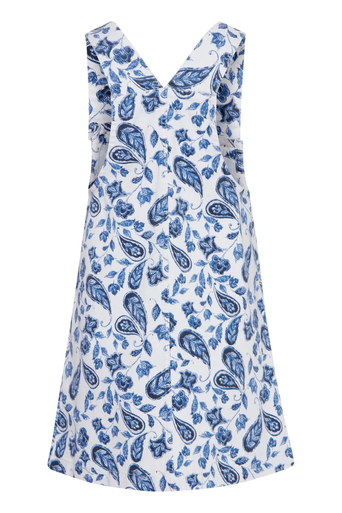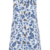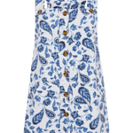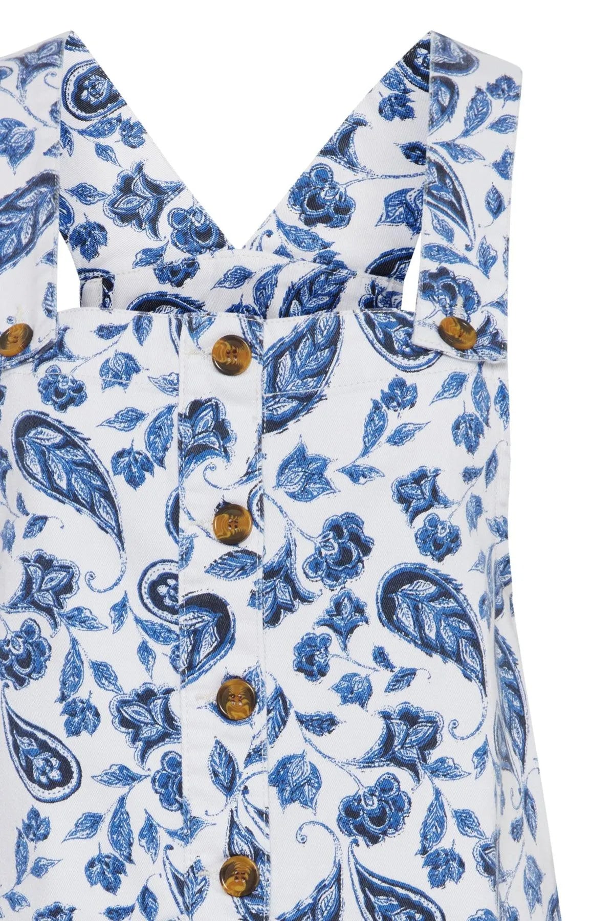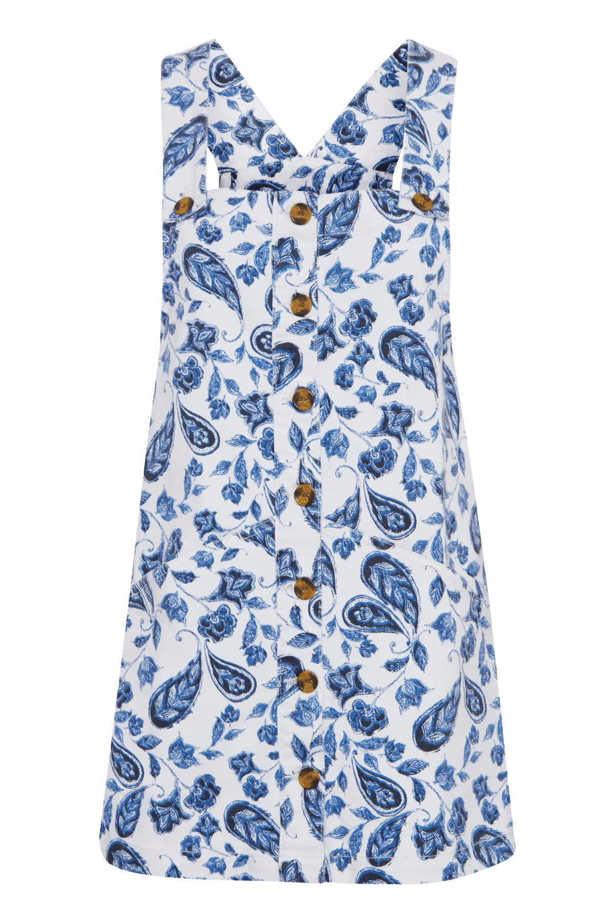 Vestido tipo pichi vaquero con estampado ICHI sobre fondo blanco.