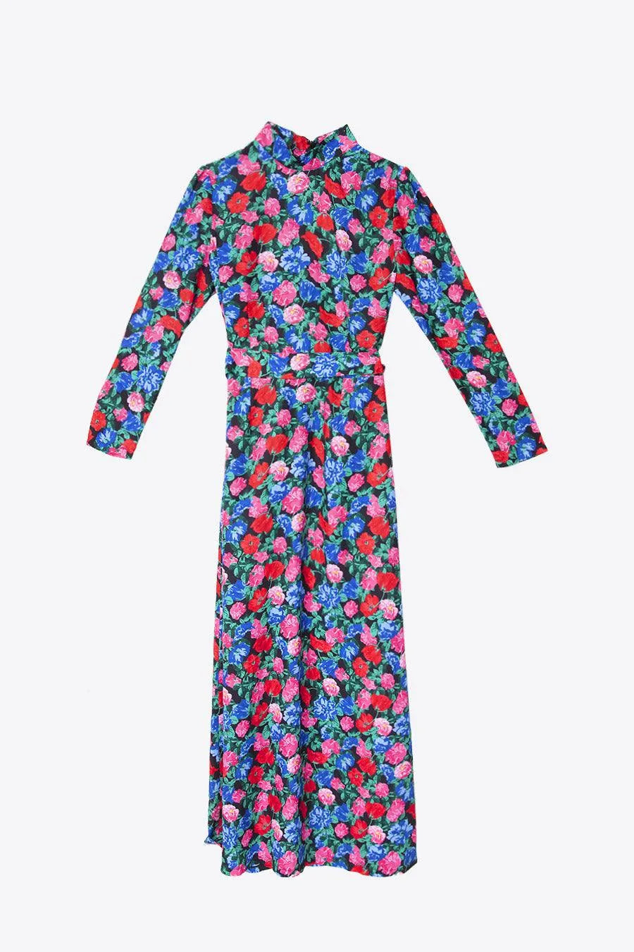 Vestido largo con cuello subido y manga larga. Cierre trasero con cremallera oculta en costura.