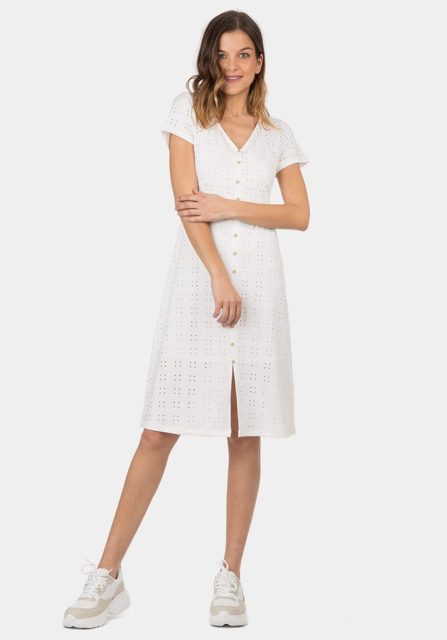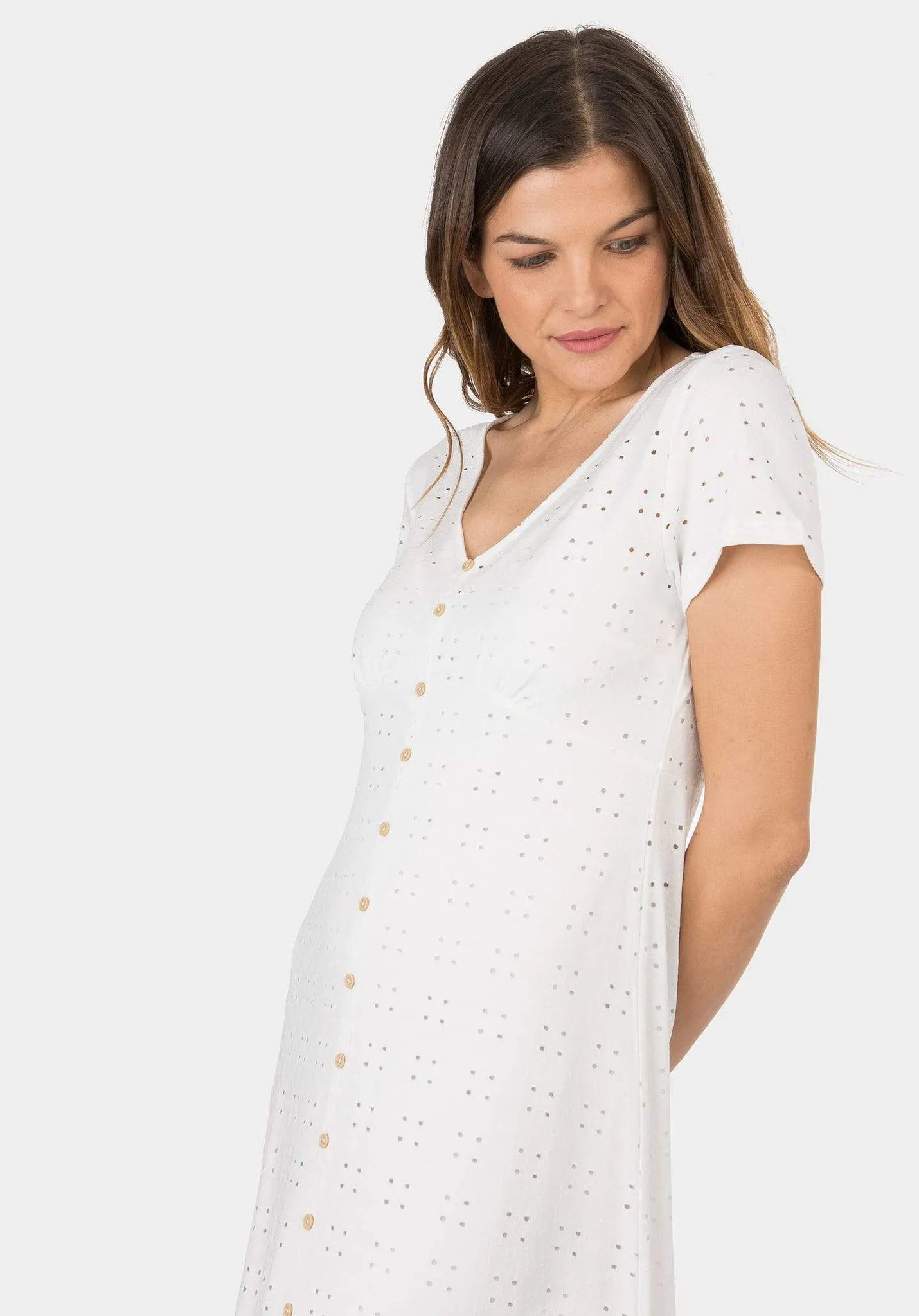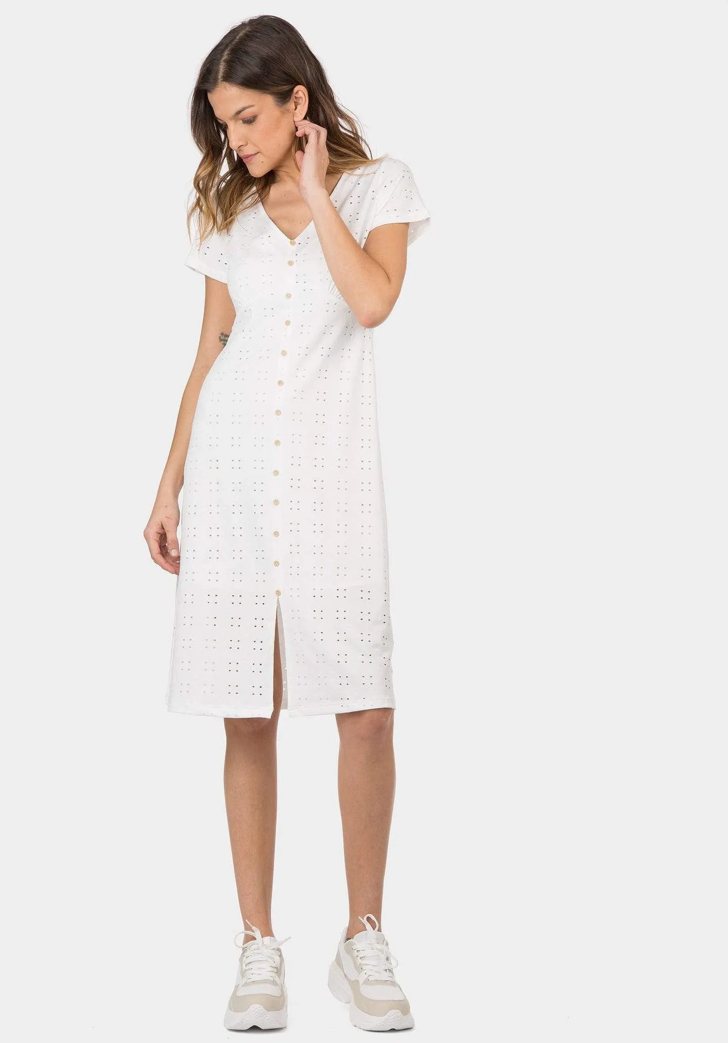 Vestido midi con escote pico y manga corta. Aplicación de botones falsos delanteros.