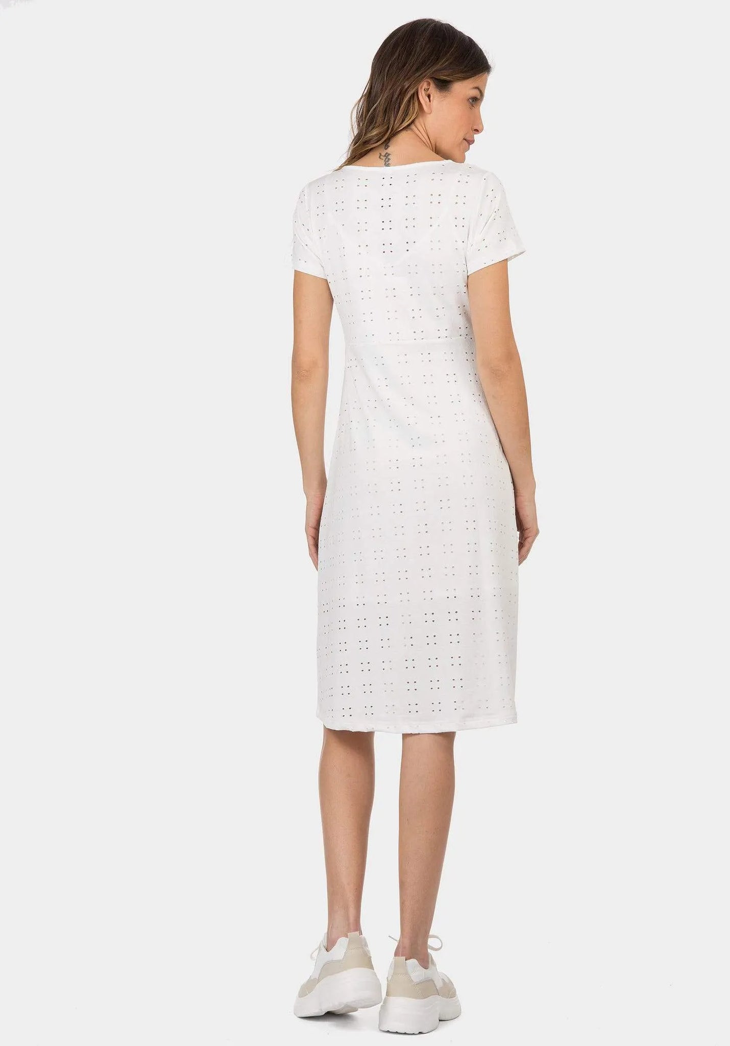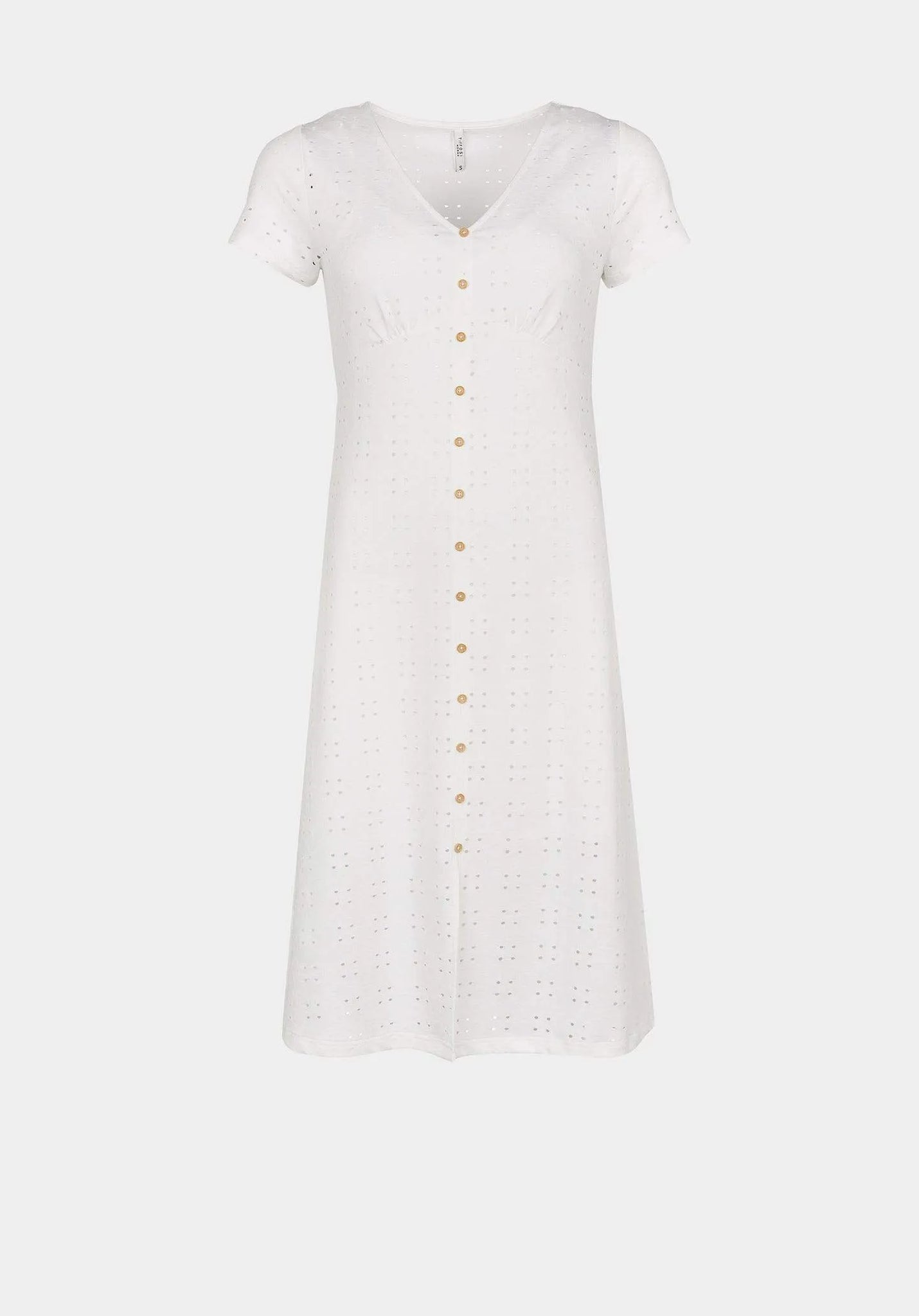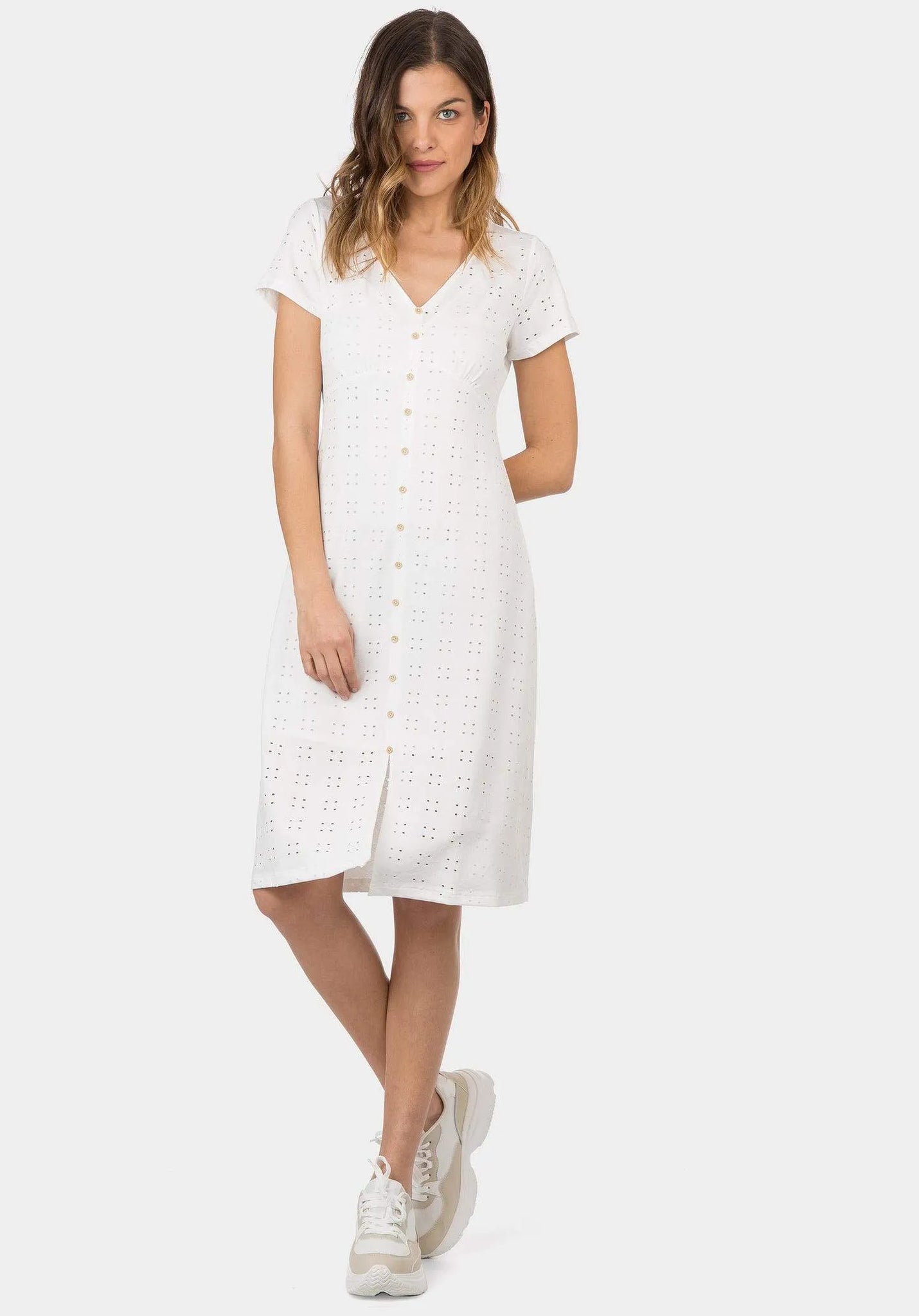 Vestido midi con escote pico y manga corta. Aplicación de botones falsos delanteros.