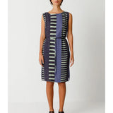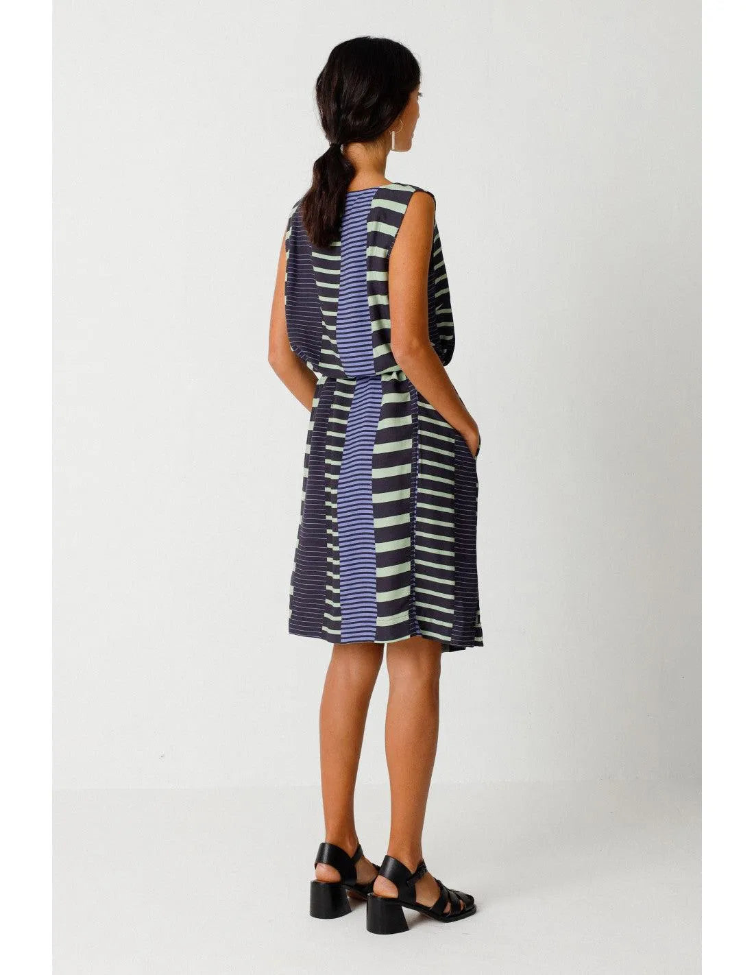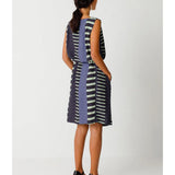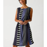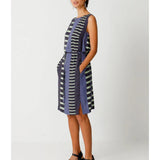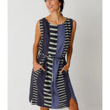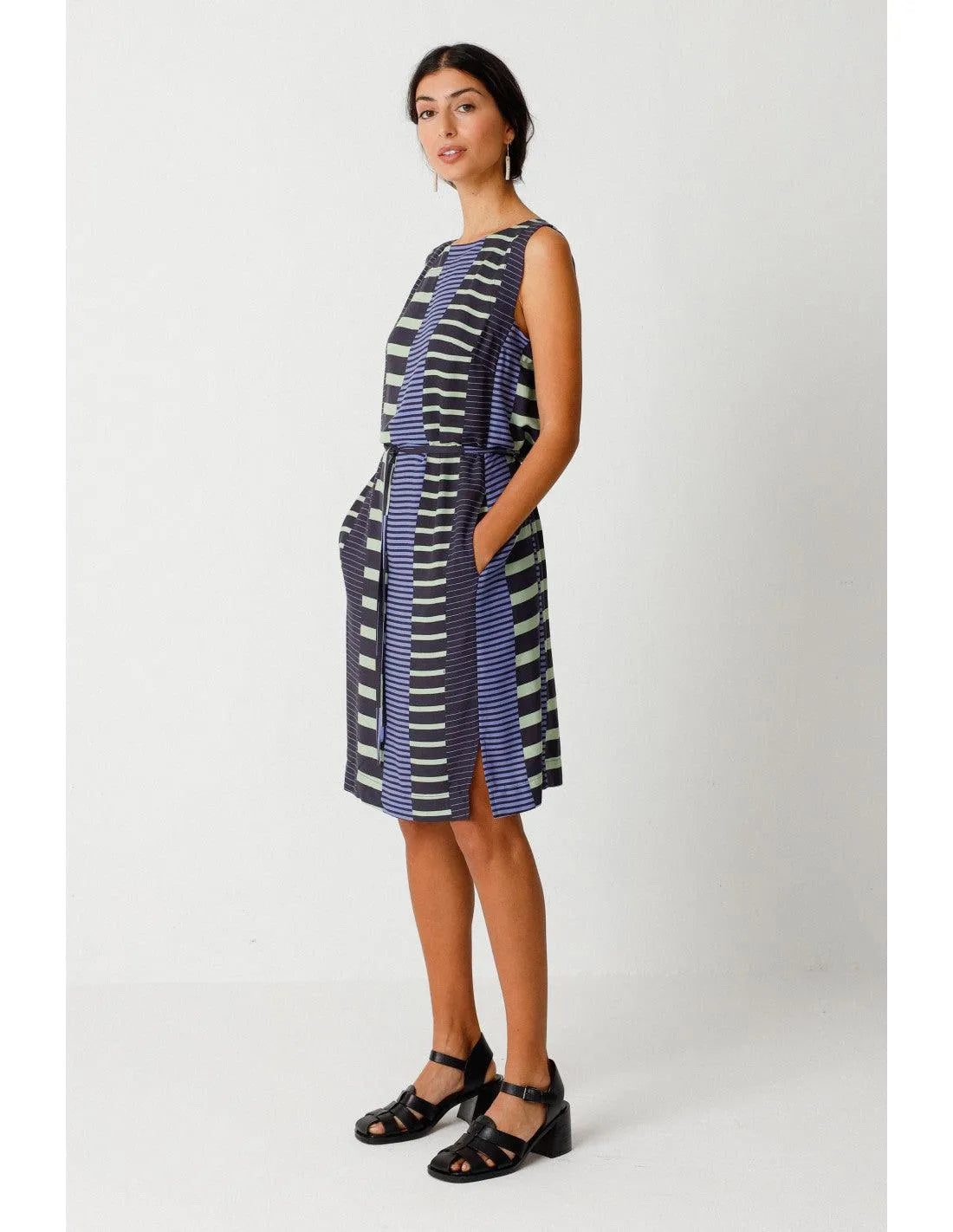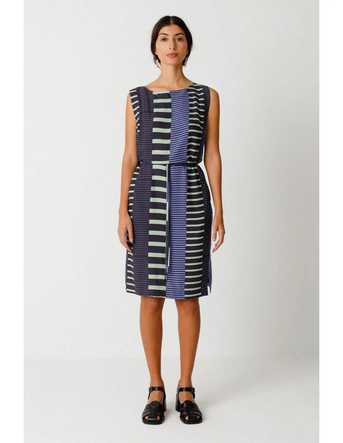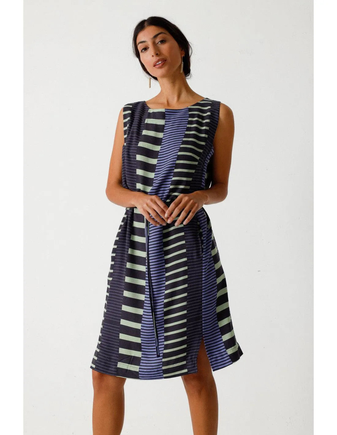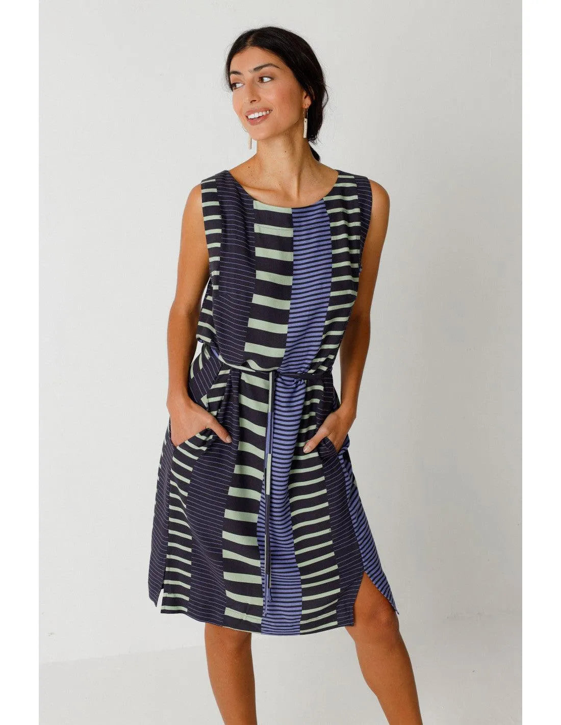 Elegante vestido sin mangas de cuello barco. Largo hasta la rodilla, cinturón anudado y prácticos bolsillos en las costuras laterales. Estampado gráfico.