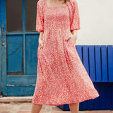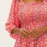 El vestido fruncido Raquel presenta una parte superior cuadrada, fruncida y elástica, una falda acampanada y unas favorecedoras mangas blusón. Diseñado para ofrecer una mayor versatilidad, el modelo Raquel tiene puños elásticos y costuras para poder llevarlo sobre los hombros o sin ellos. Nuestro estampado Rainbow Daisies en rojo suave presenta flores sencillas en blanco roto con colores del arco iris alternados en el centro.