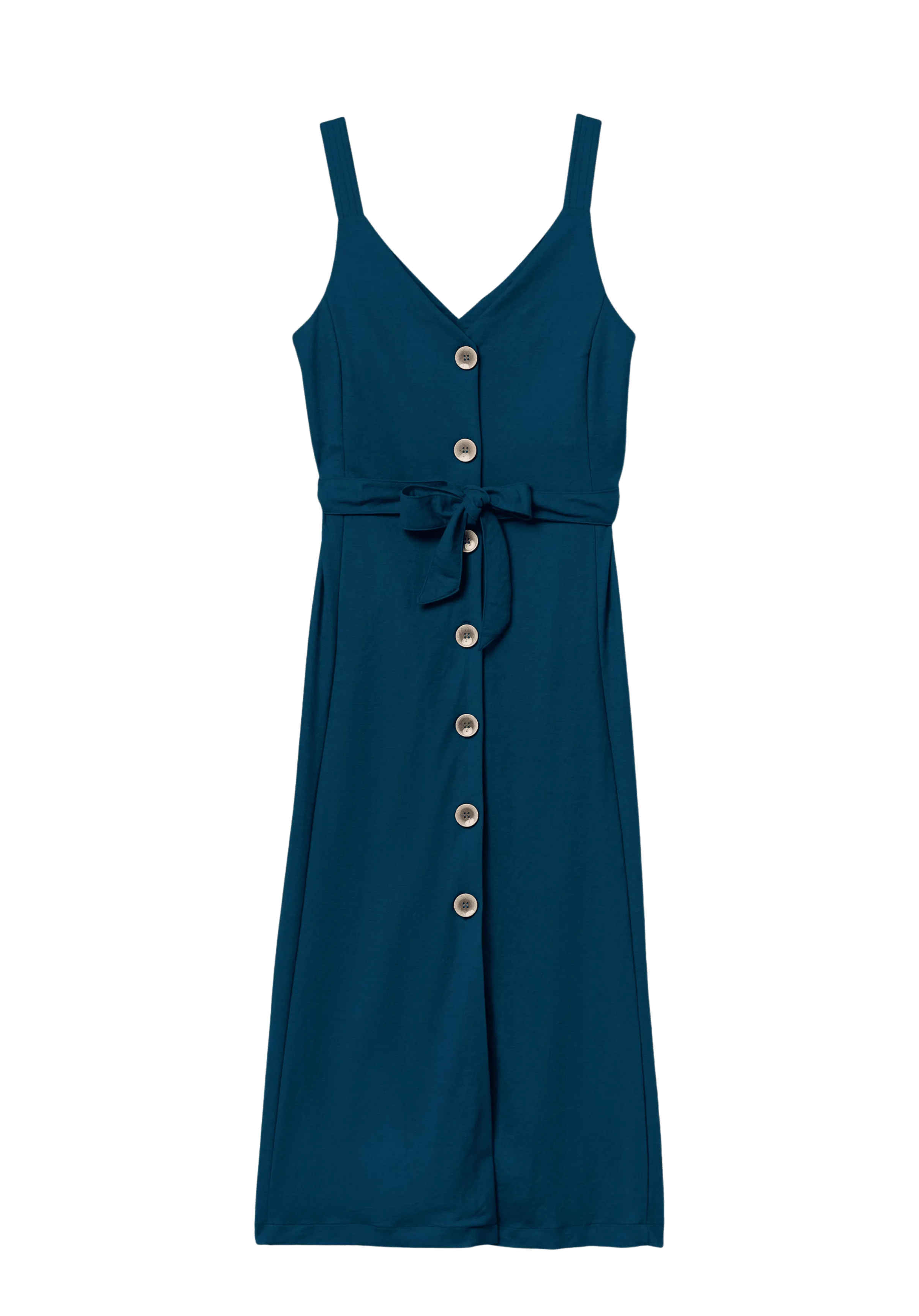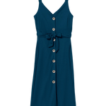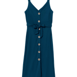 Vestido de escote pico y tirantes. Aplicación de cinturón del mismo tejido. Cierre frontal con botones.