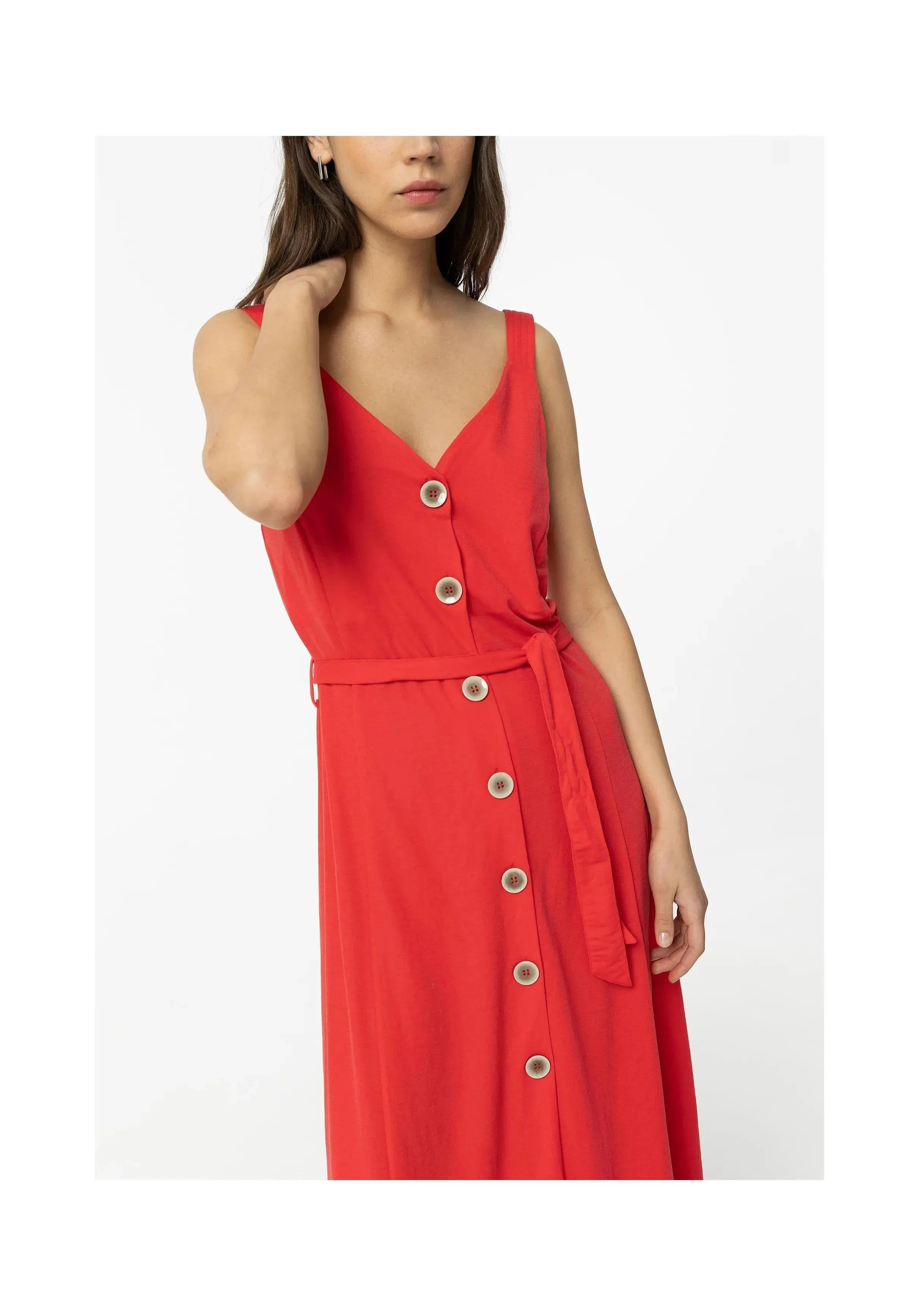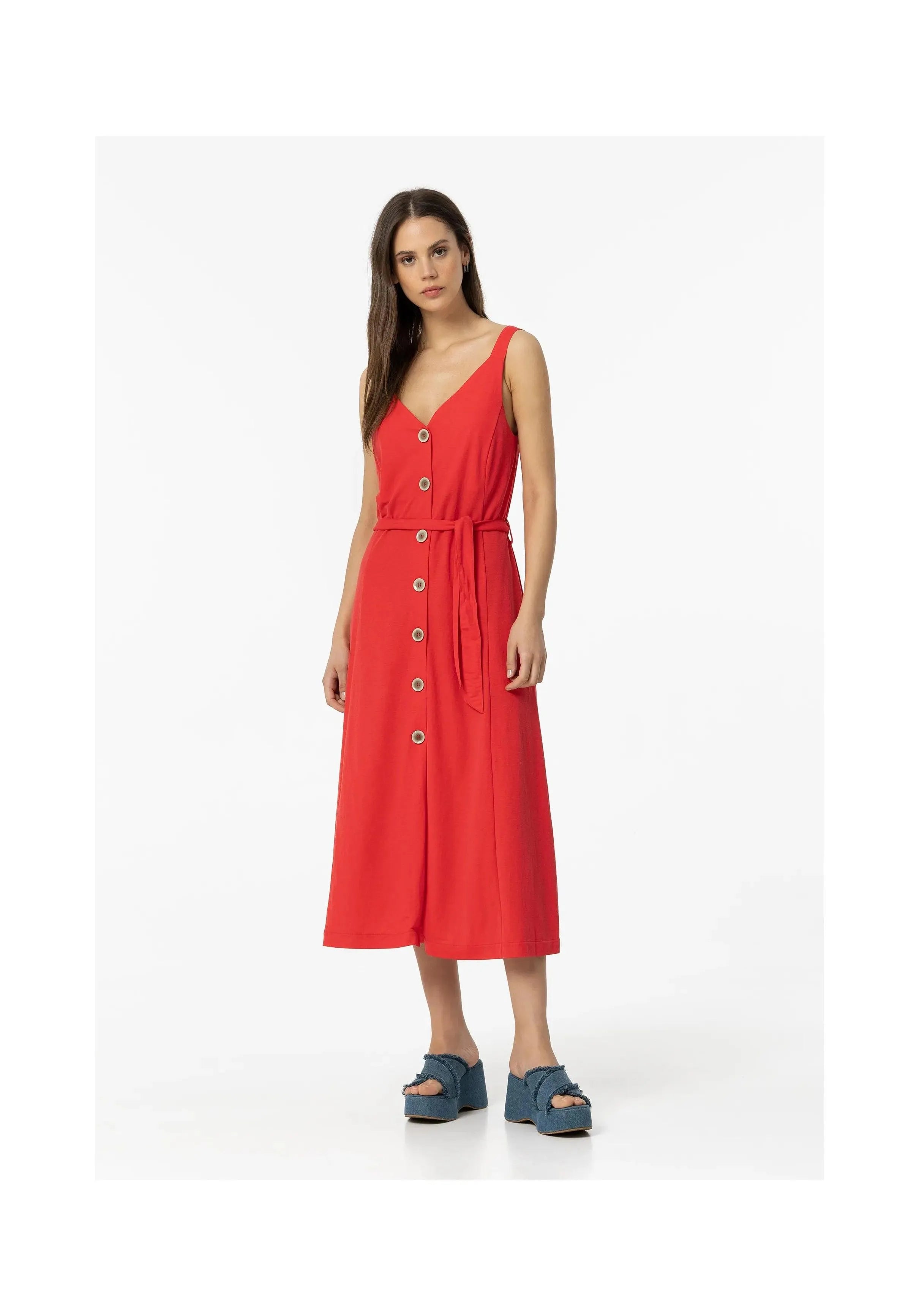 Vestido de escote pico y tirantes. Aplicación de cinturón del mismo tejido. Cierre frontal con botones.