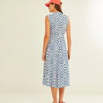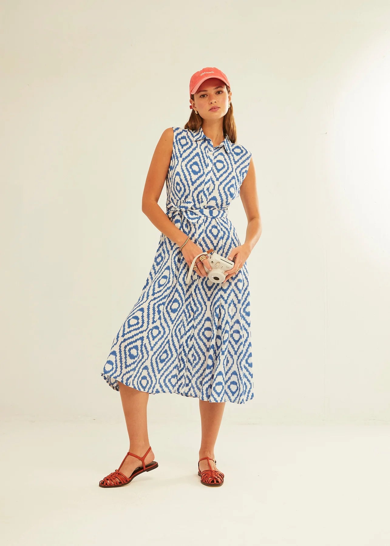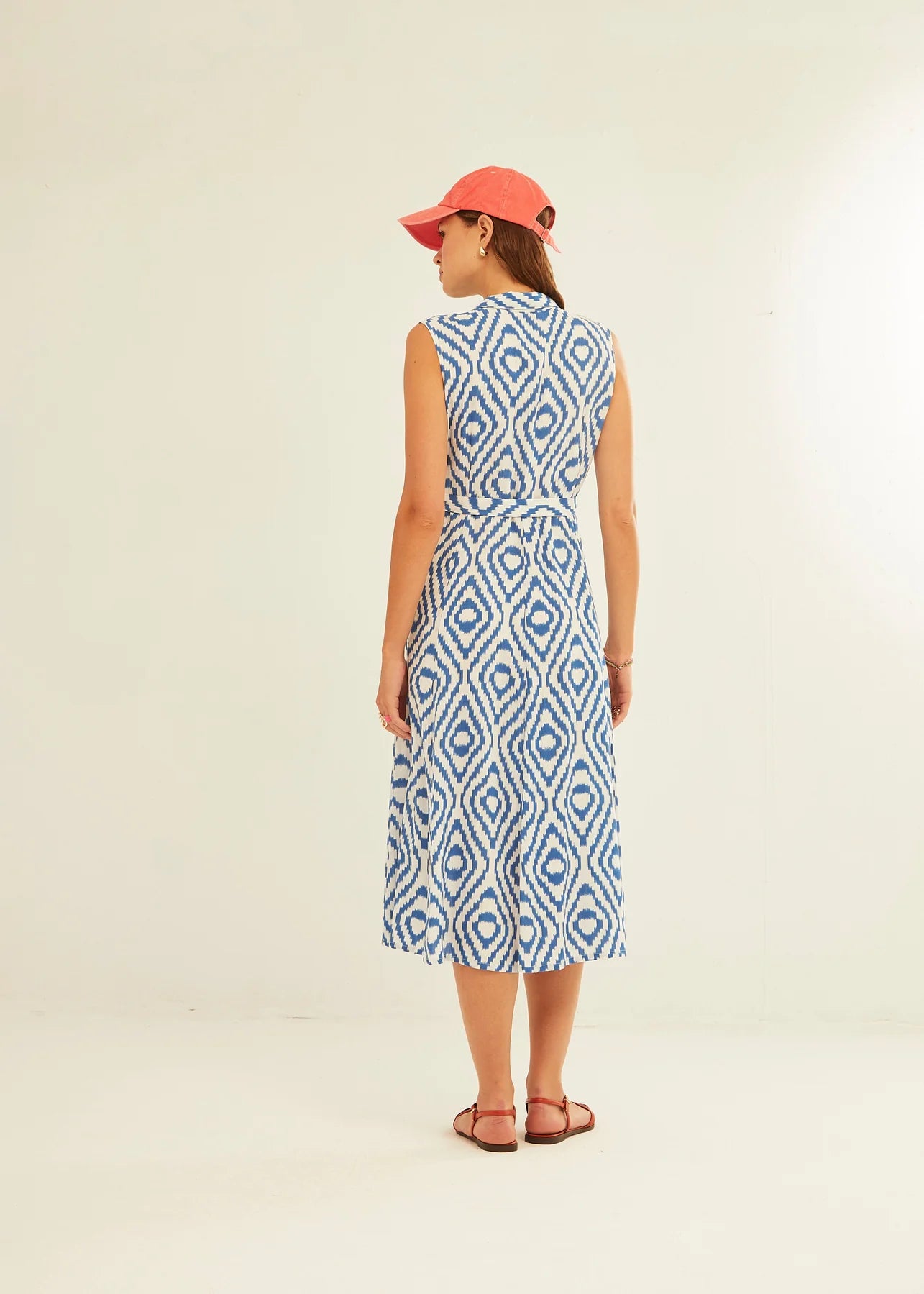 Vestido en estampado Blue Diamonds. Cinturón del mismo tejido y print ajustable. Composición: Polyester 100%.